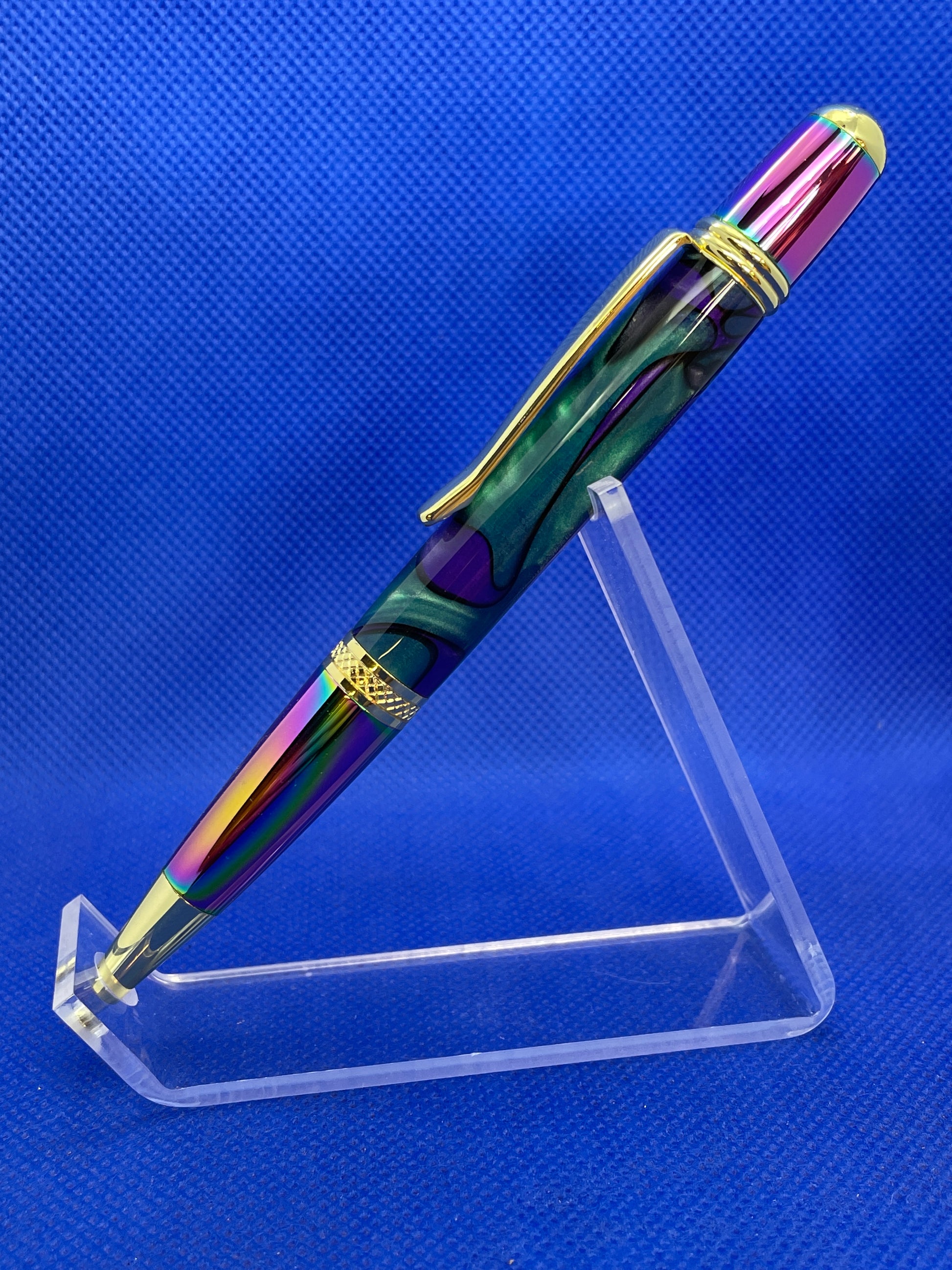This stunning Monarch ballpoint pen features and multi-coloured Aura and gold trim with a "Purple Dragon" acrylic acetate body. It uses standard Parker style refills.