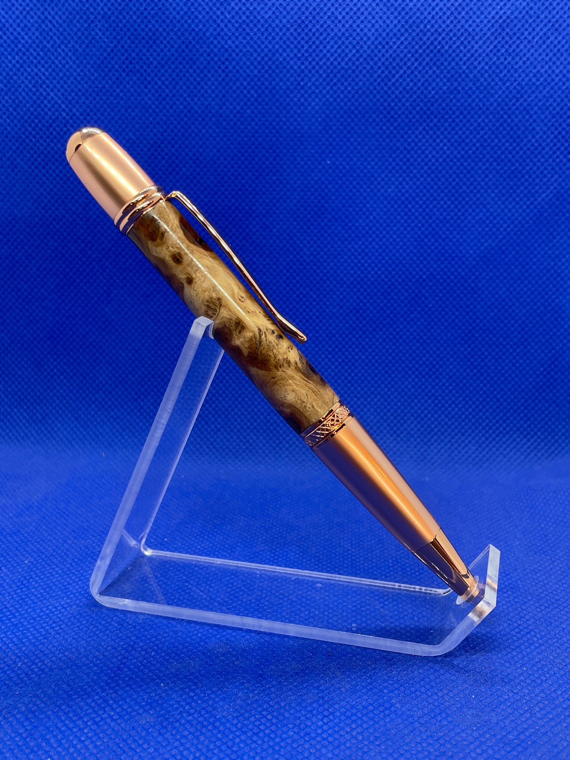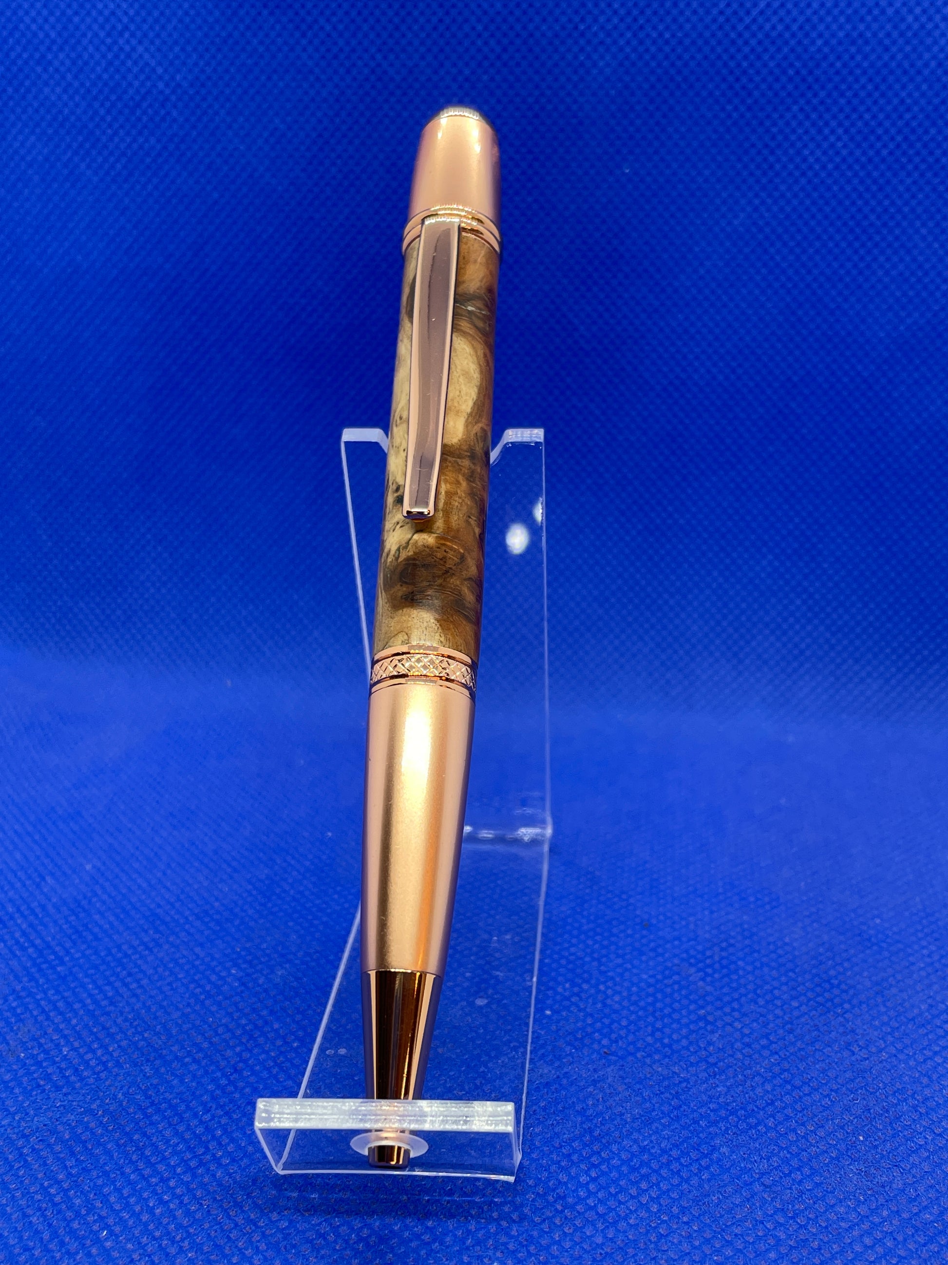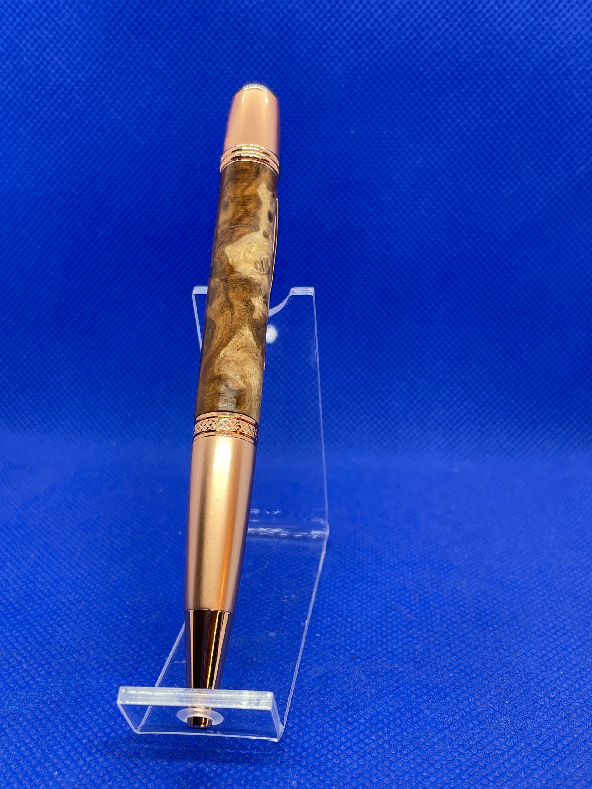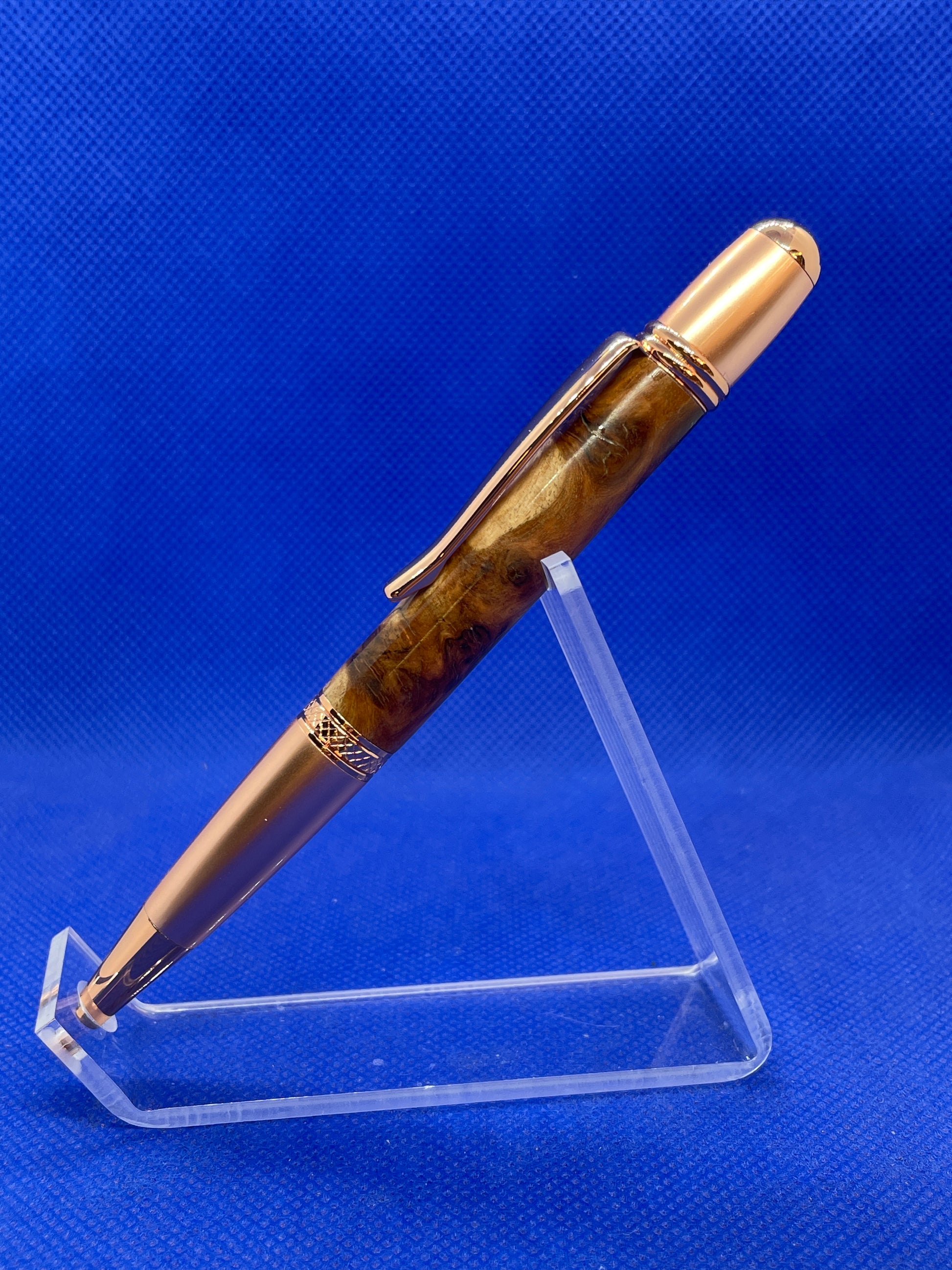 This stunning Monarch ballpoint pen features copper metalwork with an Australian Red Coolabah burl body. It uses standard Parker style refills.