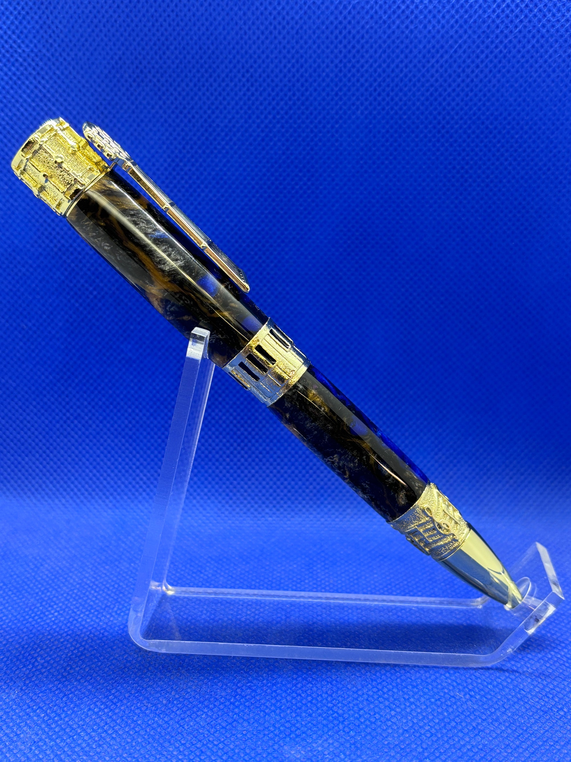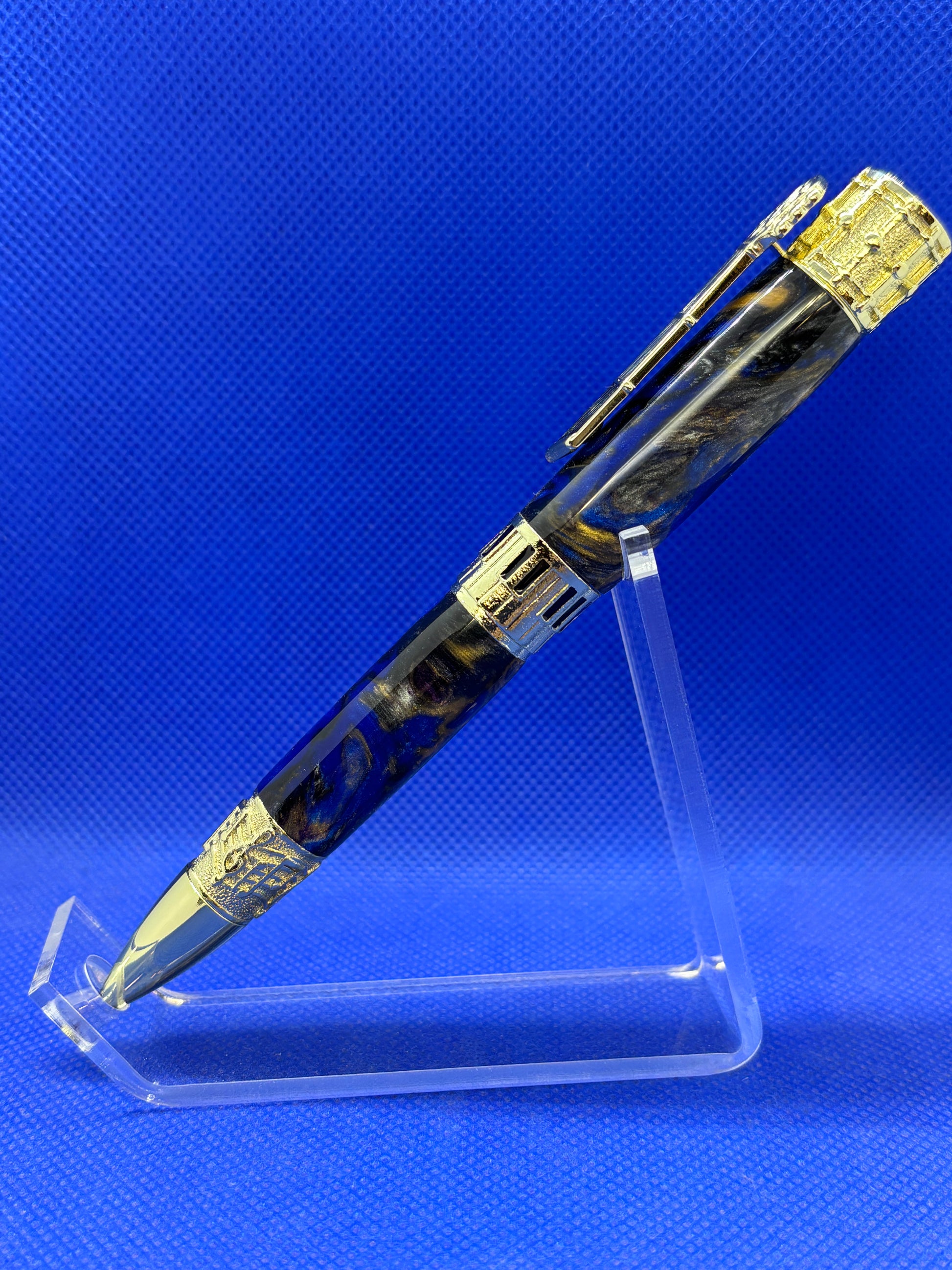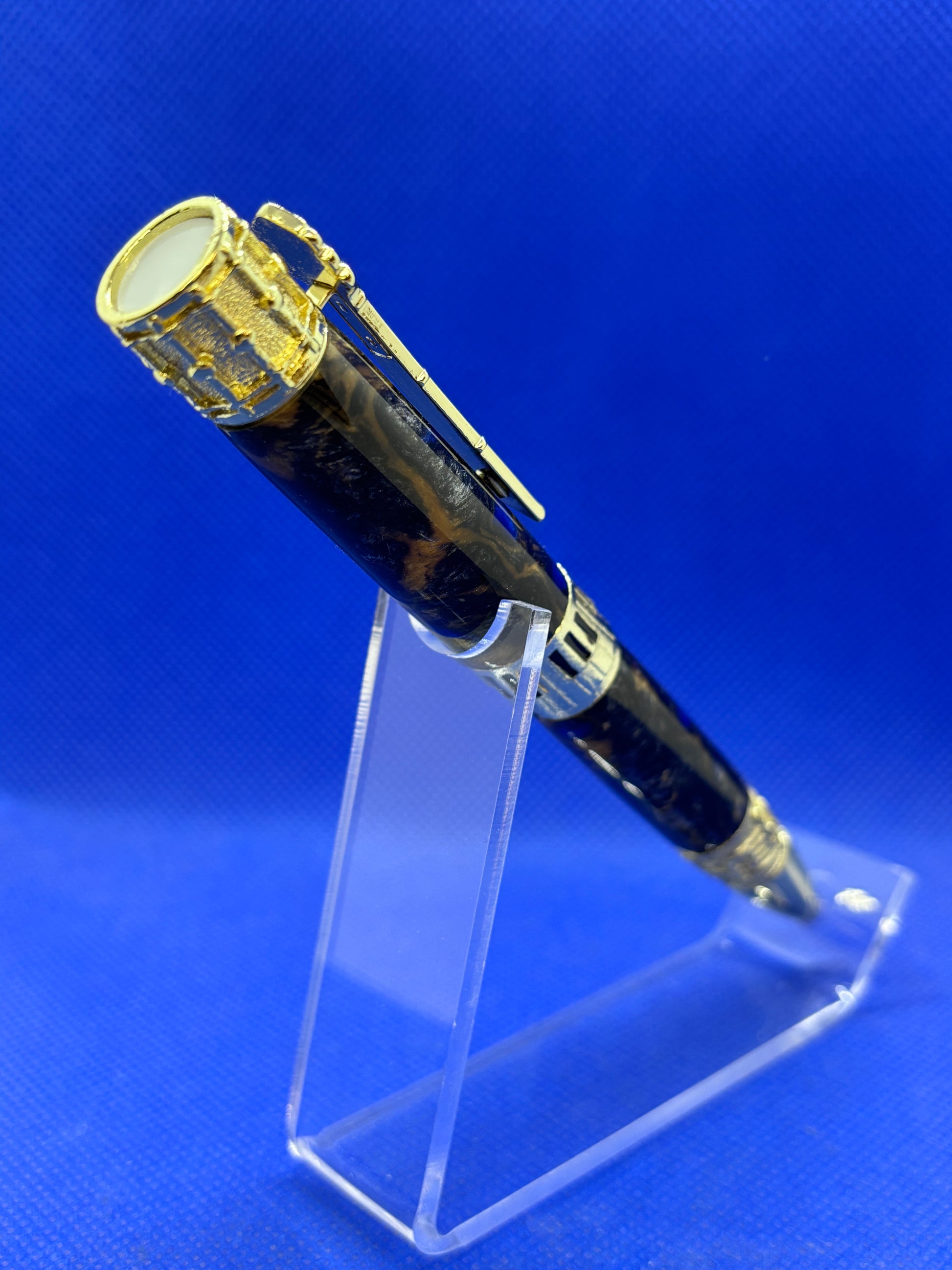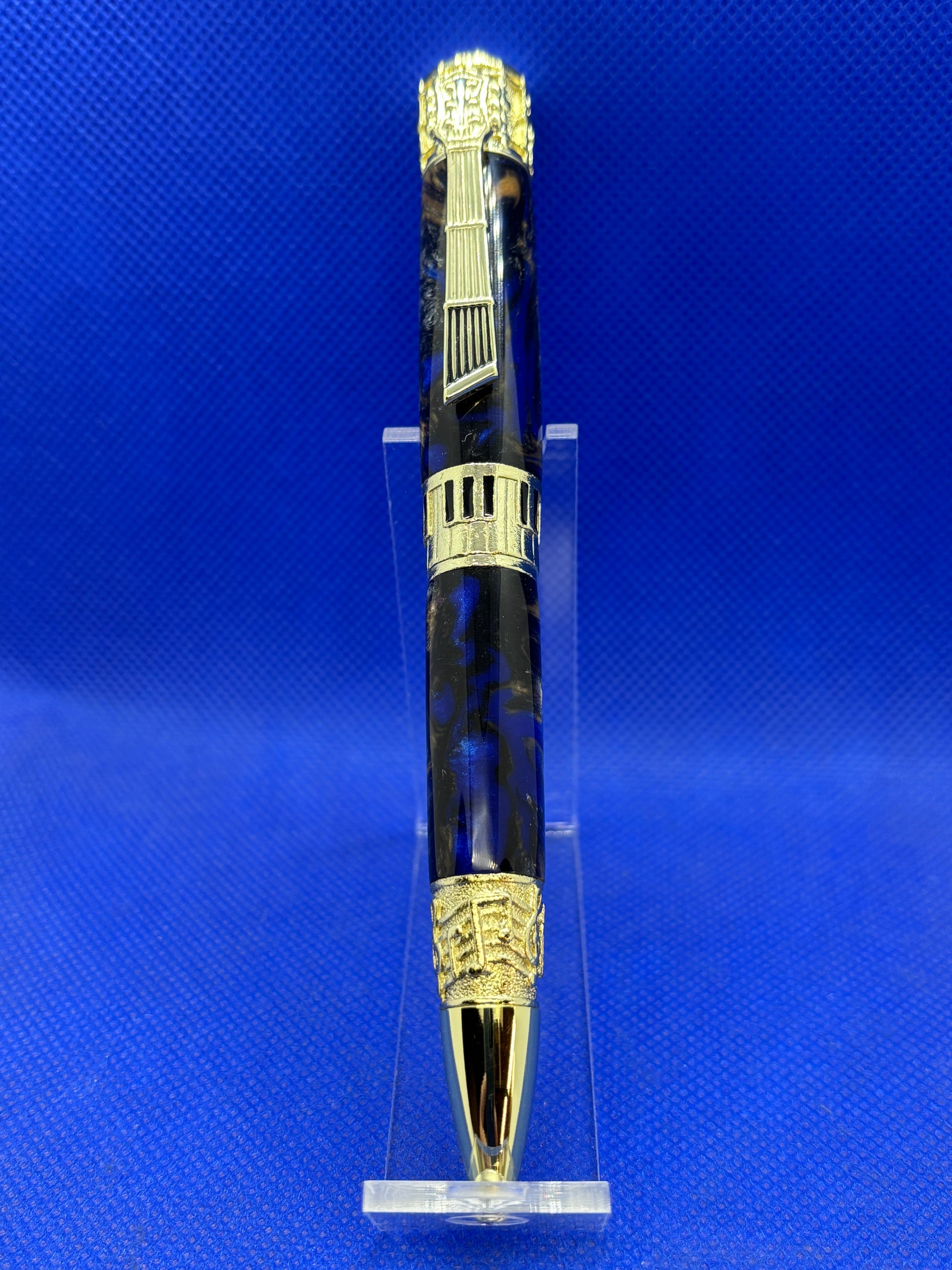 This music themed pen features a "Sapphire and Gold" resin body and gold metalwork.The clip is a guitar neck, the finial is a drum, and there are keyboard and music motifs on the centre band and nib section. This is a wonderful piece for a music enthusiast. This pen uses Parker style refills.