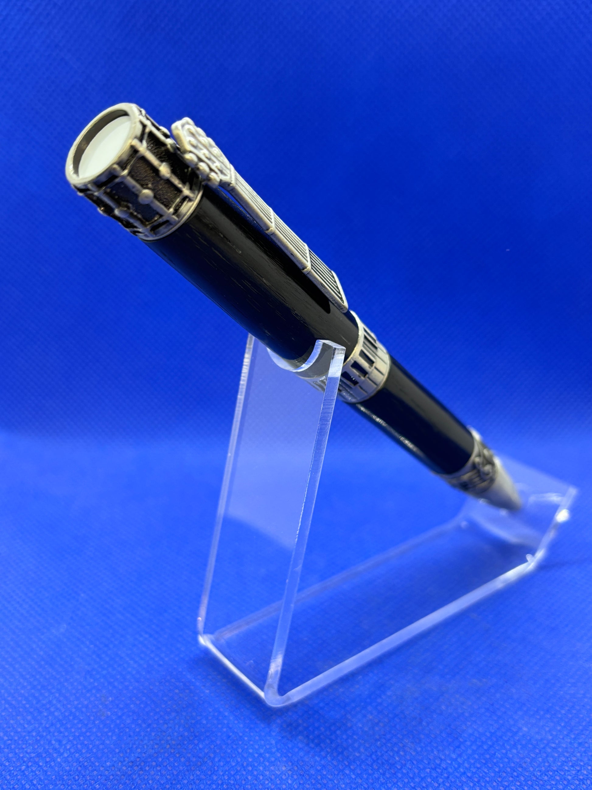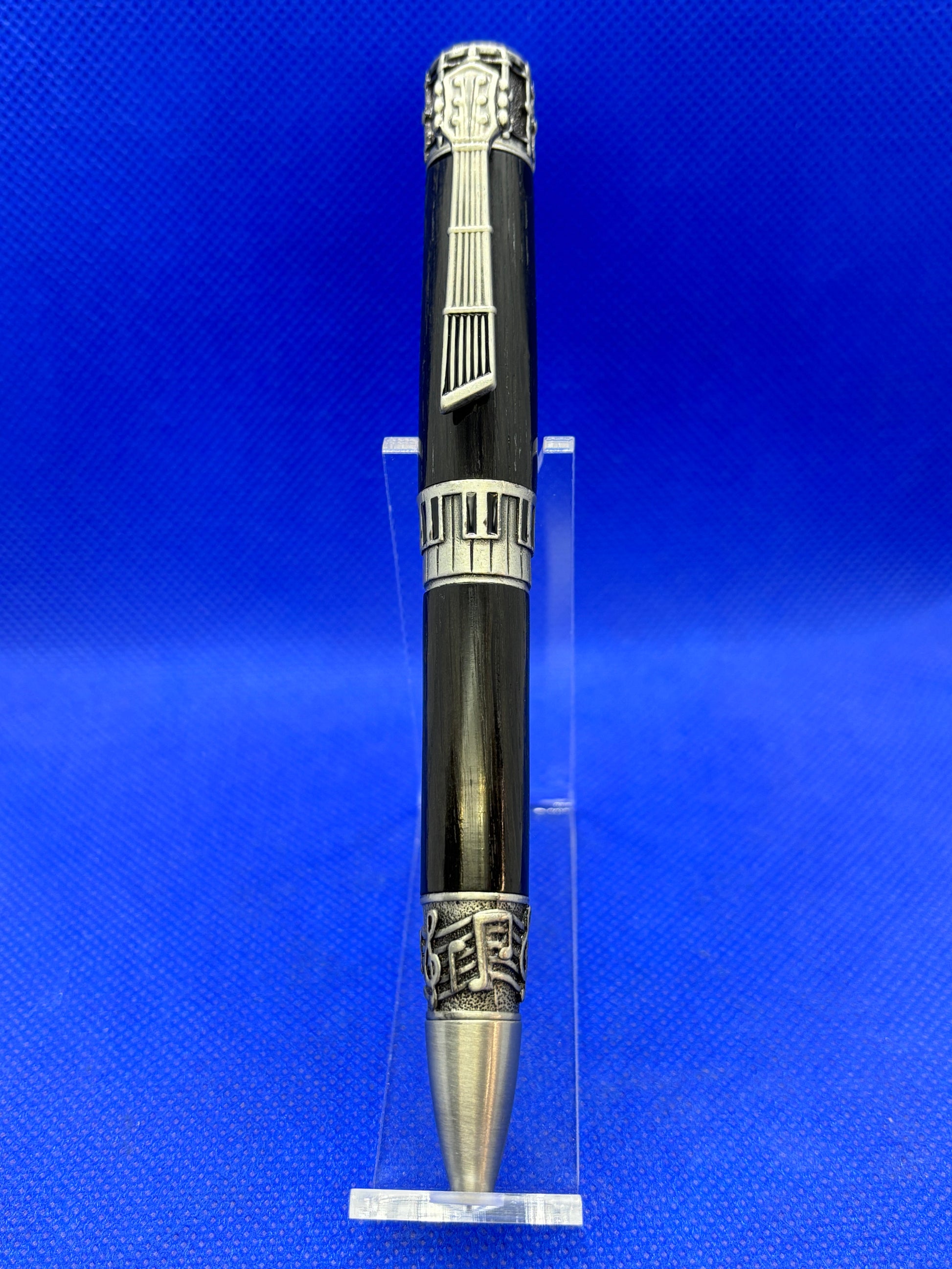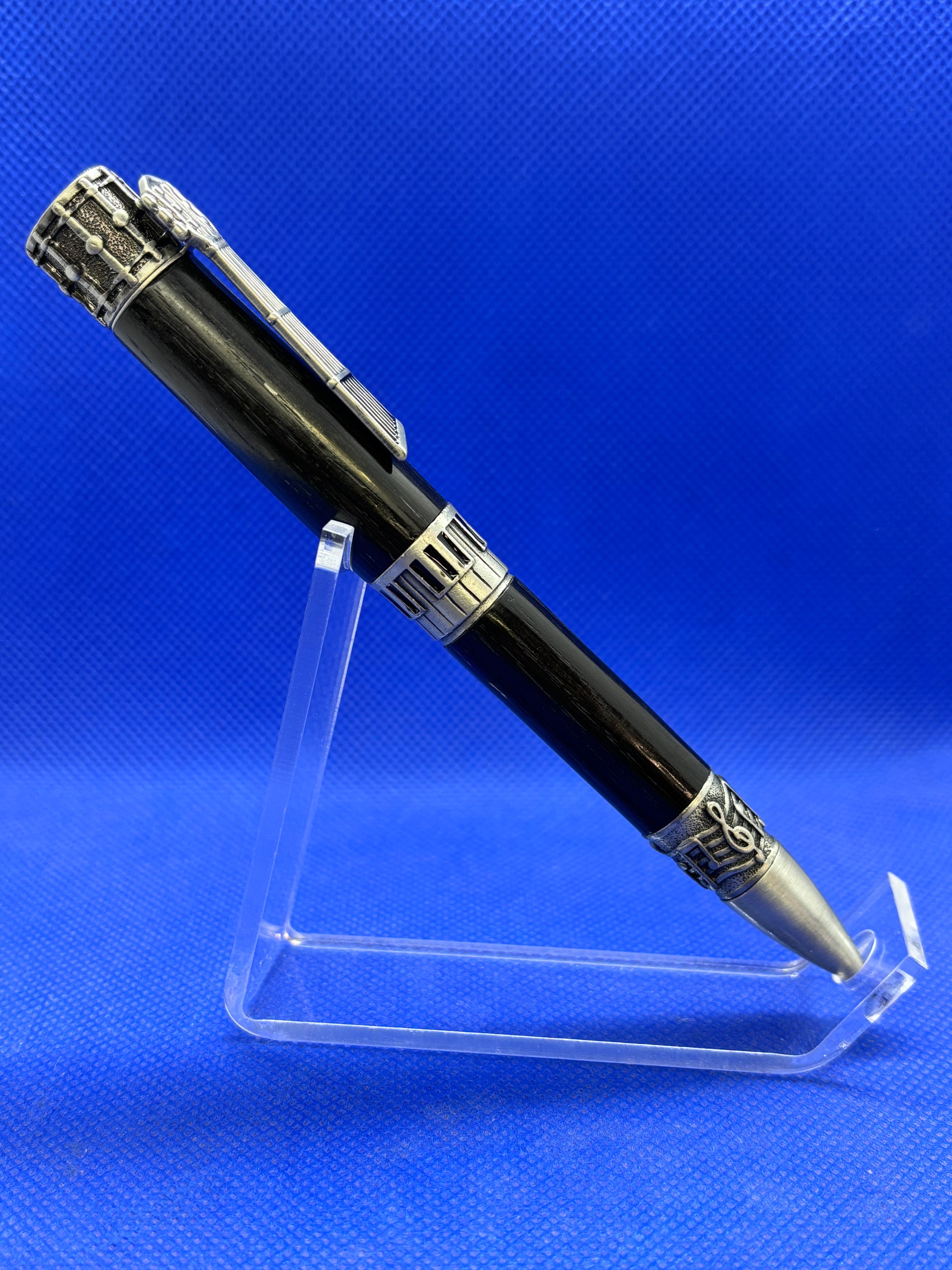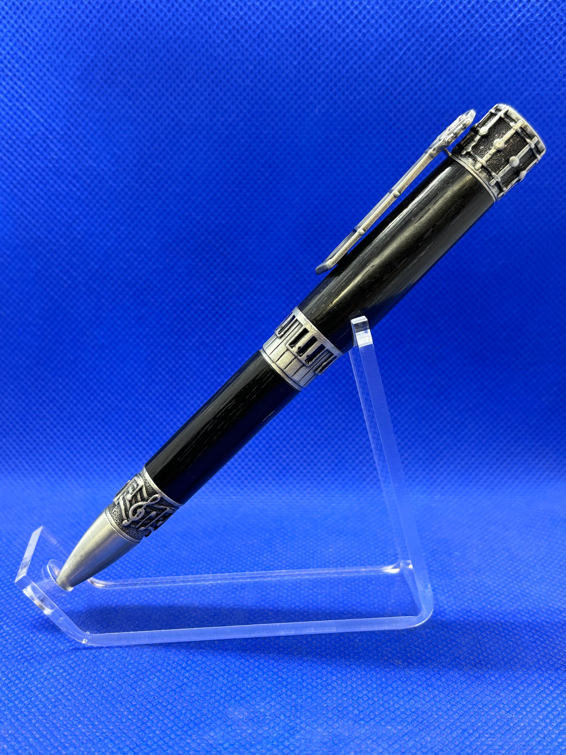 This music themed pen features a 5400 year old Ukrainian Bog Oak body and Antique Pewter metalwork. The bog oak comes from a tree that has been buried in the mud of a swamp for over 5000 years, and the pen pen comes with a certificate of radio carbon dating from Laval University to verify its age. The clip of the pen is a guitar neck, the finial is a drum, and there are keyboard and music motifs on the centre band and nib section. This is a wonderful piece for a music enthusiast. This pen uses Parker style refills.