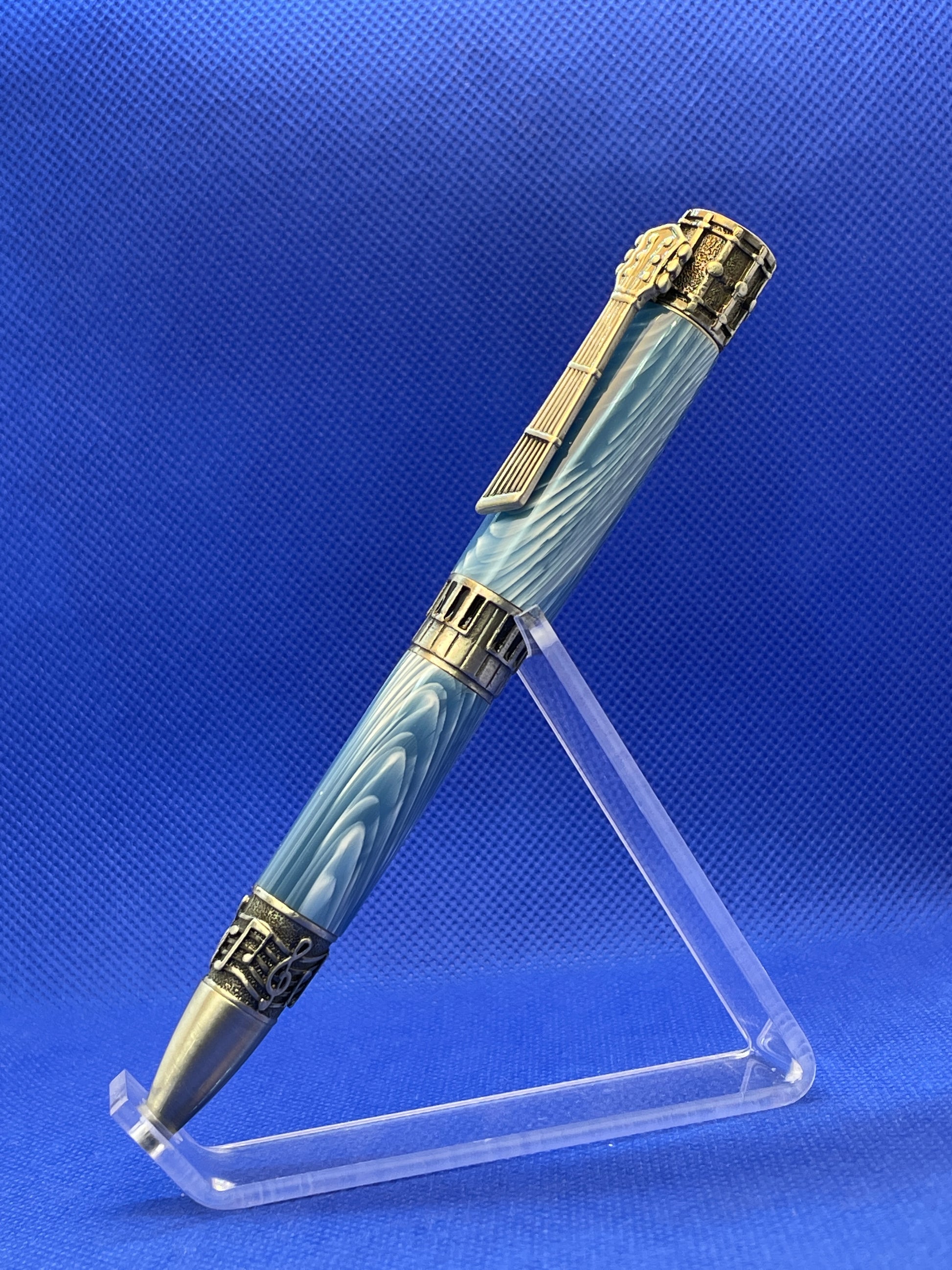 This music themed pen features a "Maritime Blue" poly resin body and antique pewter metalwork.