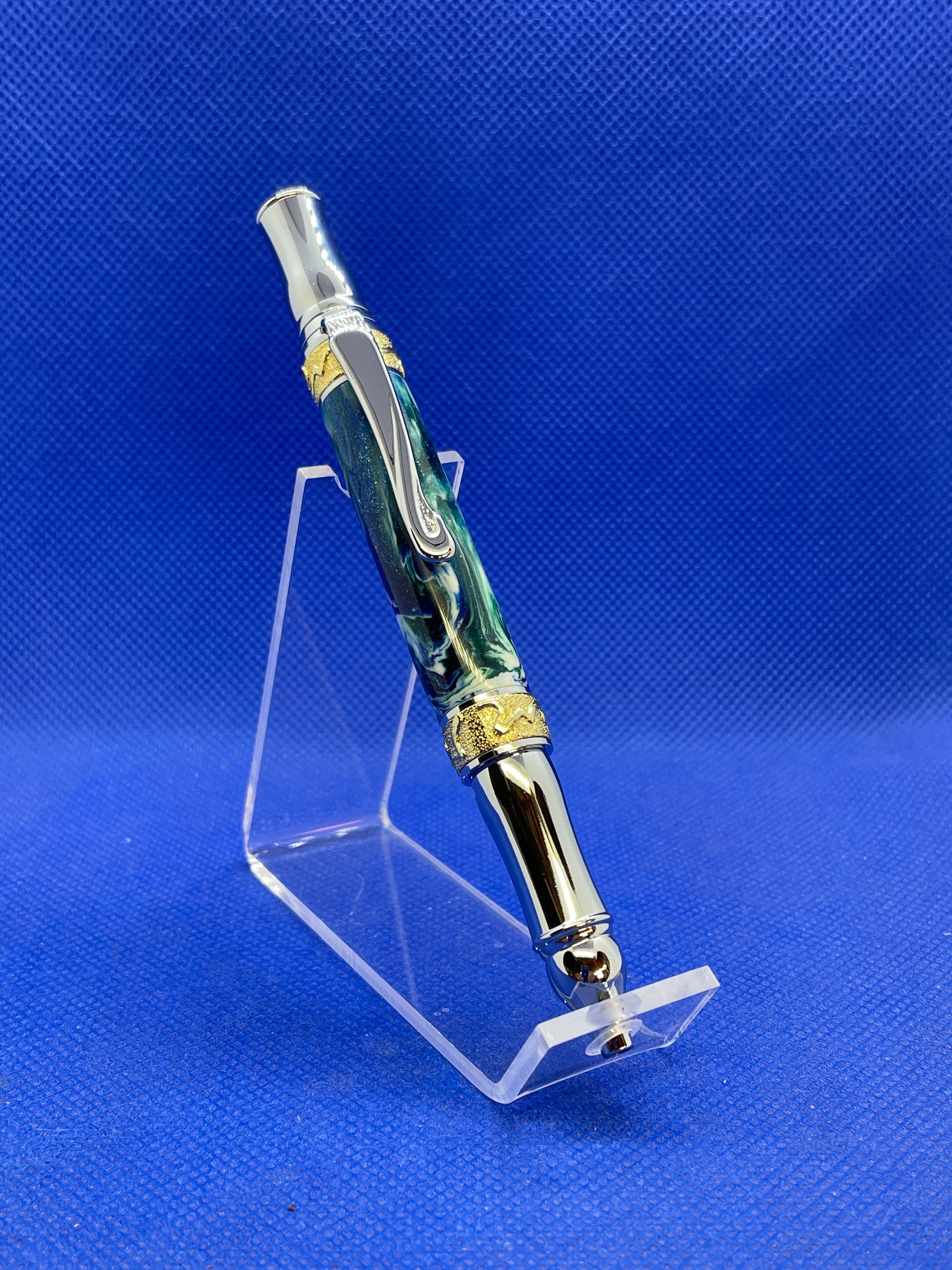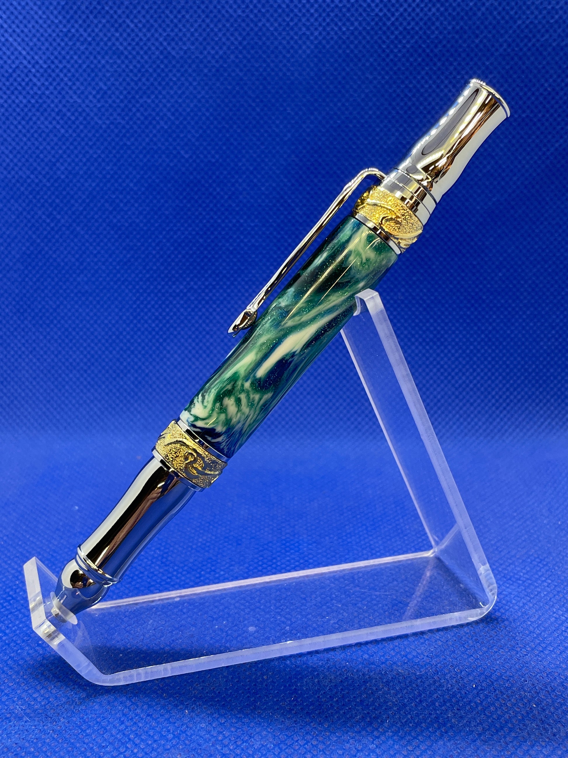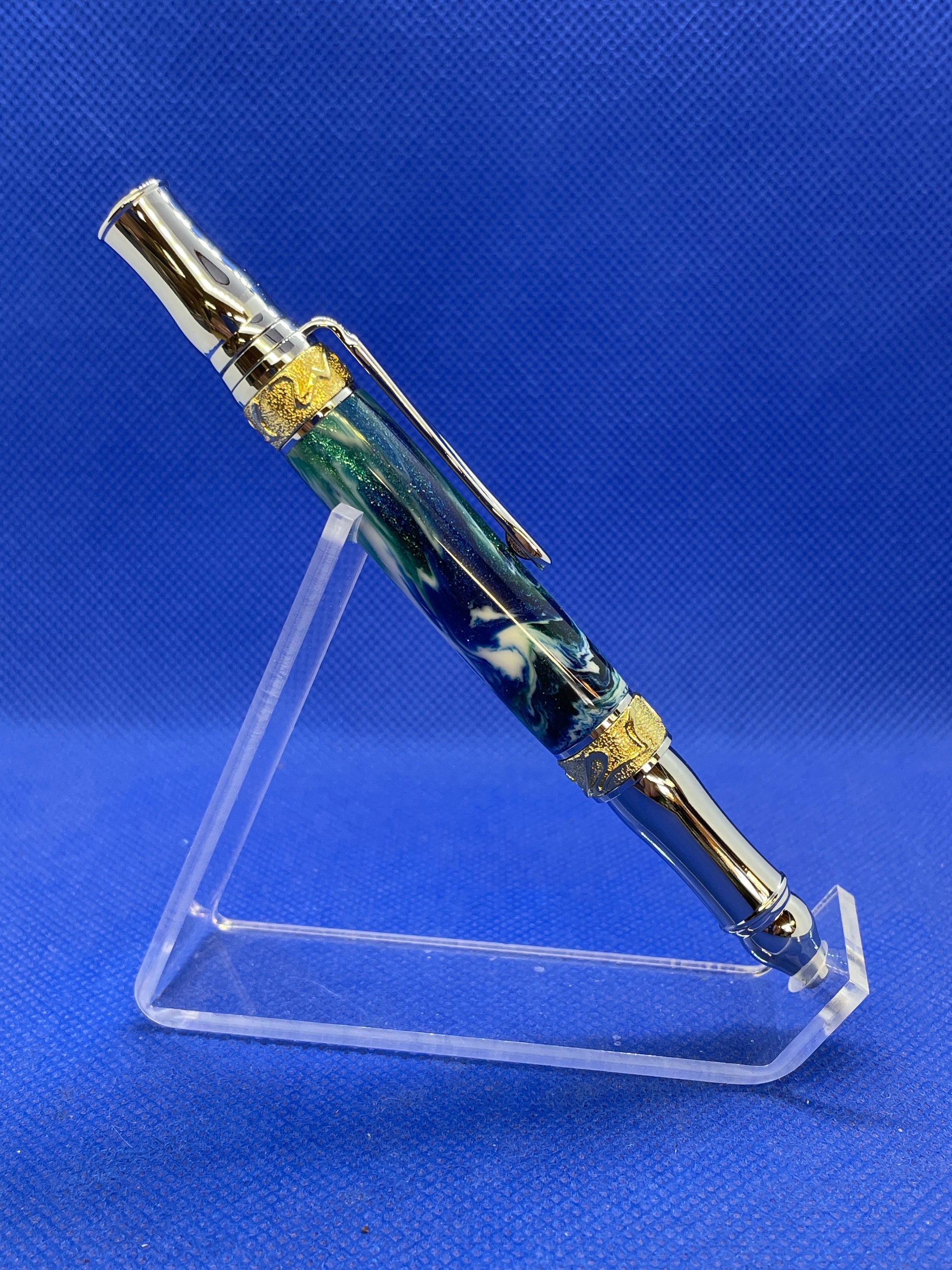 This stunning pen features gold trim and bright chrome fittings. The body is made from DiamondCast "Satellite" urethane that is embedded with real diamond flakes. The combination of the bright metalwork and the diamonds is spectacular and this pen is a real showpiece. This pen uses standard Parker style refills.