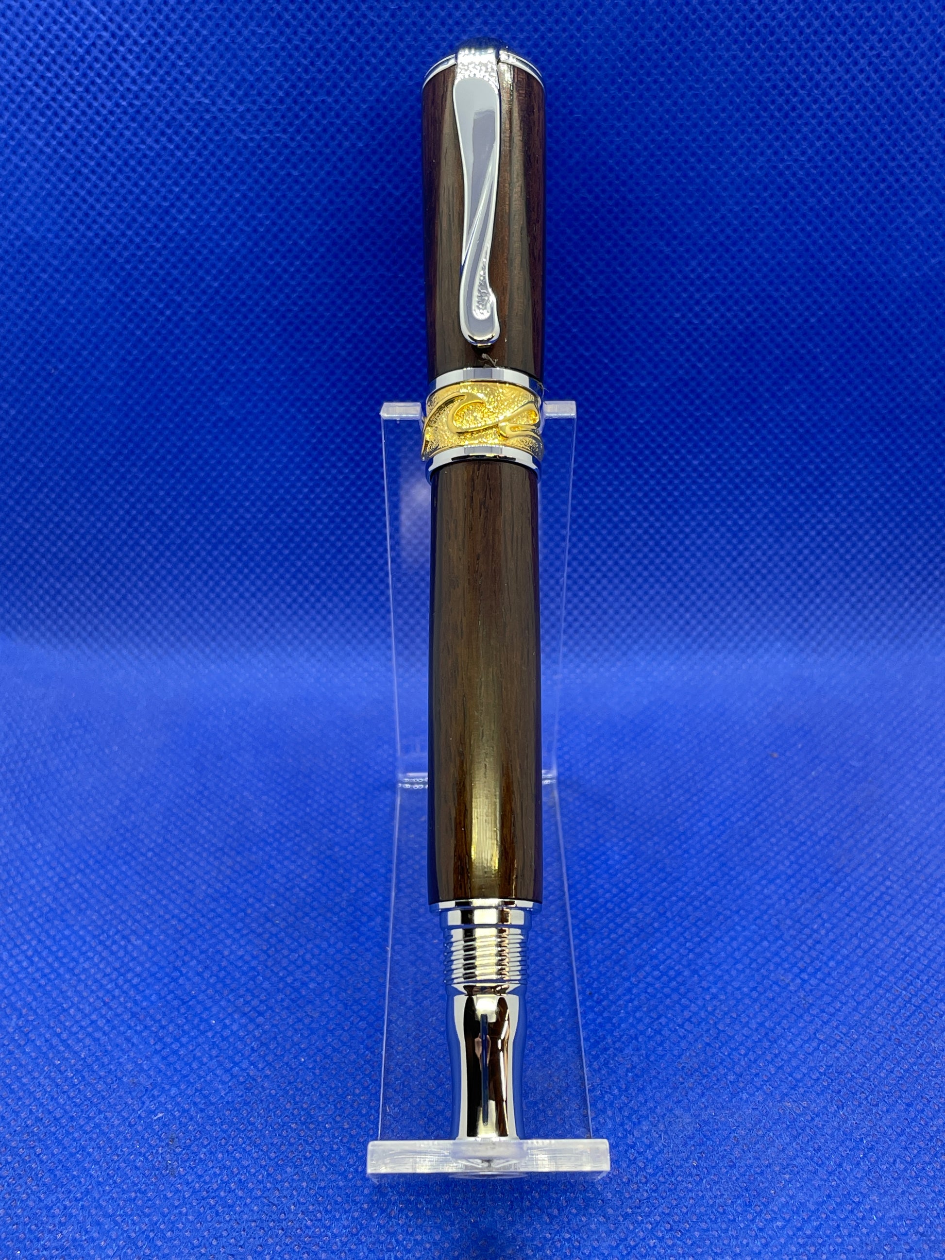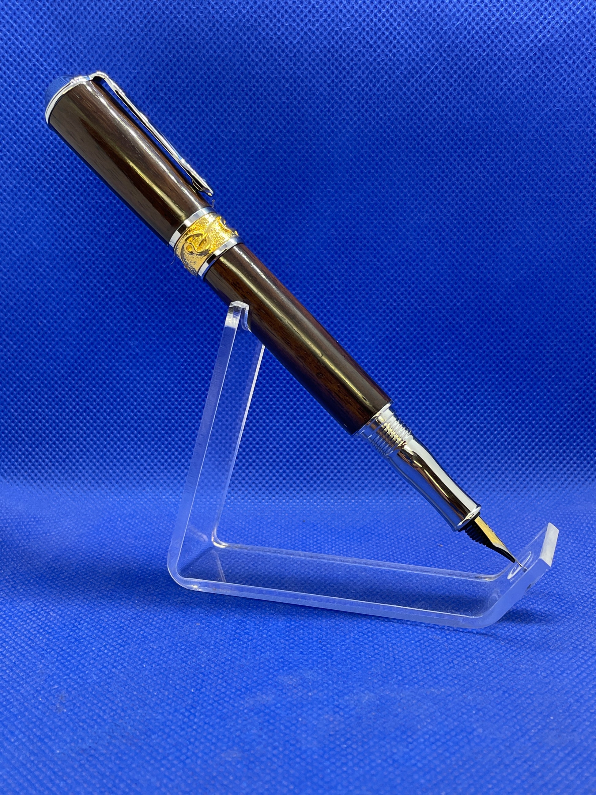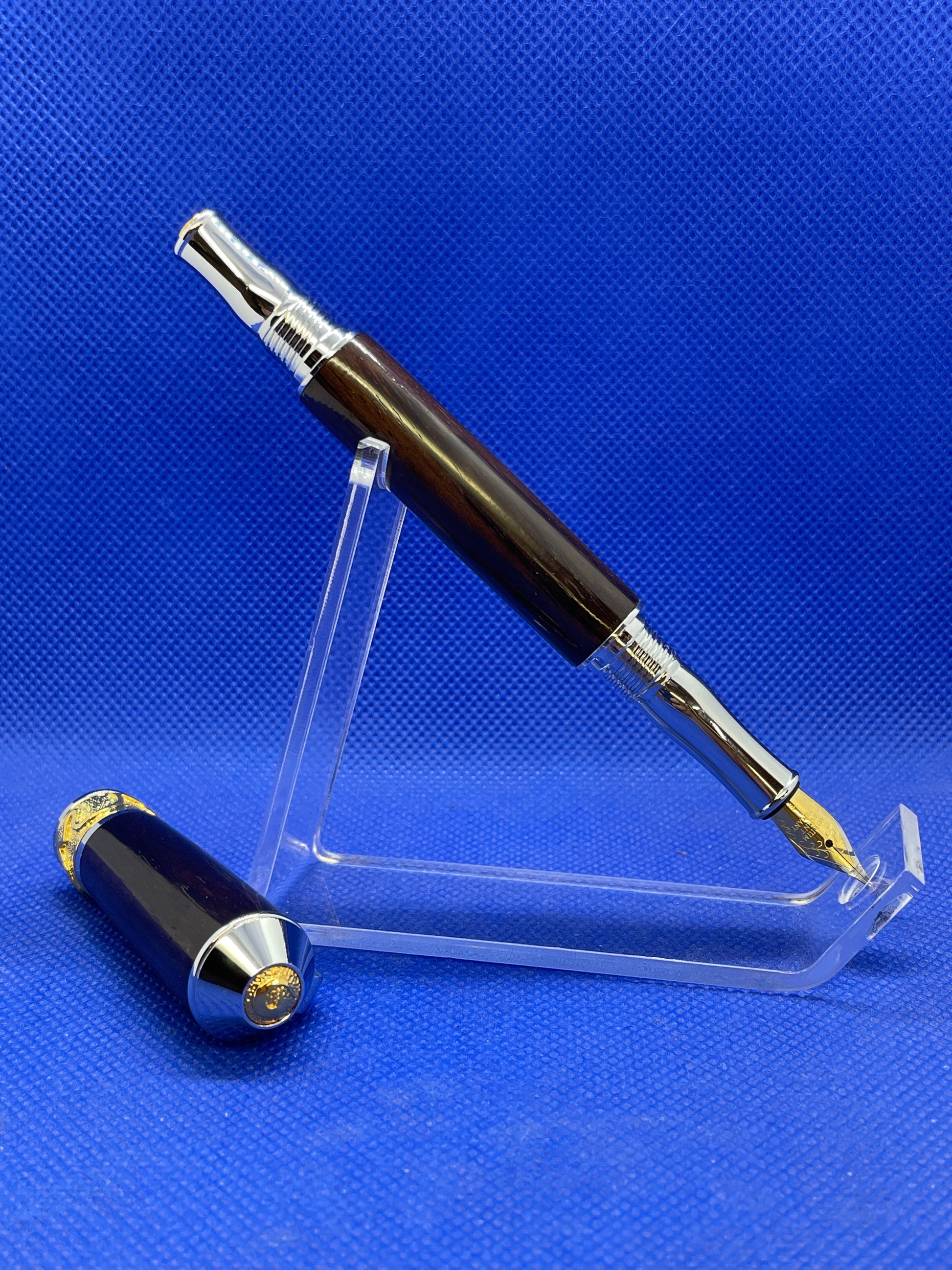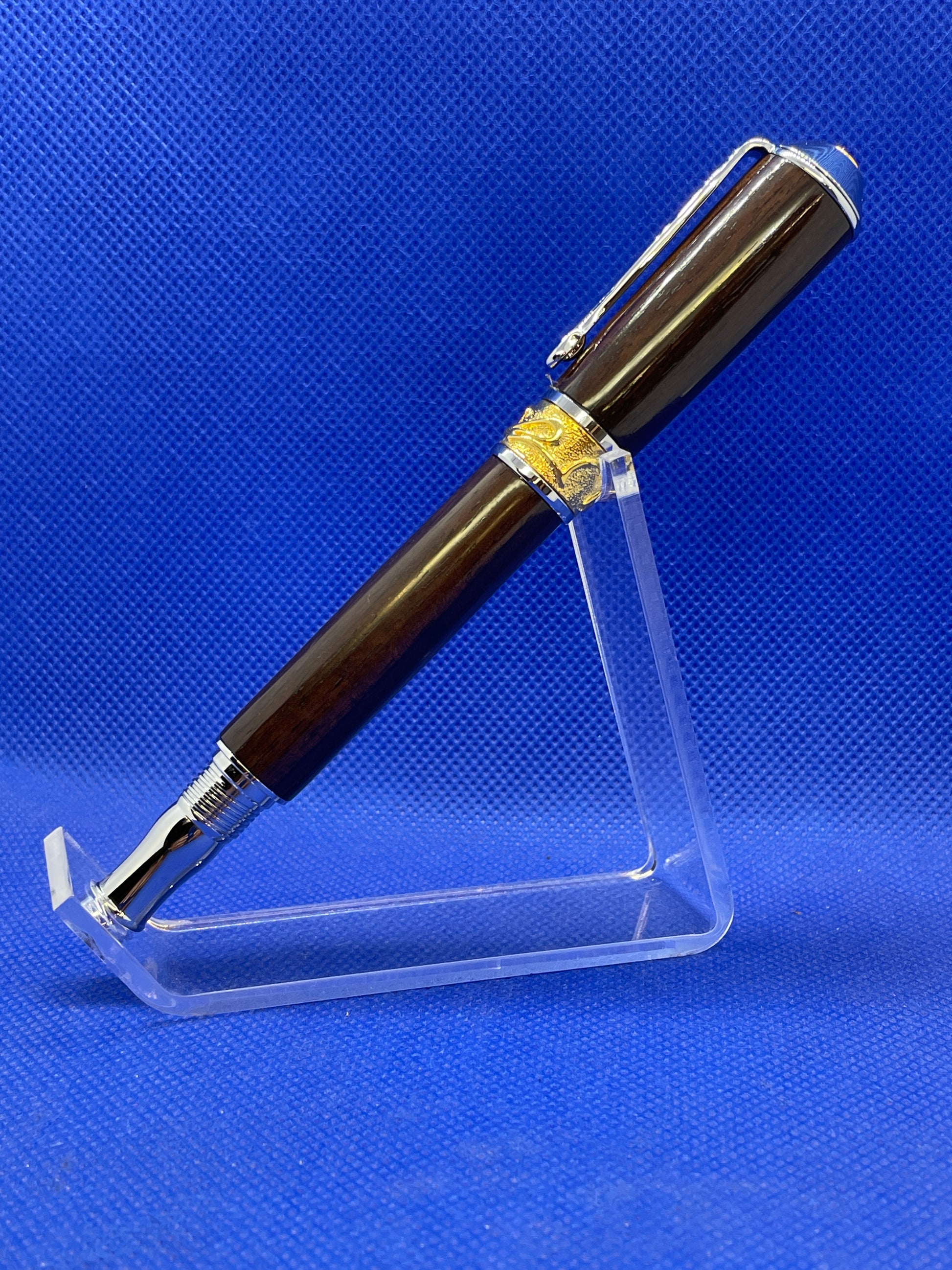 This premium quality fountain pen features Art Nouveau styling with 22 karat gold and chrome trim and a rich African Wenge wood body. This is a pen to be treasured for a lifetime. It comes with an ink pump for use with bottled ink and this pen will also fit universal style ink cartridges.