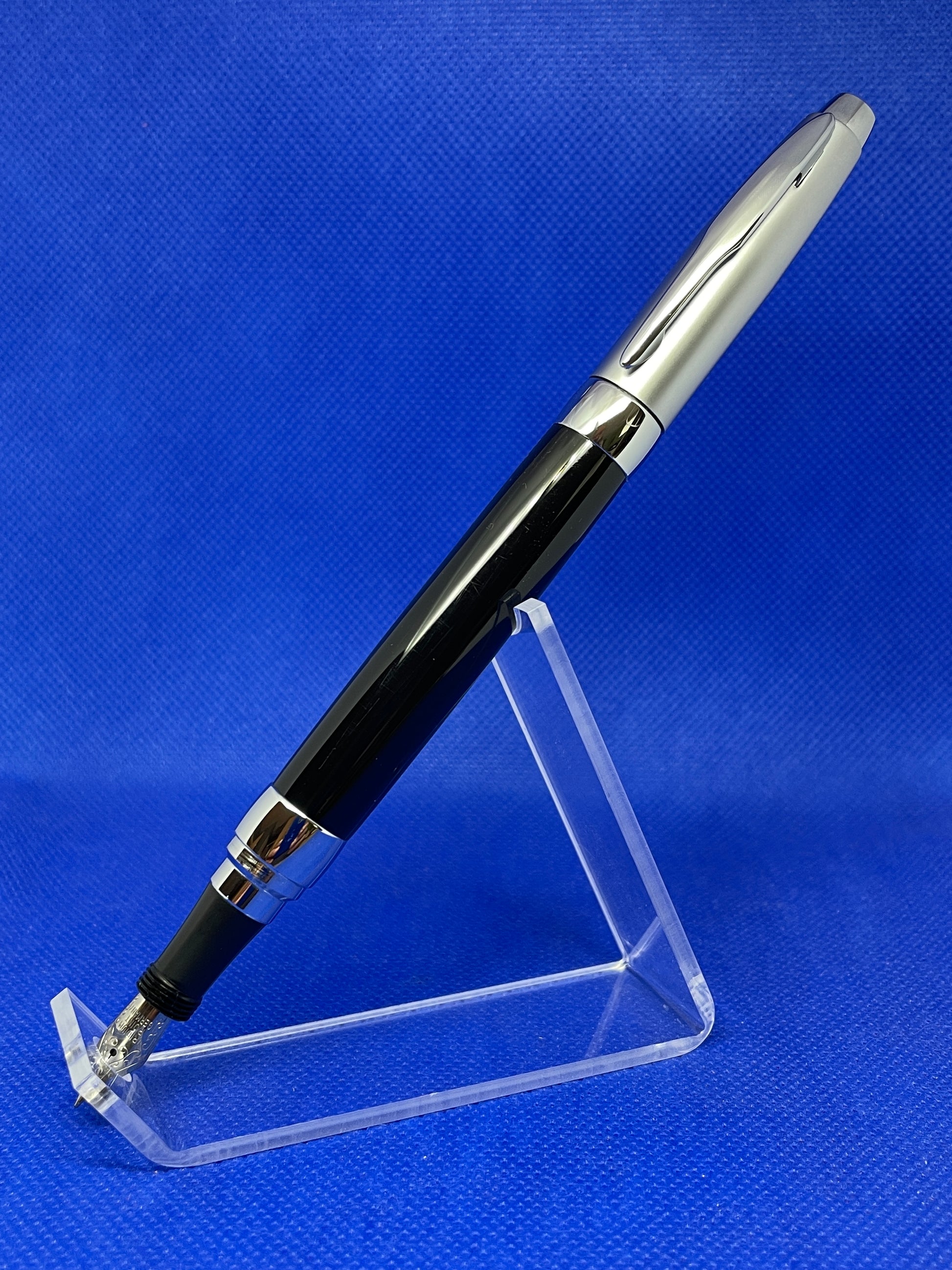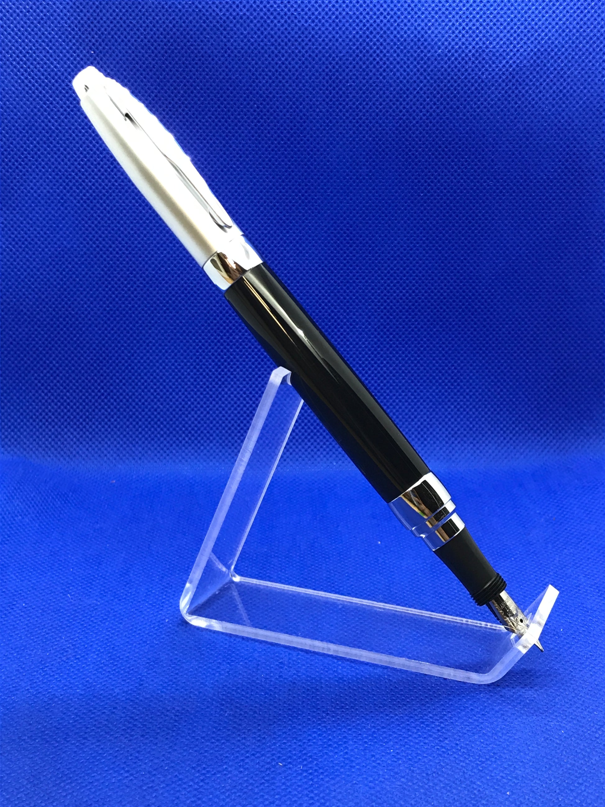 This Presimo fountain pen has satin and bright chrome fittings that accent the classic pure black acrylic acetate body. The contrasting bright and satin metalwork really make a statement. This pen comes with a carbon fibre pattern box, a universal ink cartridge, and an ink pump for refilling from an ink bottle.