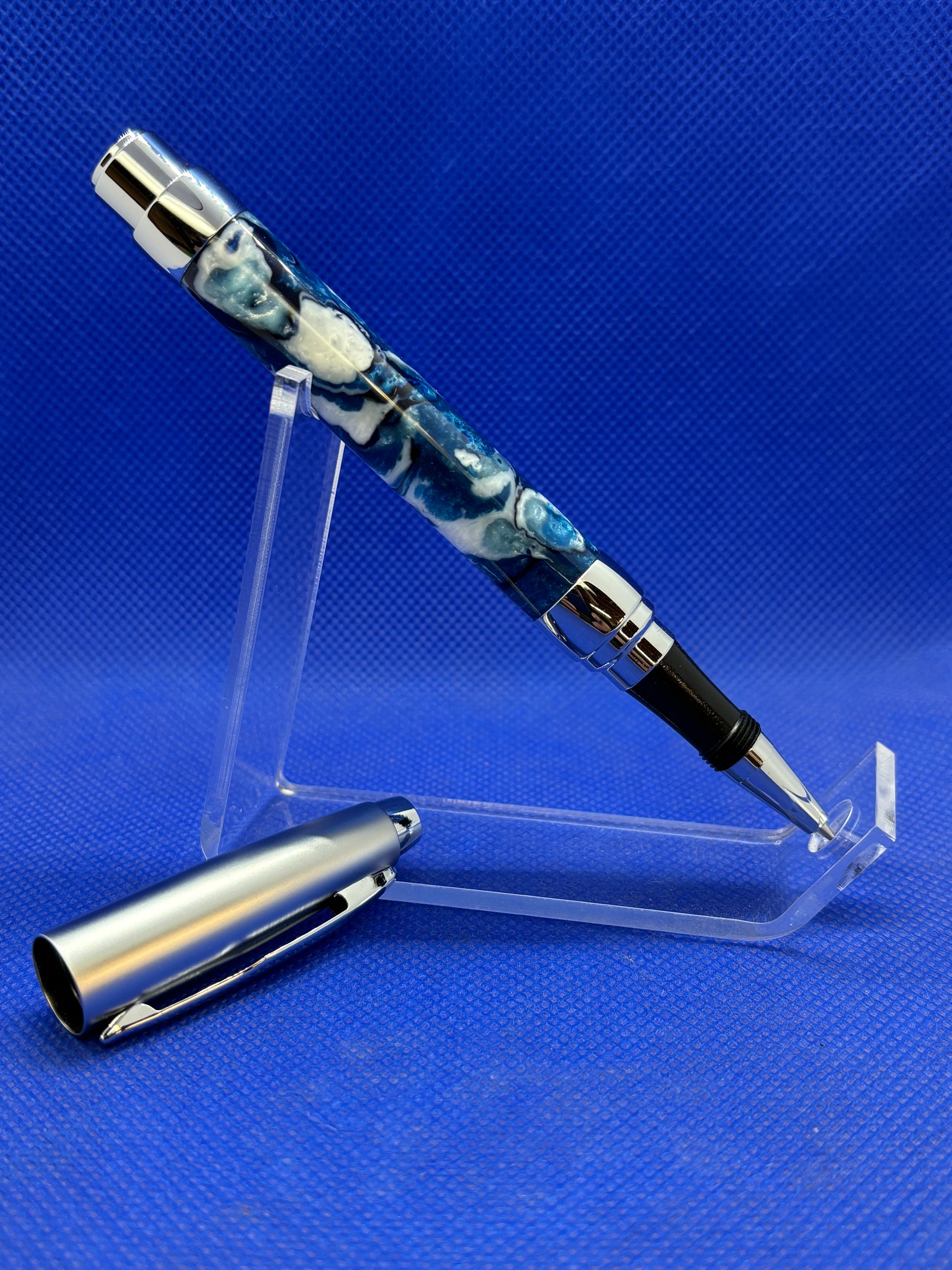 This Presimo rollerball pen has satin and bright chrome fittings and a Pearlux "Admiral" body. This pen uses a premium Schmidt style rollerball refill.