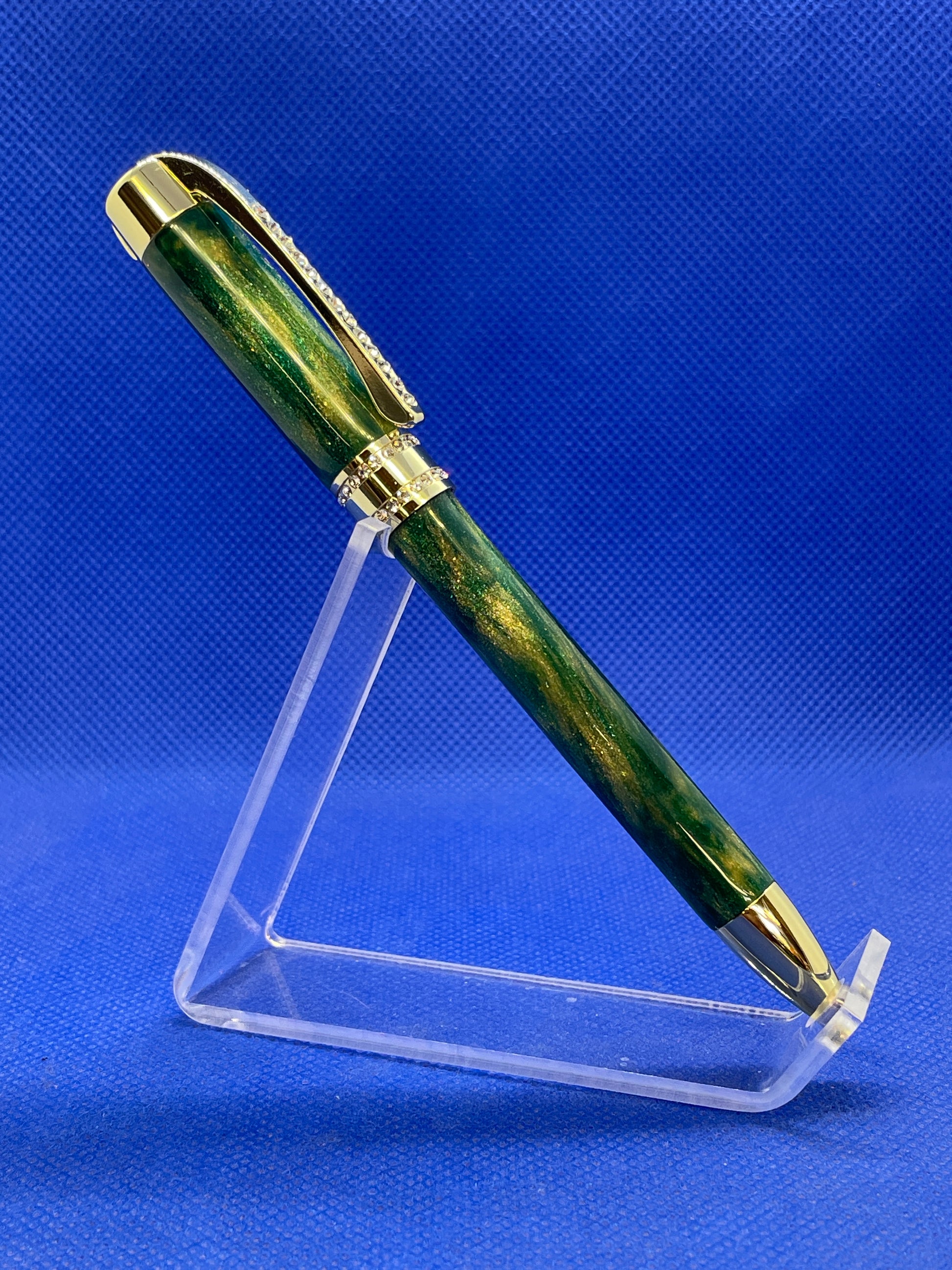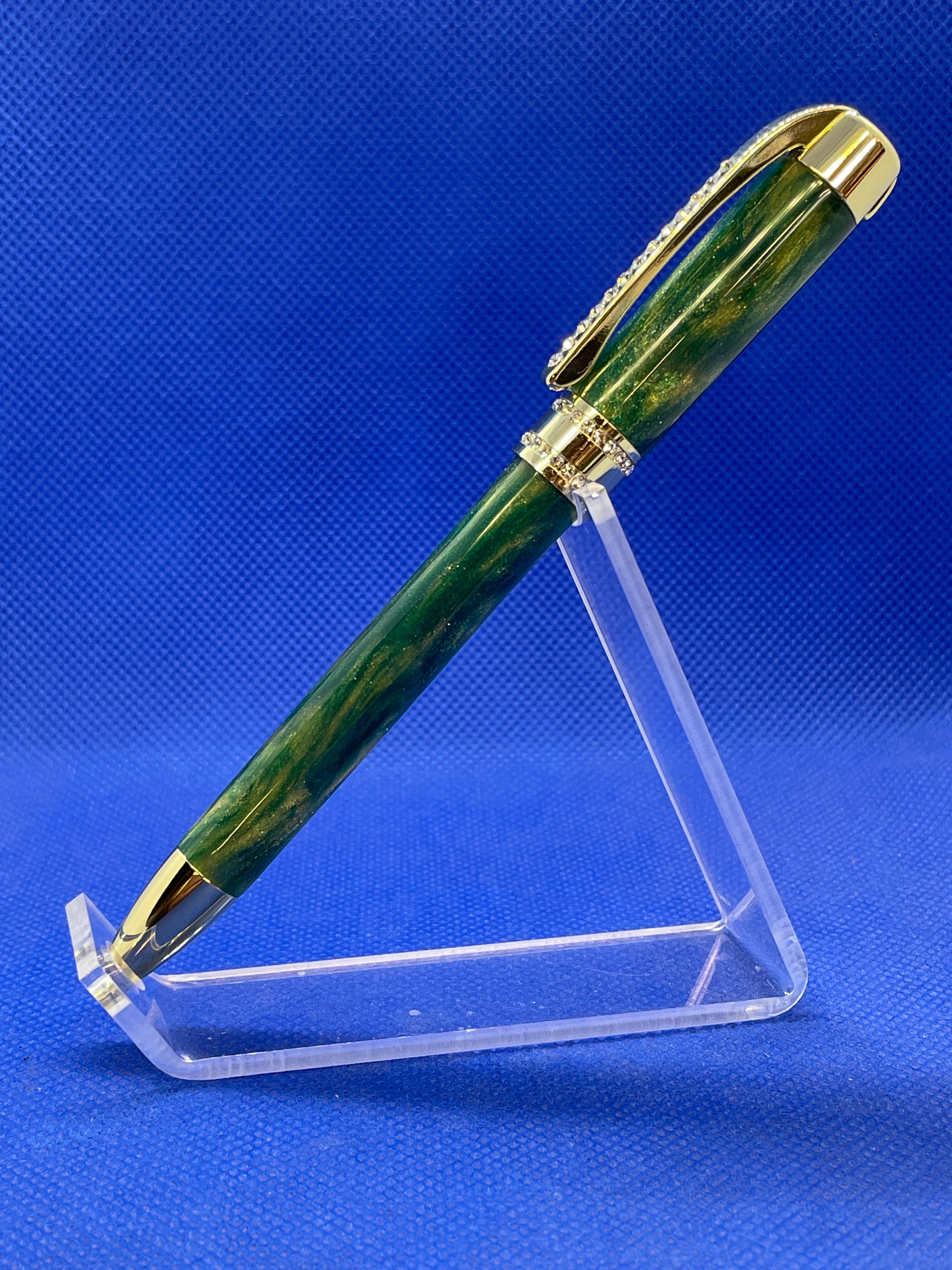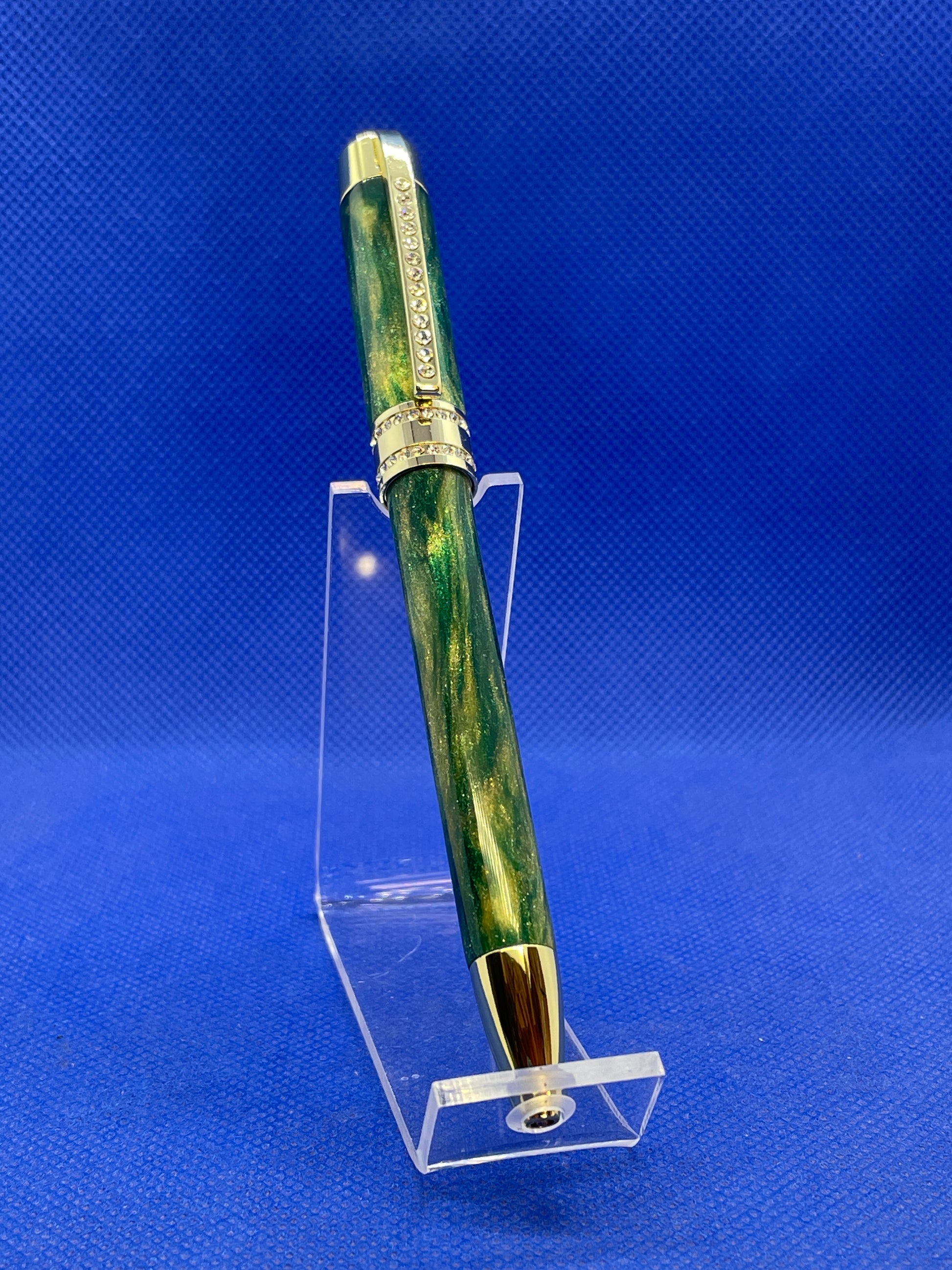 This is a statement piece! This Princess twist ballpoint pen features gold trim and 50 facet cut Swarovski crystals on the articulated spring clip and centre band. The body is made from "DiamondCast Shamrock" which is a resin material with suspended diamond particles throughout. Combined with the swirled colours, the diamonds and Swarovski crystals give amazing sparkle and brilliance to this pen. This pen uses standard "Parker" style refills