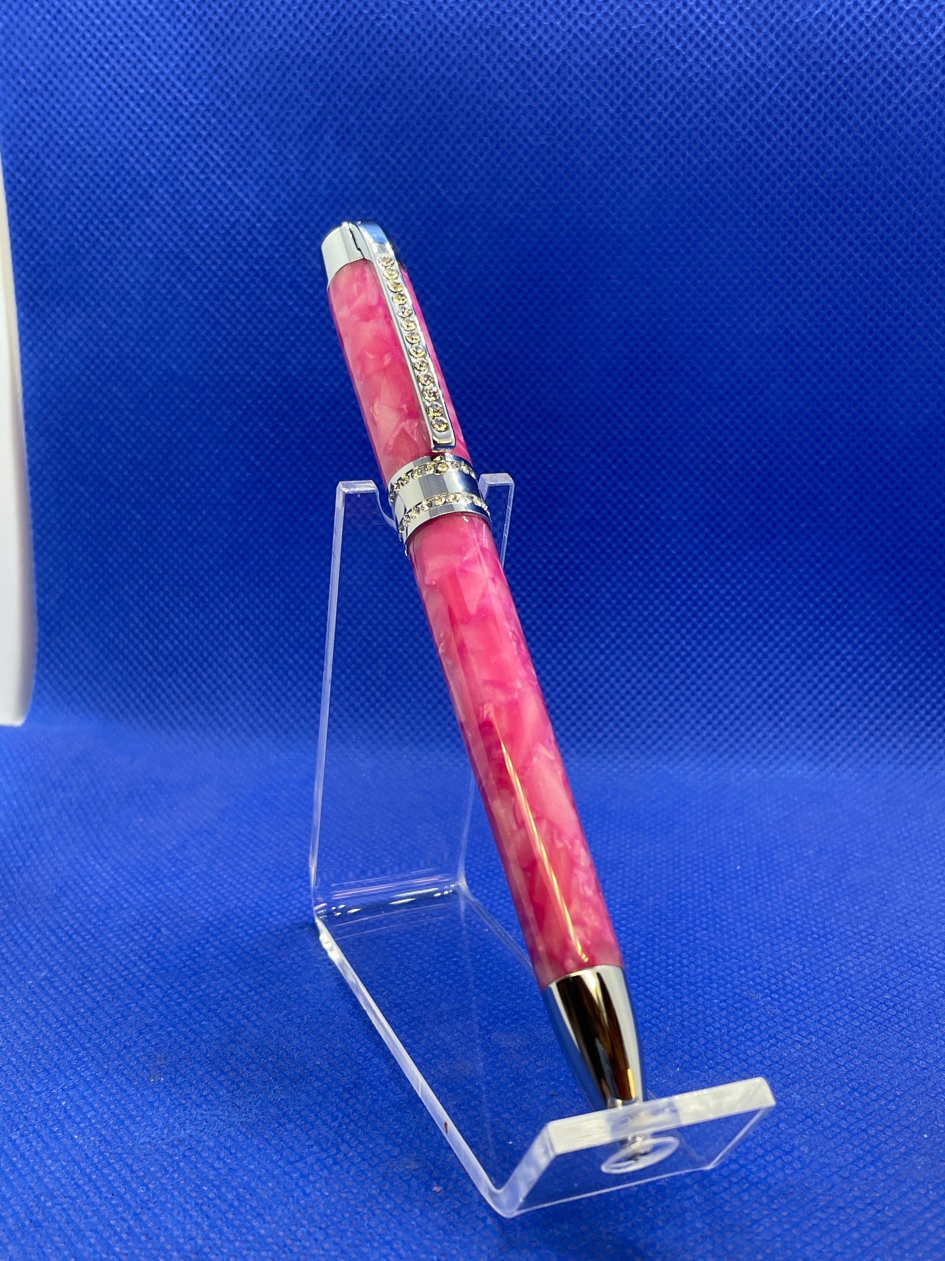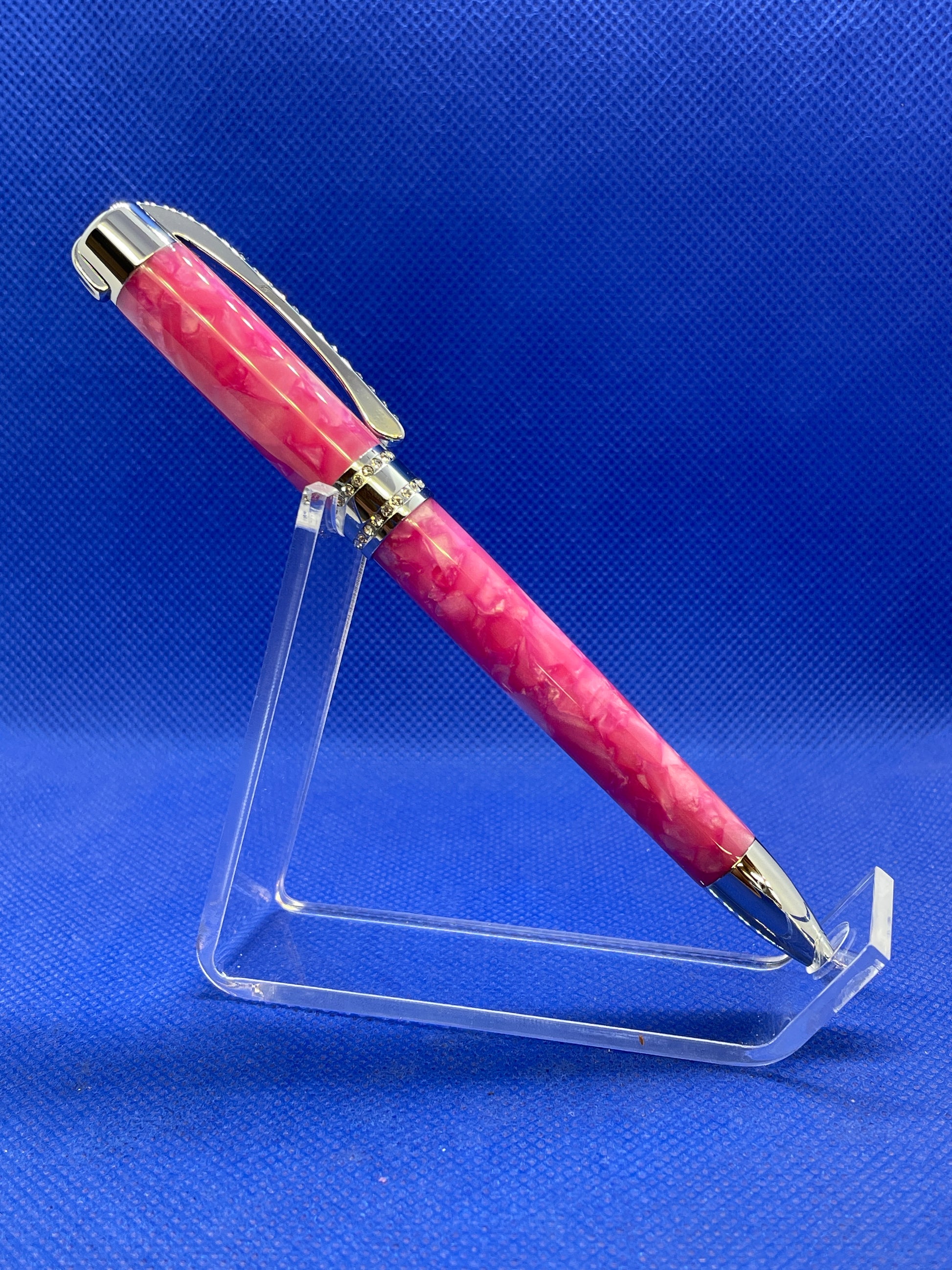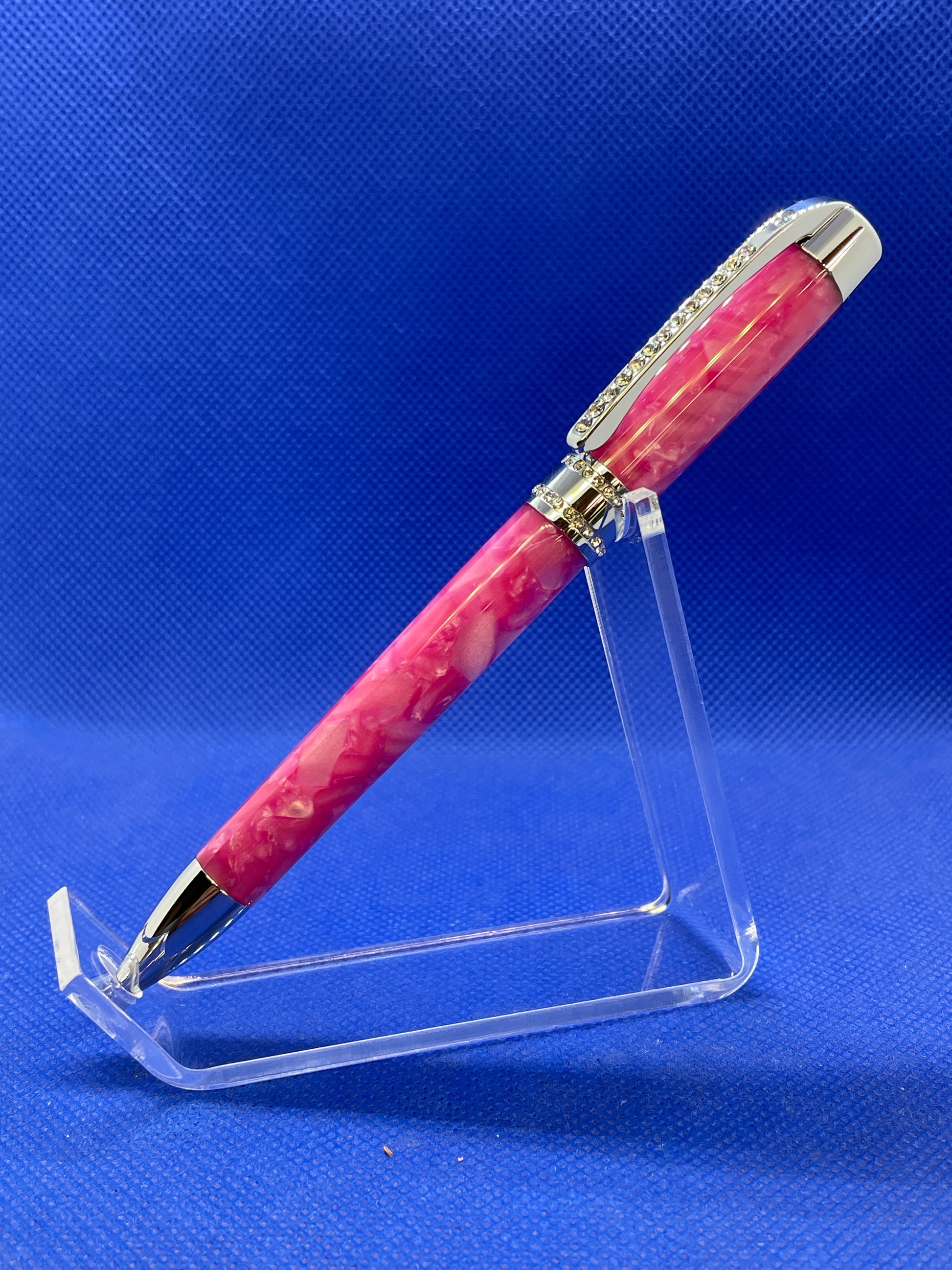 This is a statement piece! This Princess twist ballpoint pen features chrome trim and 50 facet cut Swarovski crystals on the articulated spring clip and centre band. The body is made from "Pink Pebble" acrylic acetate. The bright pink combined with the Swarovski crystals give amazing presence and brilliance to this pen. This pen uses standard "Parker" style refills