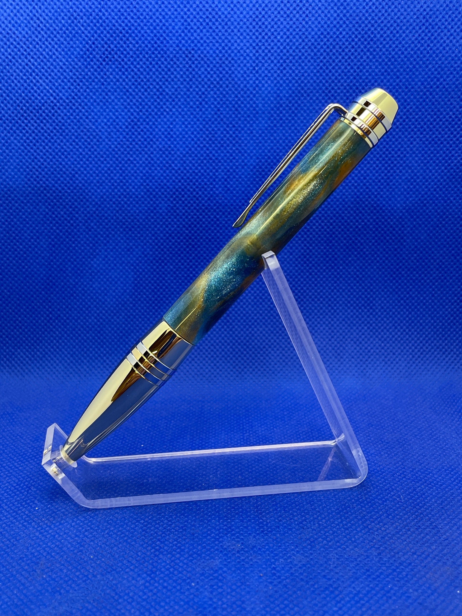 This Professional ballpoint pen features gold and chrome trim with a DiamondCast "Blue Macaw" resin body. DiamondCast is a resin material with real diamond flakes embedded in the body that give the pen a brilliant sparkle. This pen is well weighted and is comfortable for long periods of writing. It uses standard "Parker" style refills
