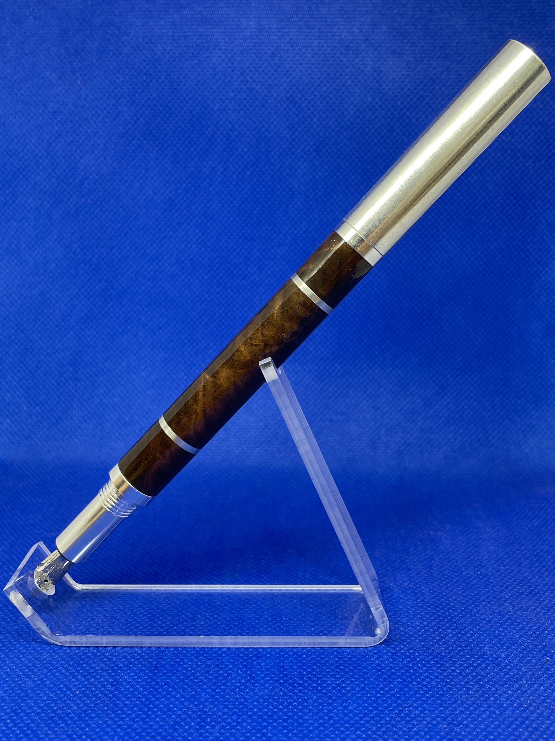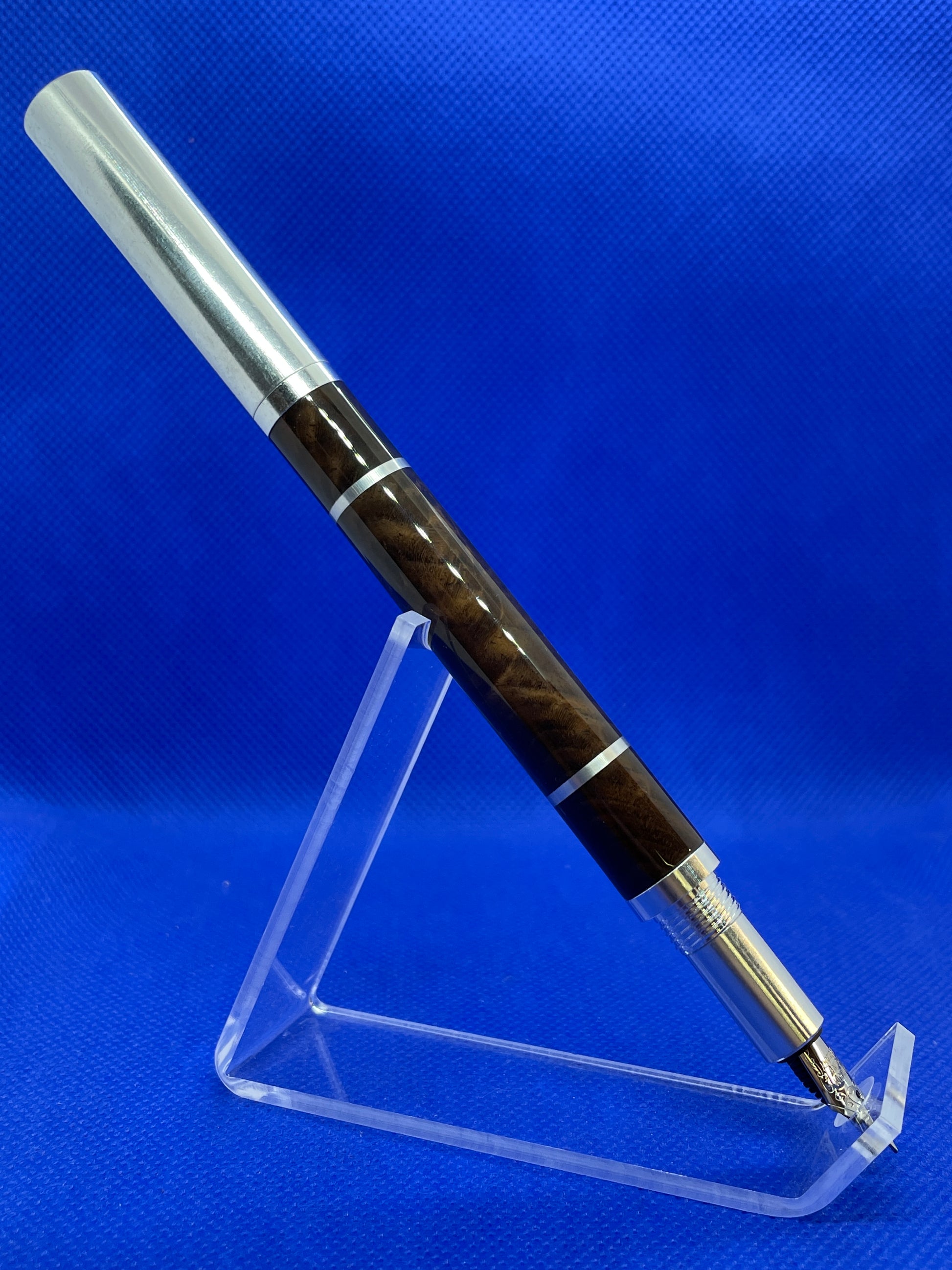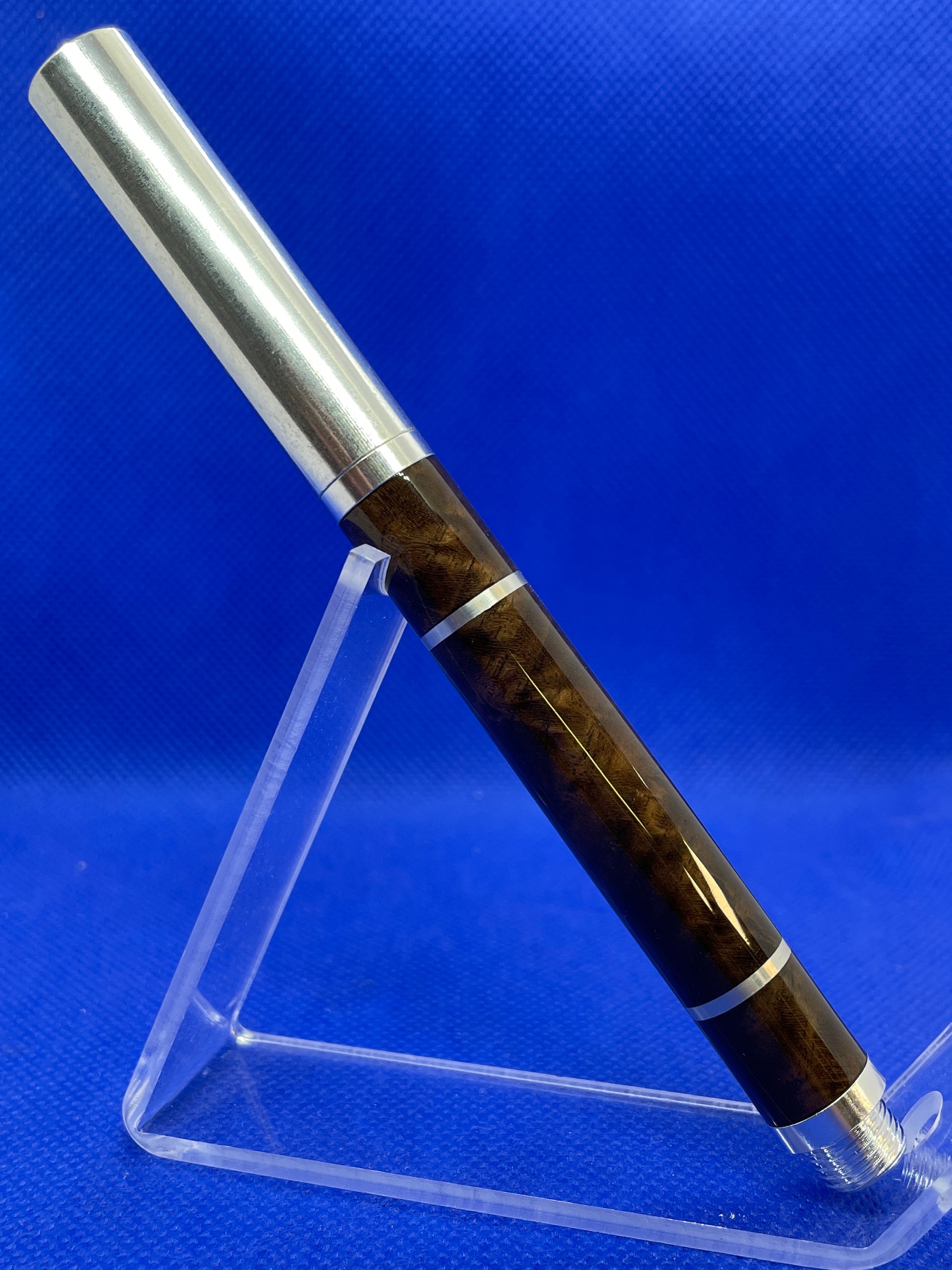 This RAW fountain pen has machined aluminum fittings with inlaid aluminum bands on a contrasting, highly figured, dark walnut body. It has great visual appeal and has a solid but lightweight feel in the hand. This style of pen does not have a clip and its clean, simple lines make it ideal as a desk pen. This pen comes with a carbon fibre pattern box, a universal ink cartridge, and an ink pump for refilling from an ink bottle.