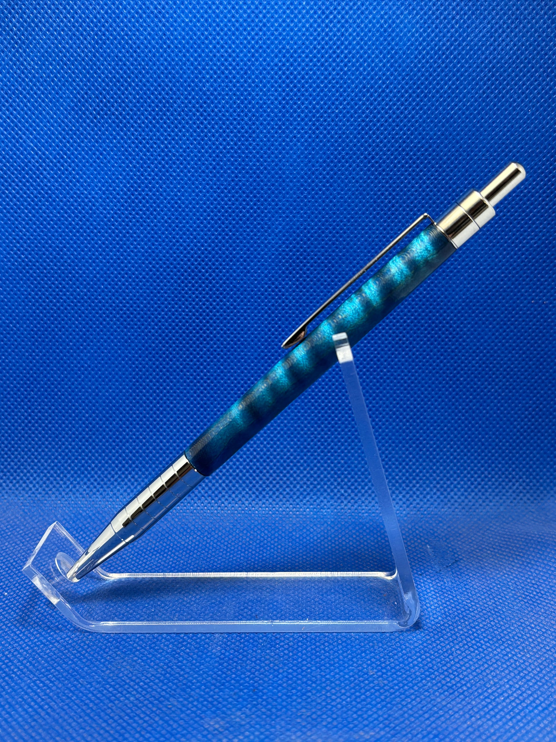 This Saxa click ballpoint pen features a slender Electric Blue curly maple body and chrome trim. It uses a precision machined, smooth operating, all metal click mechanism that is incredibly durable. This pen uses a standard Cross style refill.
