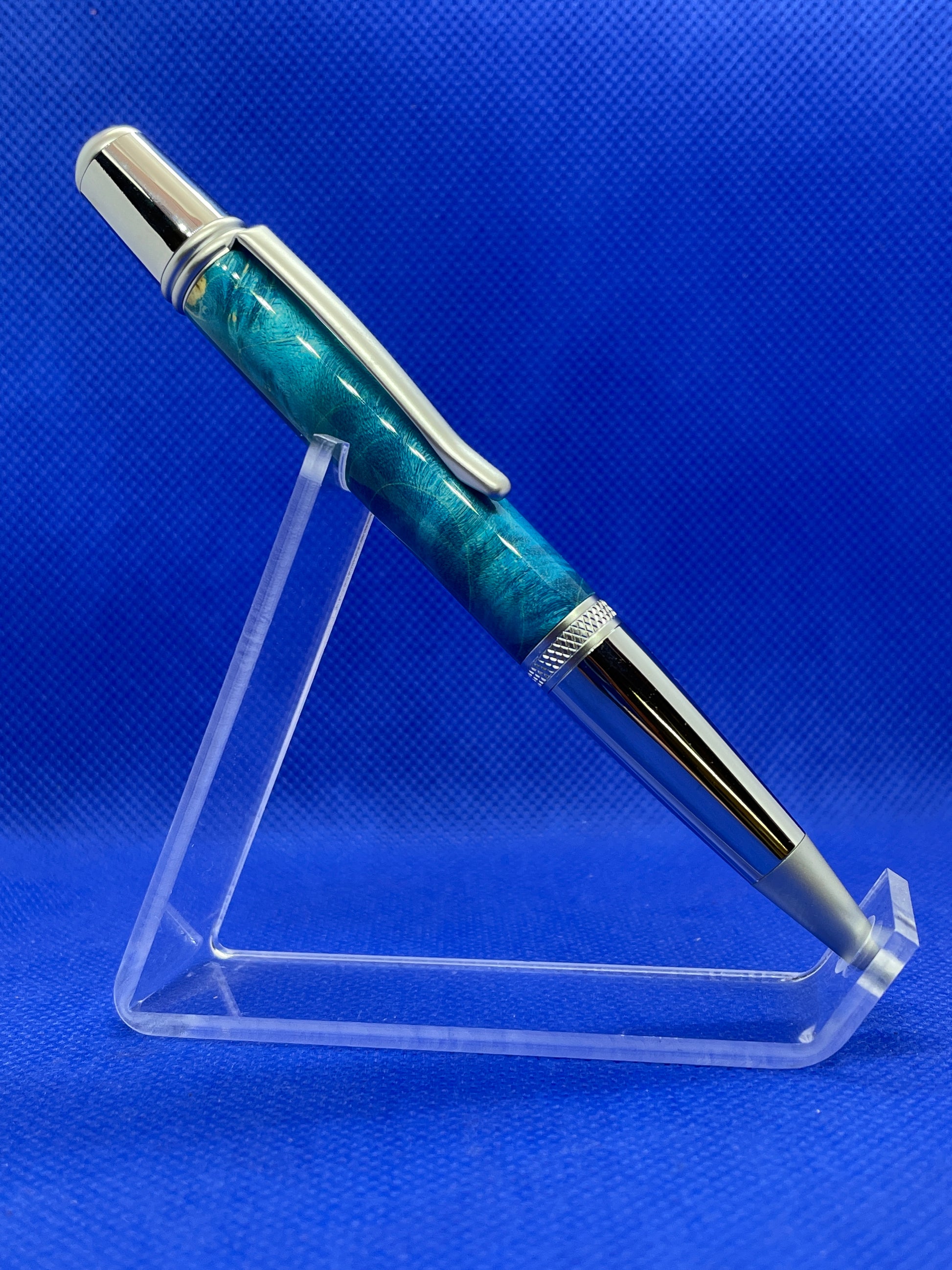 This Sierra ballpoint pen features a blue Box Elder Burl body and two-tone chrome trim. The satin and bright chrome features really pop with the bright blue wooden body. The variations in colour of the body come from the different densities of the burl wood. No two burl wood pieces will ever turn out the same. This pen comes with a carbon fibre pattern box and uses standard Parker style refills.