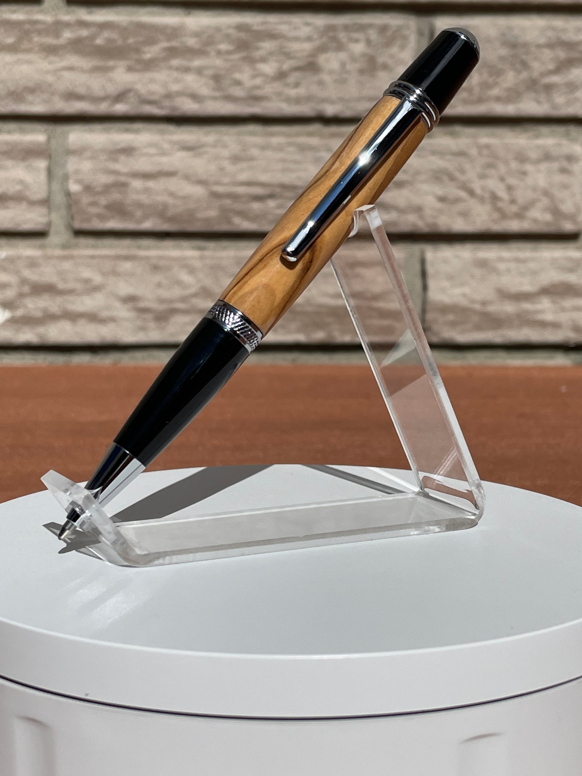 This ballpoint pen features chrome trim and a body made of Olive wood sourced directly from Bethlehem.