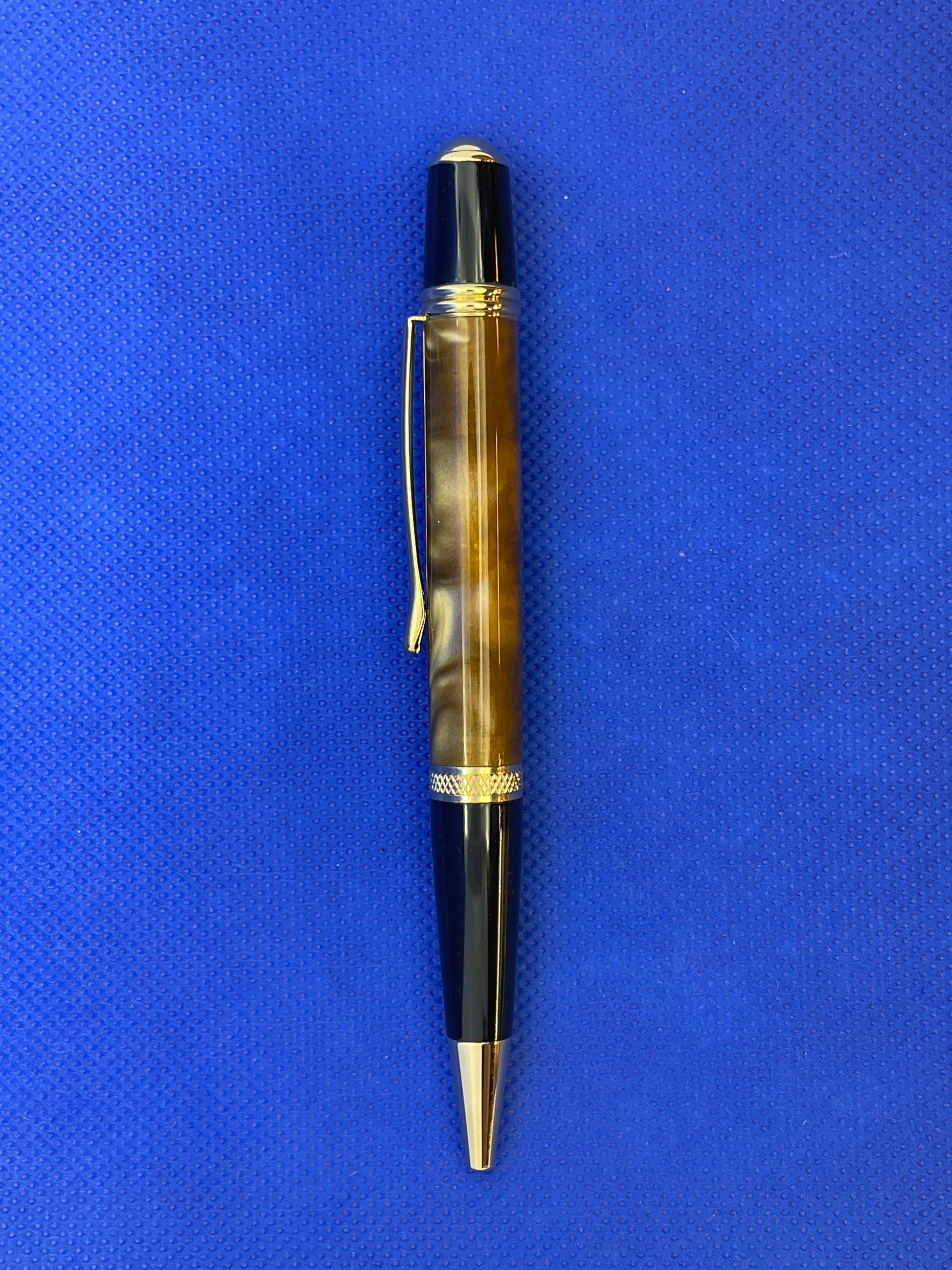 This Sierra ballpoint pen features gold and black trim with a pearlescent "Gold Rush" acrylic acetate body. It uses standard Parker style refills.