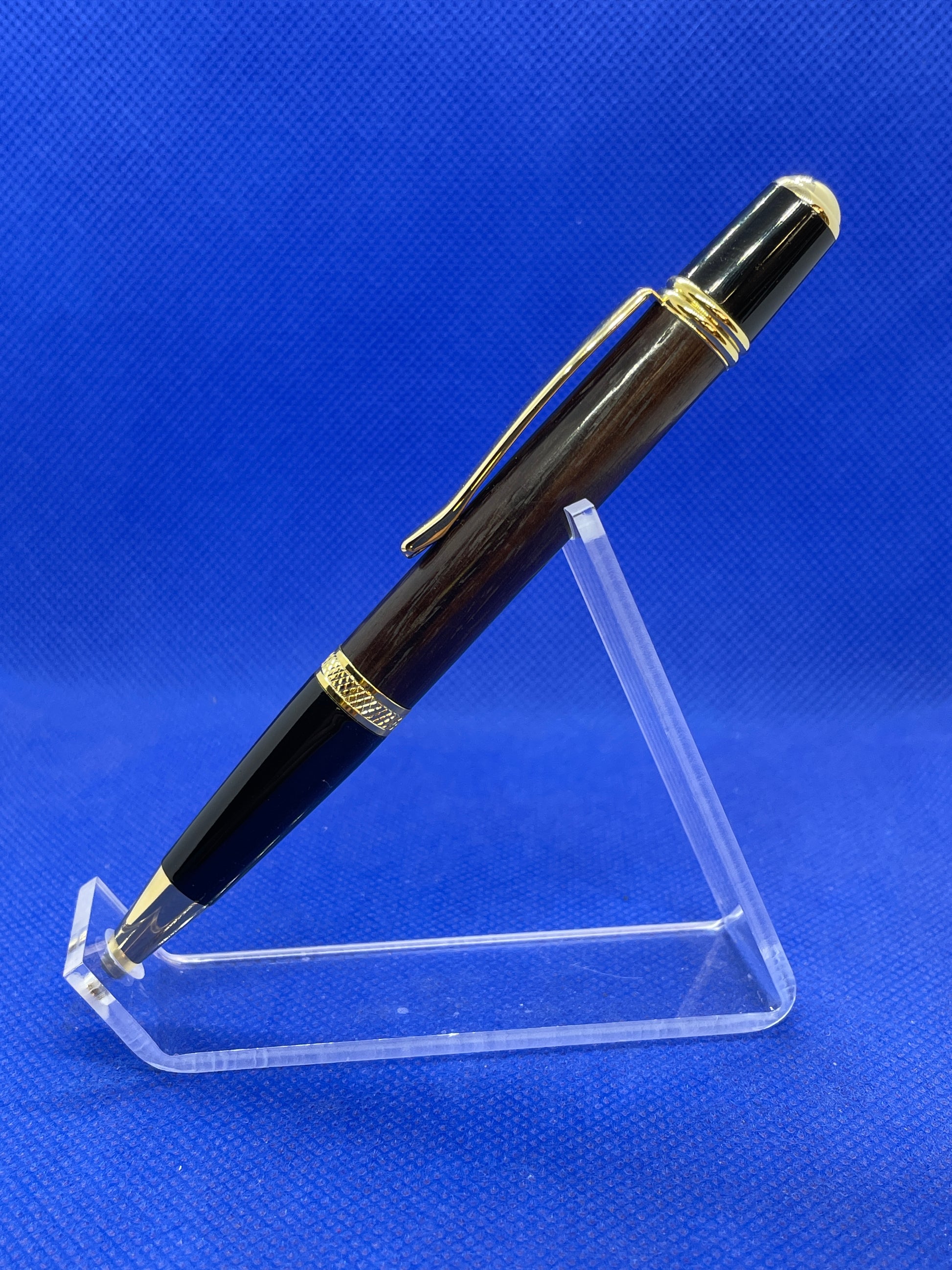 This Sierra ballpoint pen features gold and black chrome trim with a rich, dark black Wenge wood body. It uses standard Parker style refills.