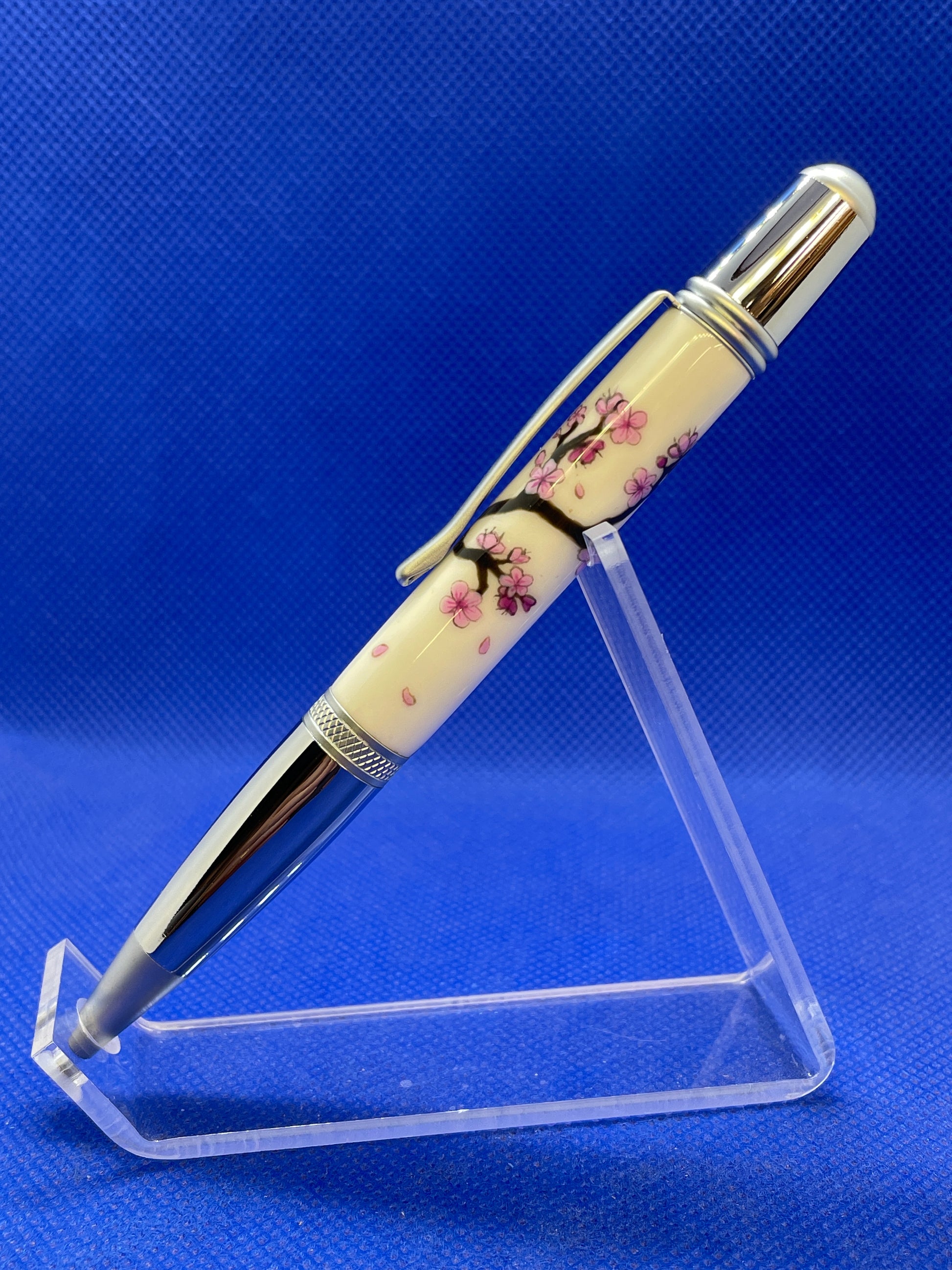 This beautiful Sierra pen features hand-painted "Cherry Blossom" artwork by our in-house artist Rachel. The satin and bright chrome trim adds lightness to this springtime themed pen. This is a beautiful art piece to add to your collection. This pen uses standard Parker style refills.