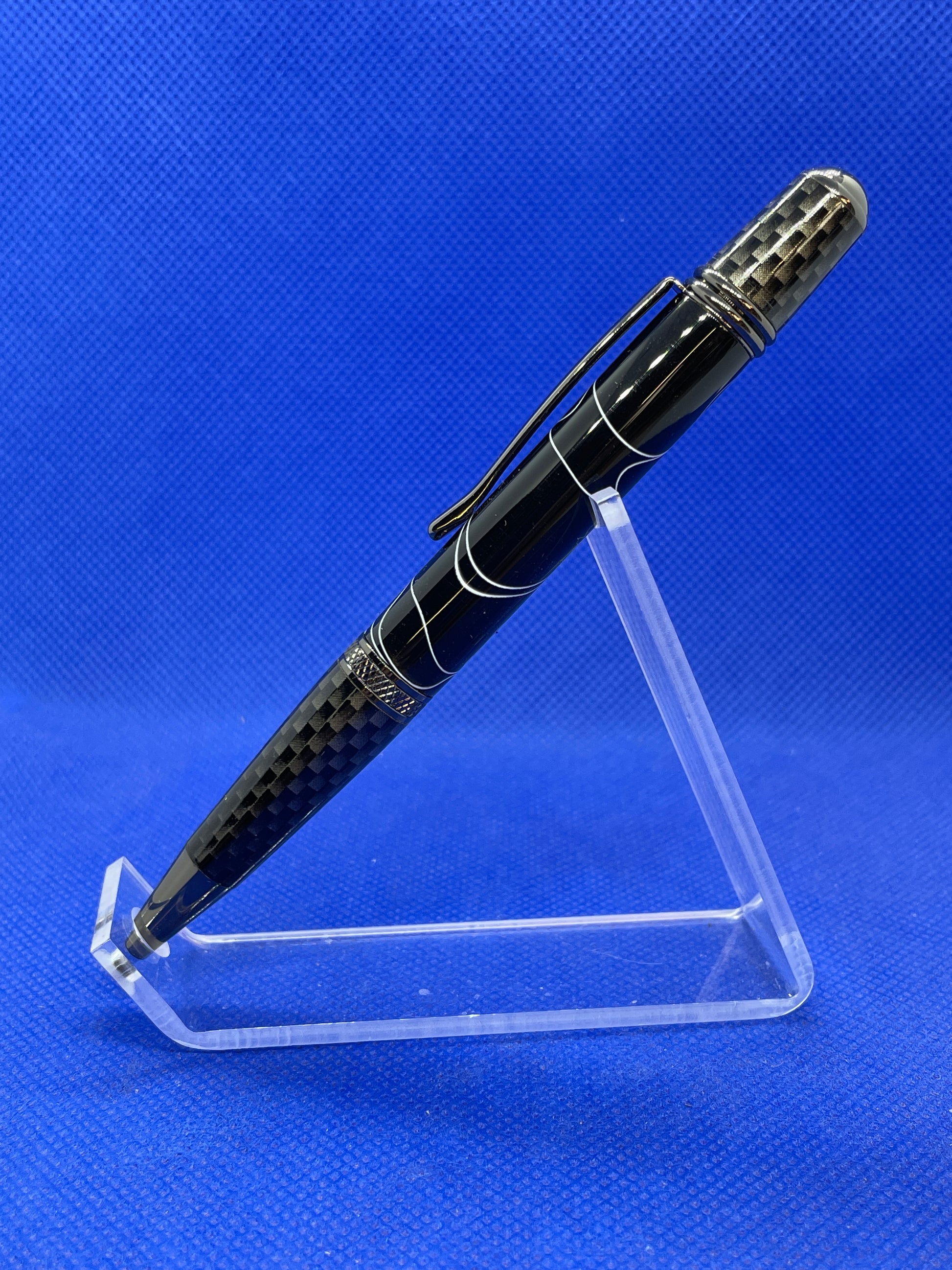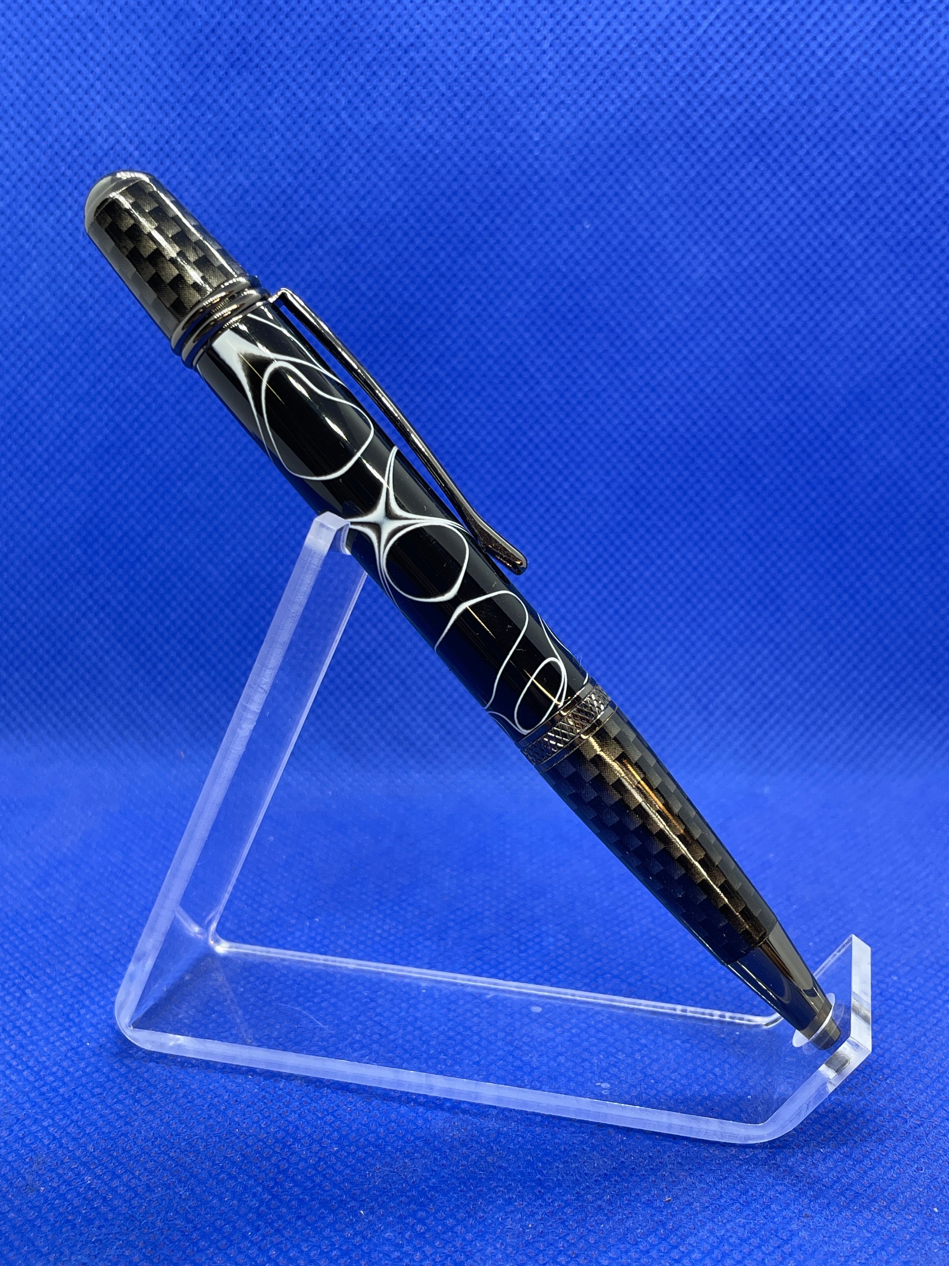 This Sierra Nomad ballpoint pen features carbon fibre and gun metal trim with a "White Lightning" acrylic acetate body. This pen uses standard Parker style refills.