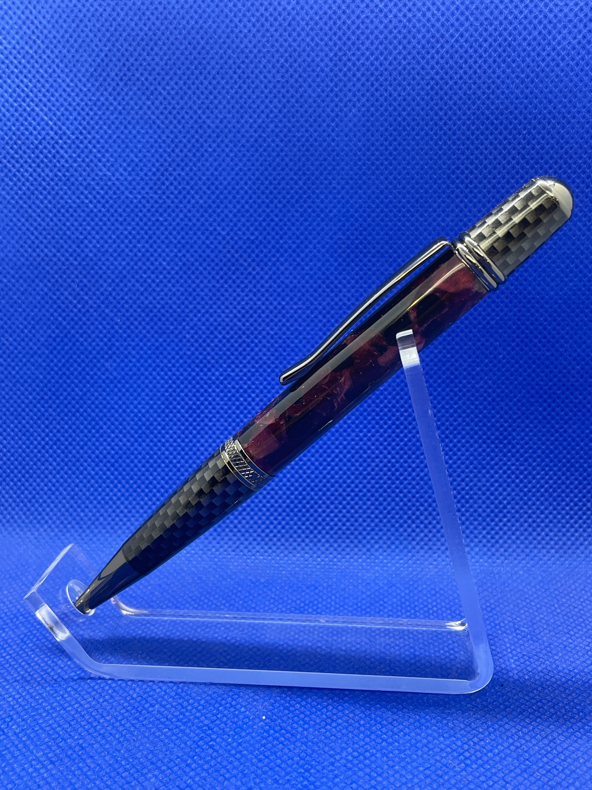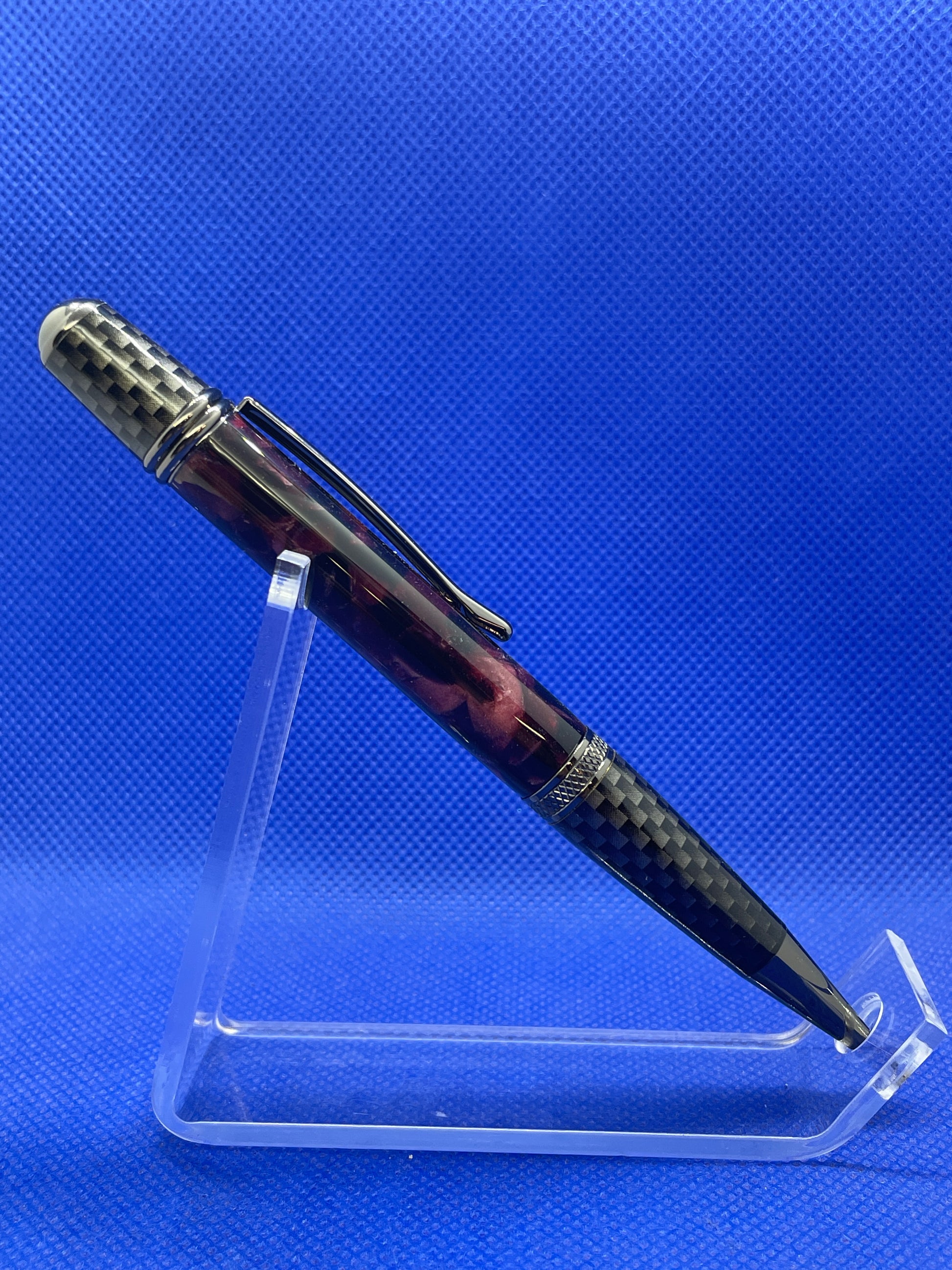 This Sierra Nomad ballpoint pen features carbon fibre and gun metal trim with a "Mulberry" acrylic acetate body. This pen uses standard Parker style refills.