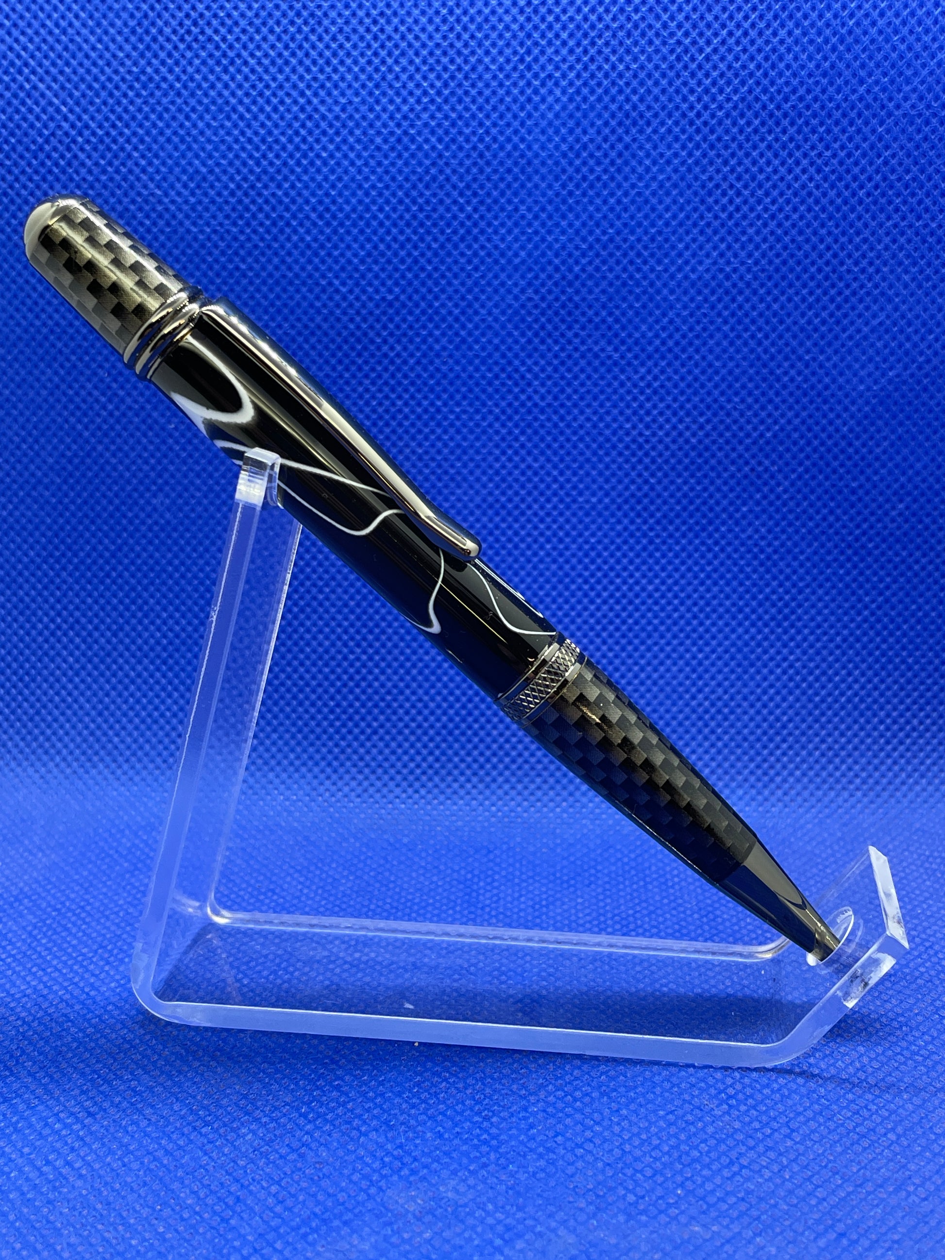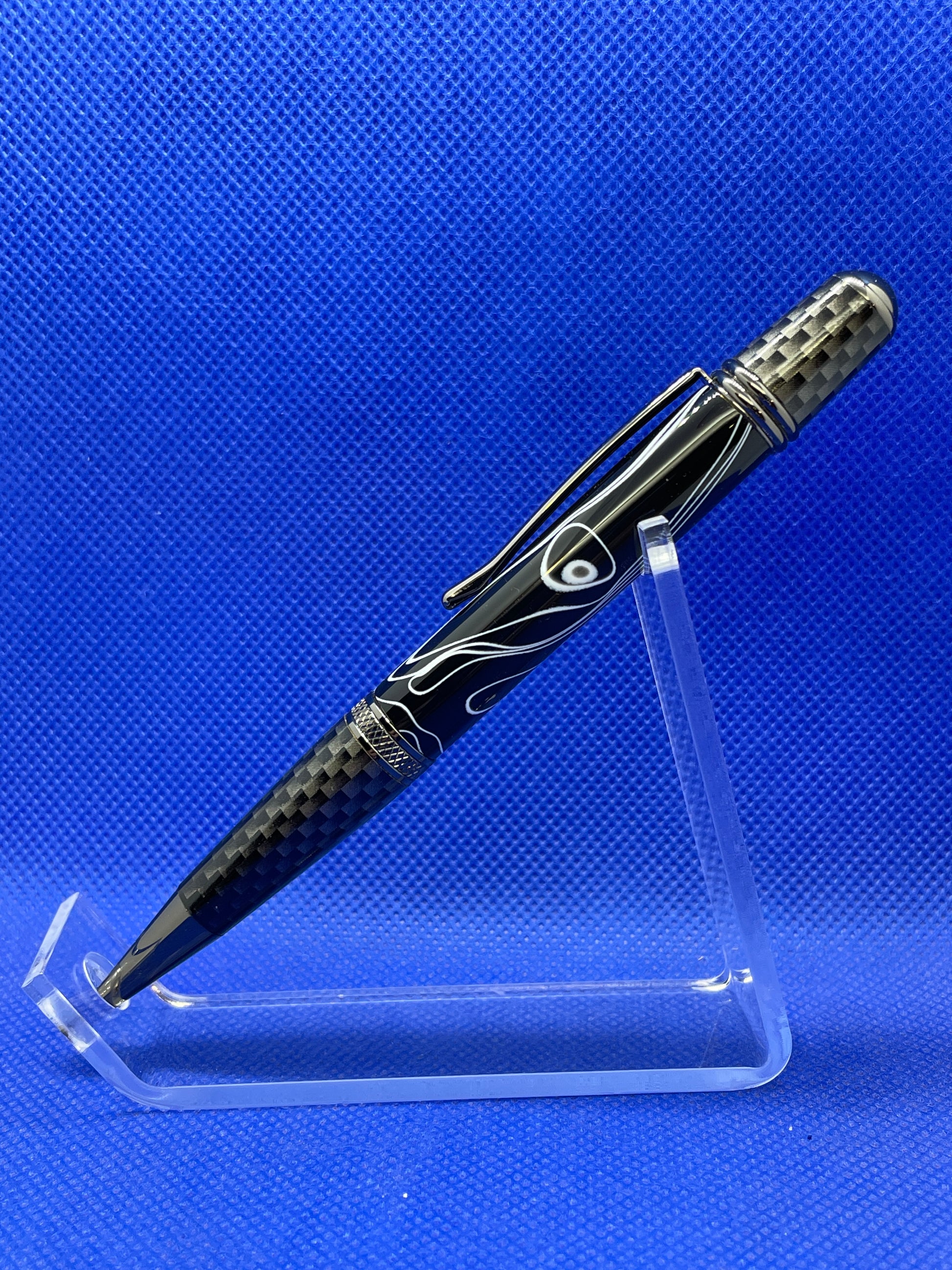 This Sierra Nomad ballpoint pen features carbon fibre and gun metal trim with a "White Lightning" acrylic acetate body. This pen uses standard Parker style refills.