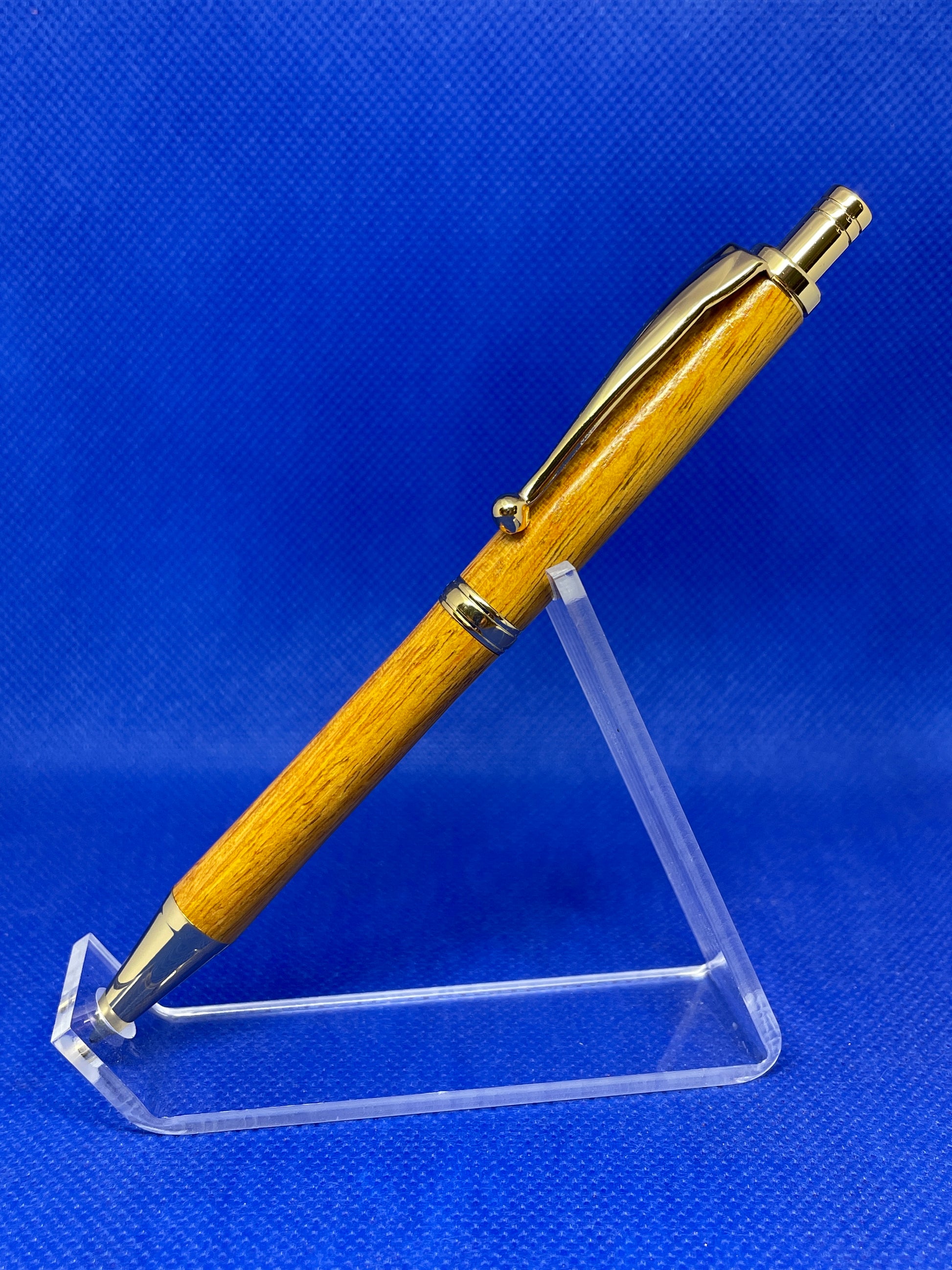 This click ballpoint pen features gold fittings and a unique Osage Orange wood body. This pen is lightweight and ideal for use as a classy everyday pen. It is well balanced in the hand and comfortable for long periods of writing. This pen comes in a window box and uses standard Parker style refills.
