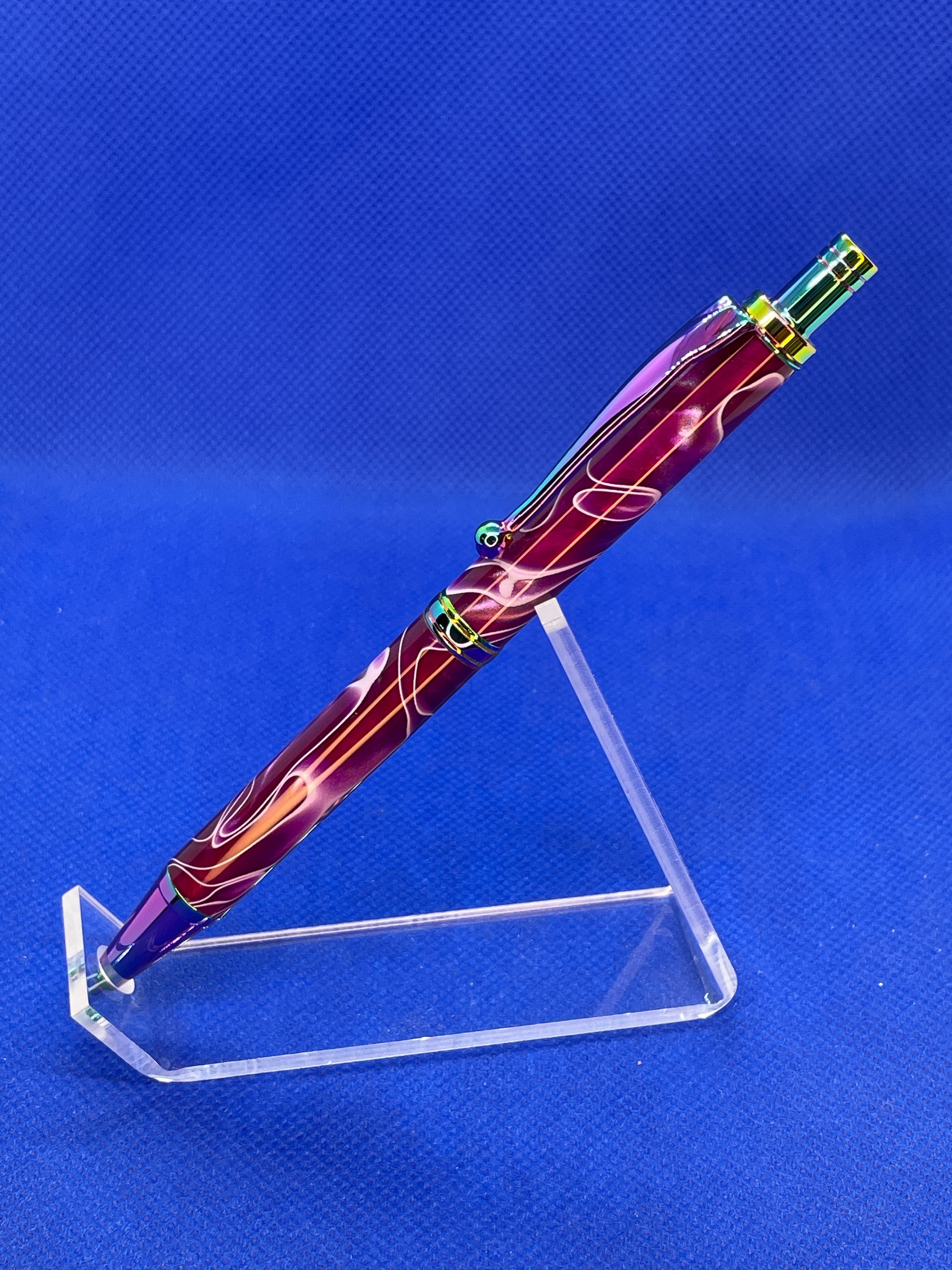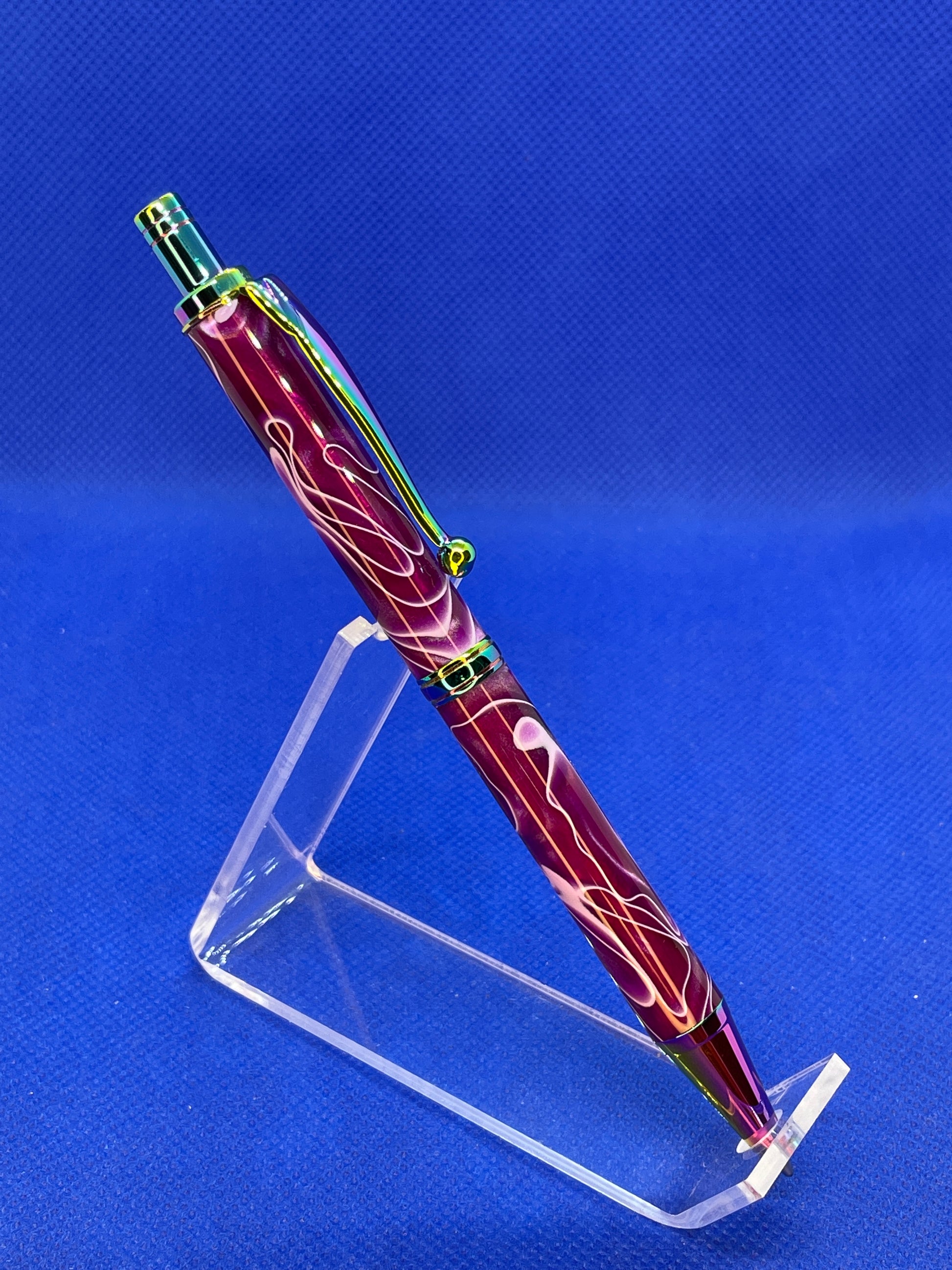 This Slim Click Ballpoint Pen features an "Ultra-Violet" acrylic acetate body "Chameleon" metal trim.