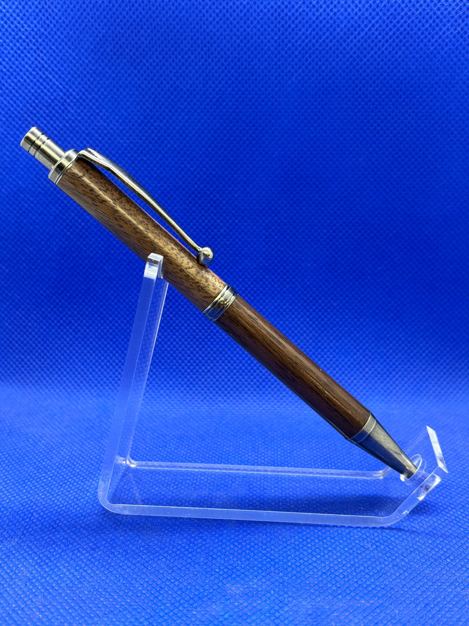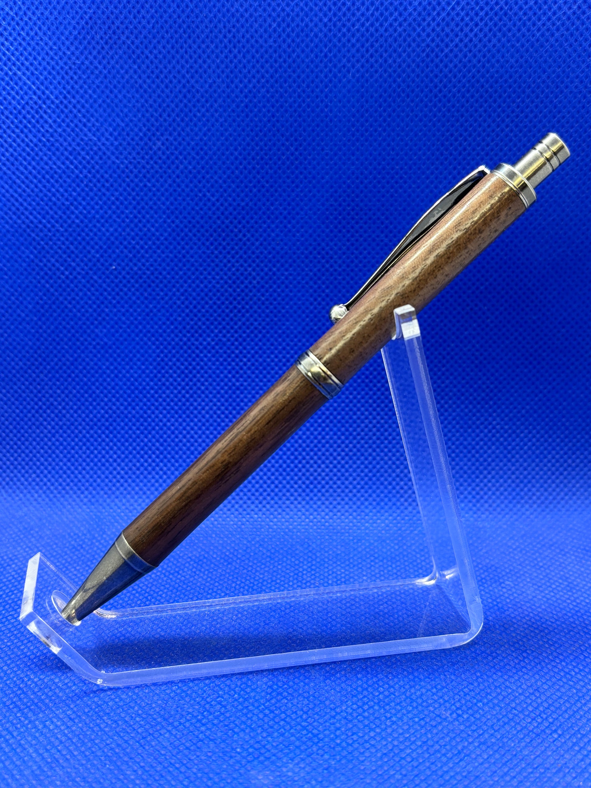 This Slim Click Ballpoint Pen features a figured wood body with dark gunmetal trim. This pen uses standard Parker style refills.