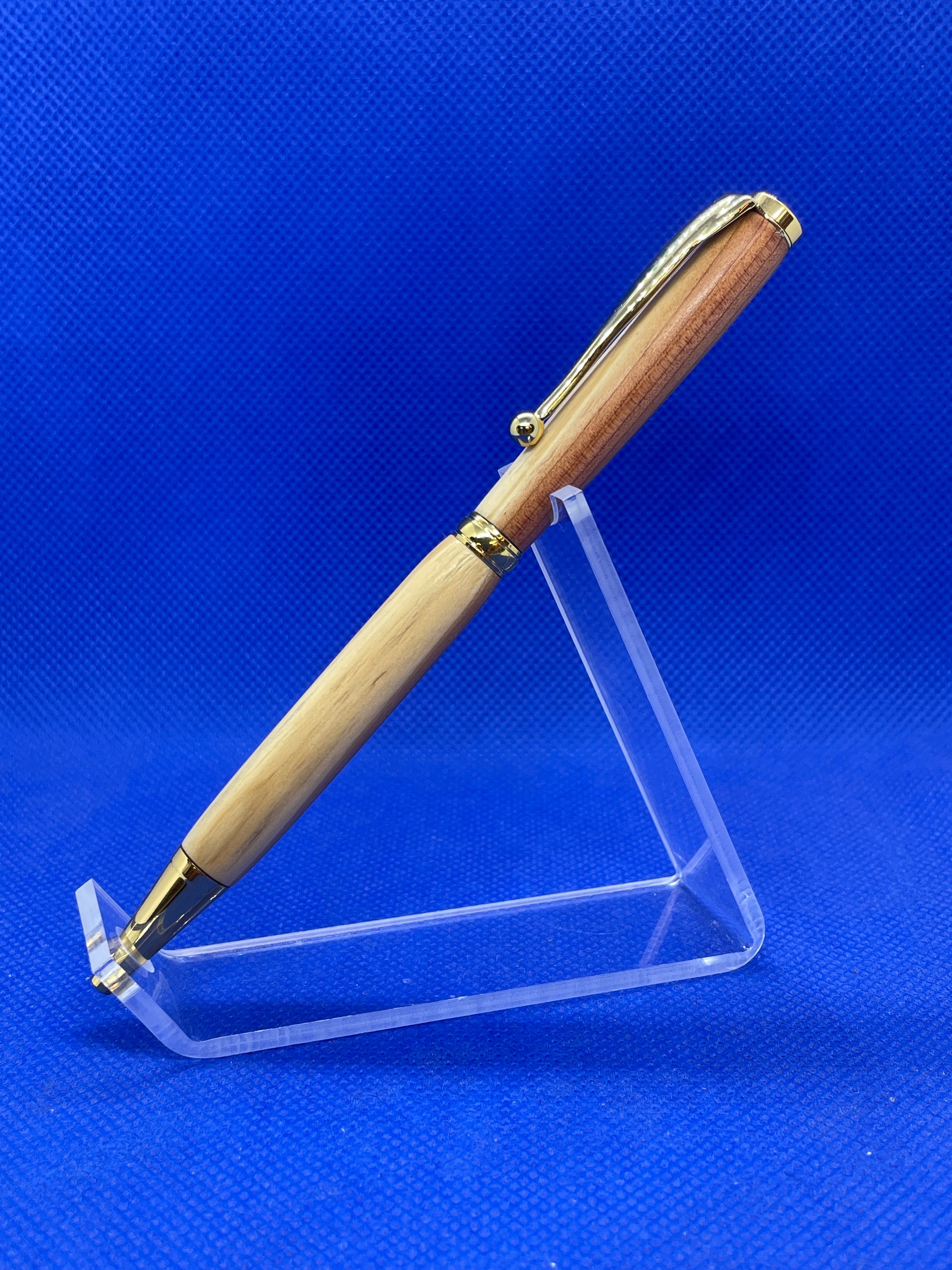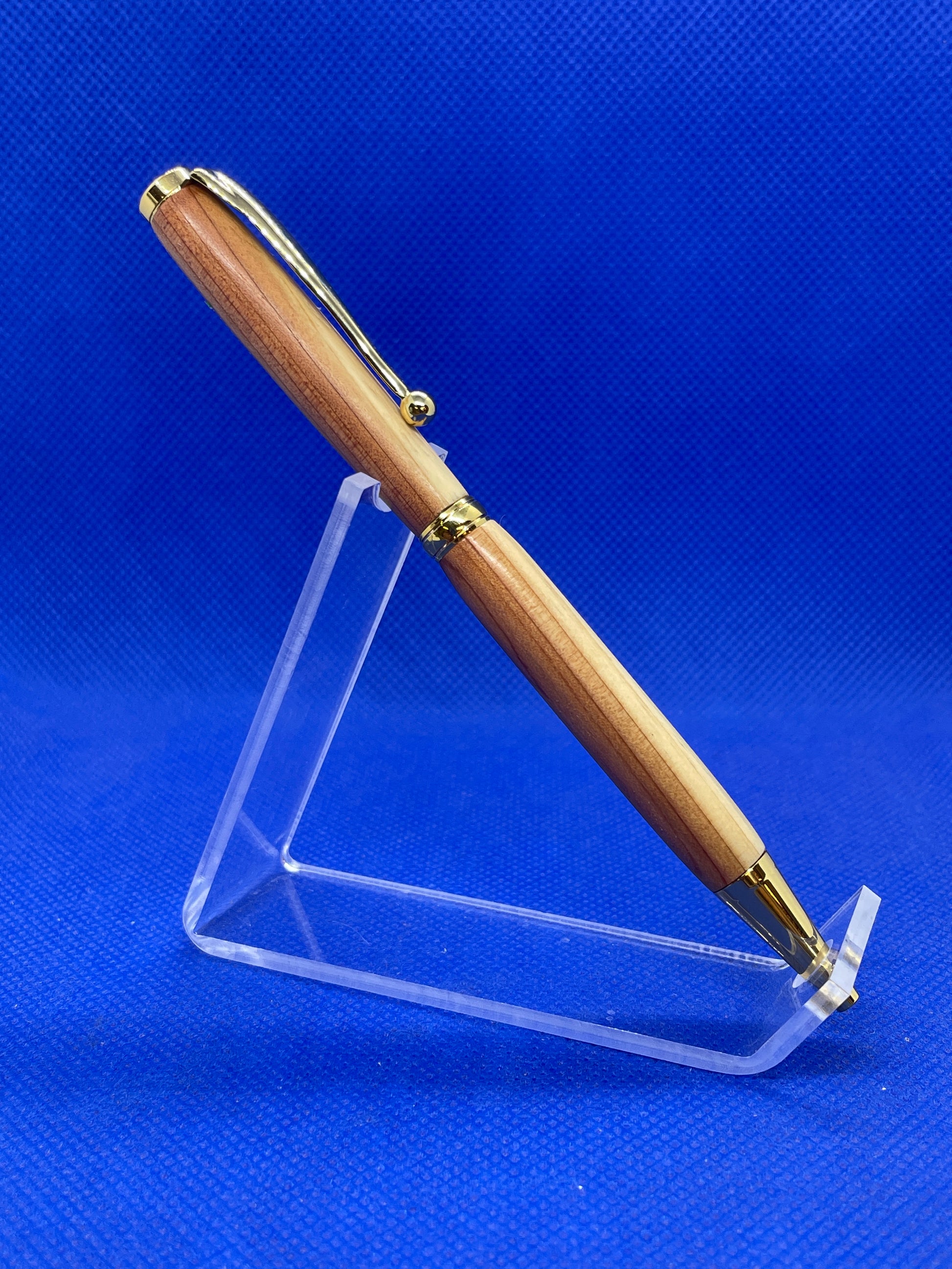 This Slimline ballpoint pen features gold trim and a Cedar wood body. This pen uses "Cross" style refills.