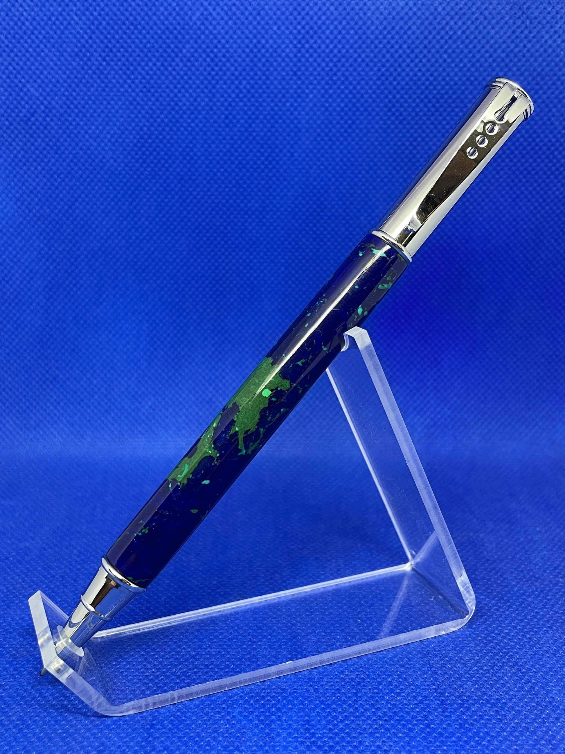 The Rollerball pen features bright chrome trim and a unique blue and green manufactured stone body. This unique body material give the pen a nice weight and balance in the hand. It uses standard Schmidt style rollerball refills.