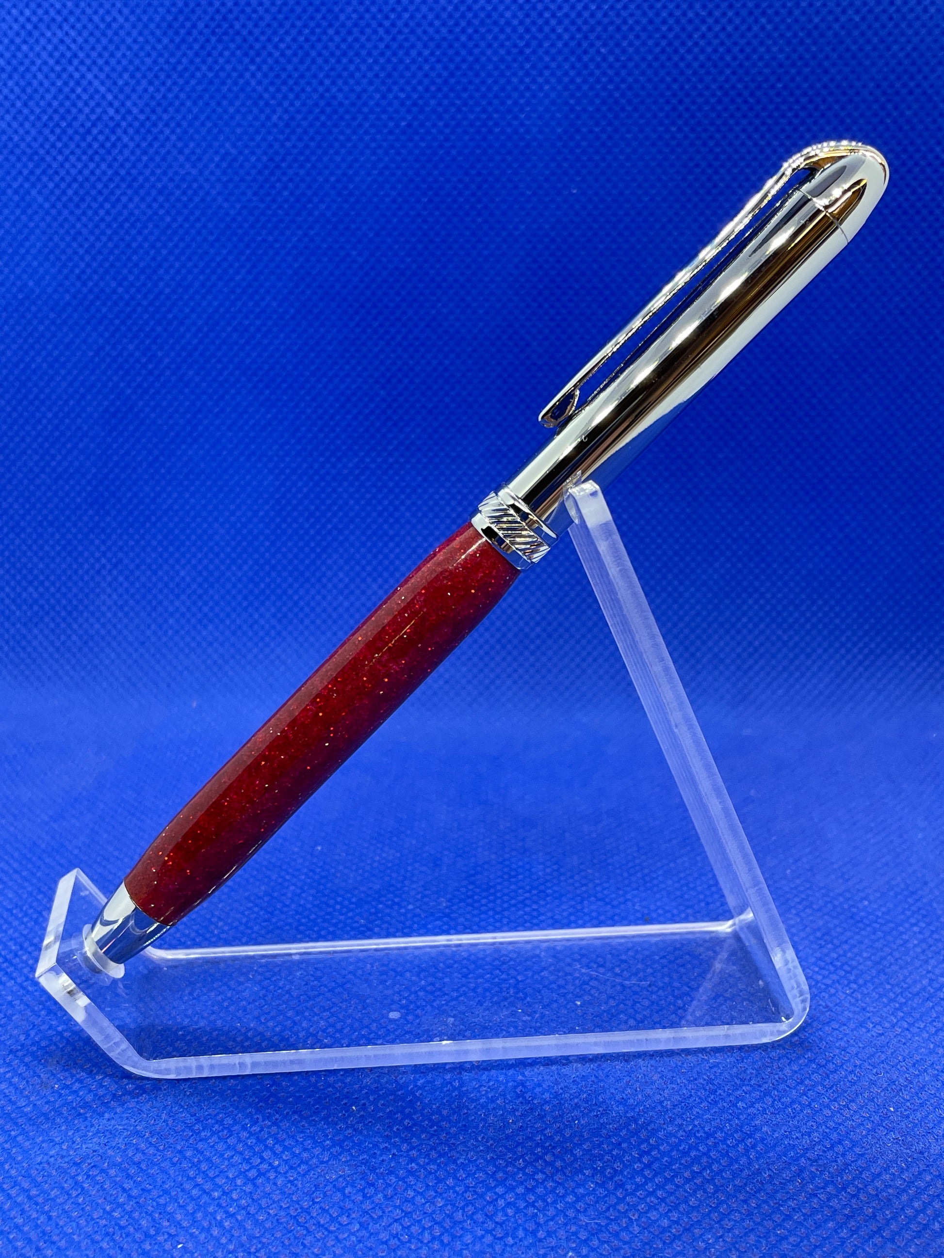 This Surfix ballpoint pen features chrome trim and a bright red "Flare" glitter resin body. It is a slim, lightweight pen that is ideal for carrying in a purse or pocket. It uses standard Cross style refills