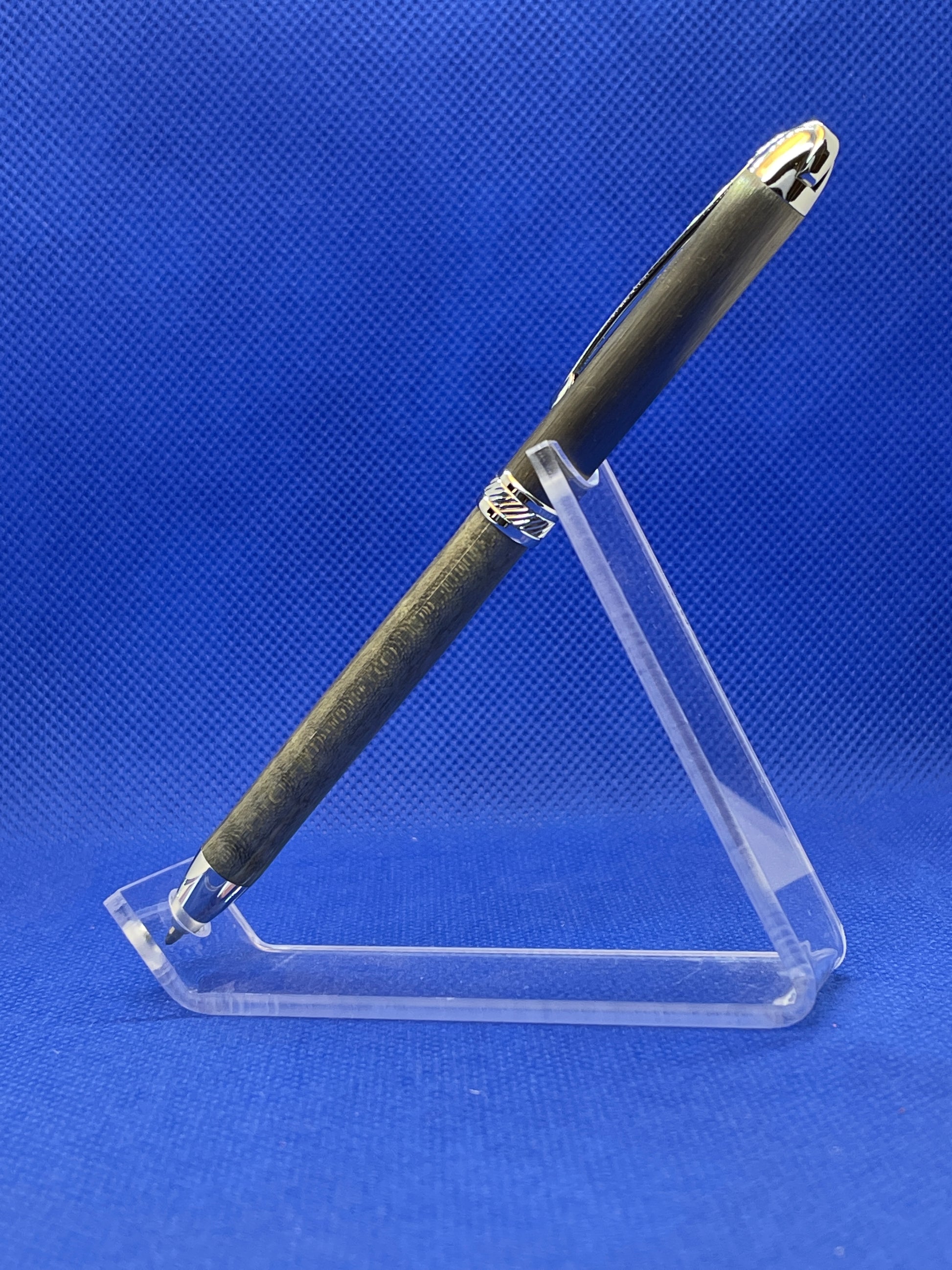 This Surfix Duo ballpoint pen features two-tone brushed gunmetal and chrome trim with an articulated clip and a grey curly maple wood body. It is a slim, lightweight pen that is ideal for carrying in a purse or pocket. It uses standard Cross style refills.