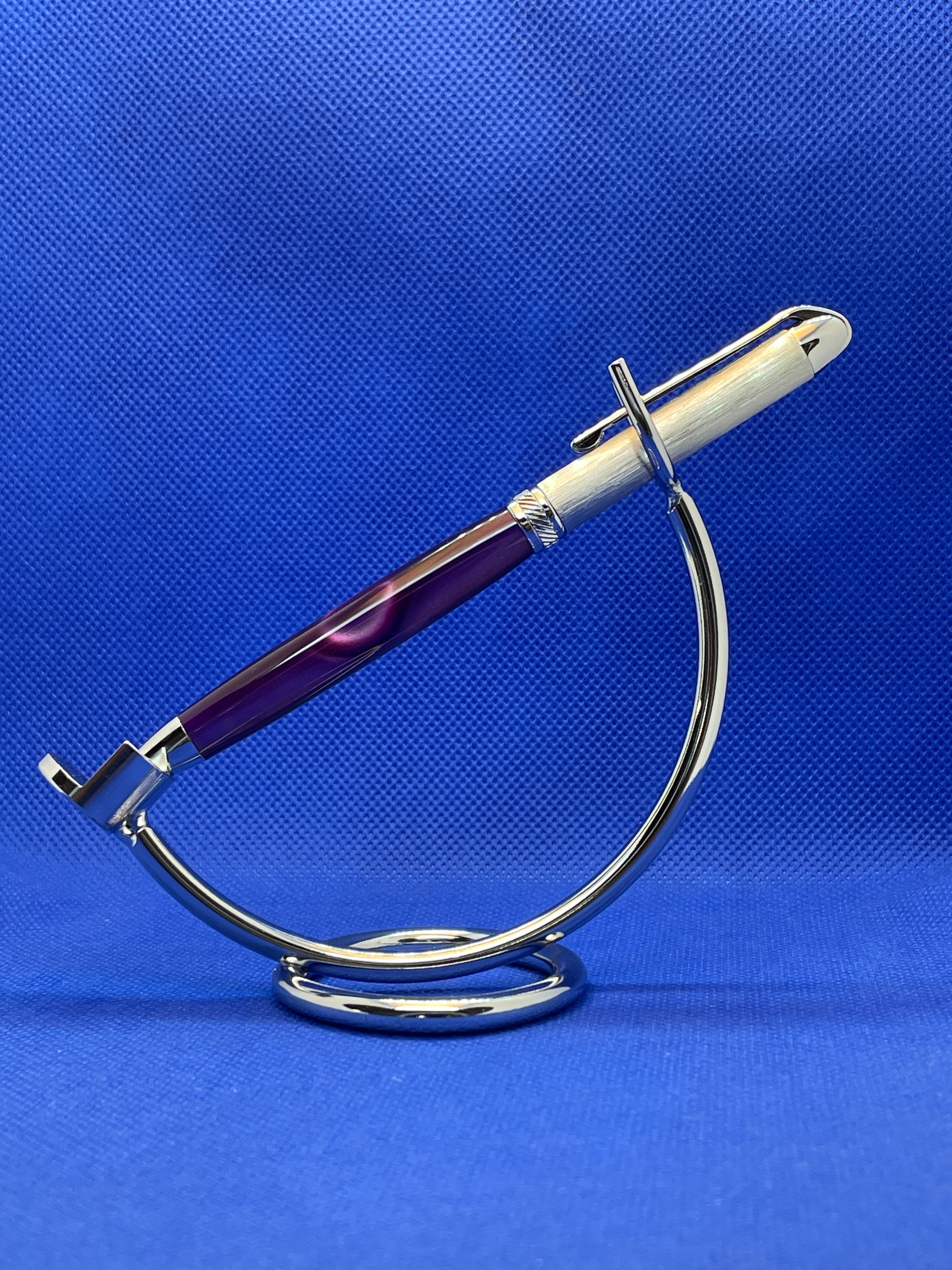This Surfix Duo ballpoint pen features two-tone brushed and polished chrome trim with an articulated clip and a "Purple Shimmer" acrylic body. It is a slim, lightweight pen that is ideal for carrying in a purse or pocket. It uses standard Cross style refills.