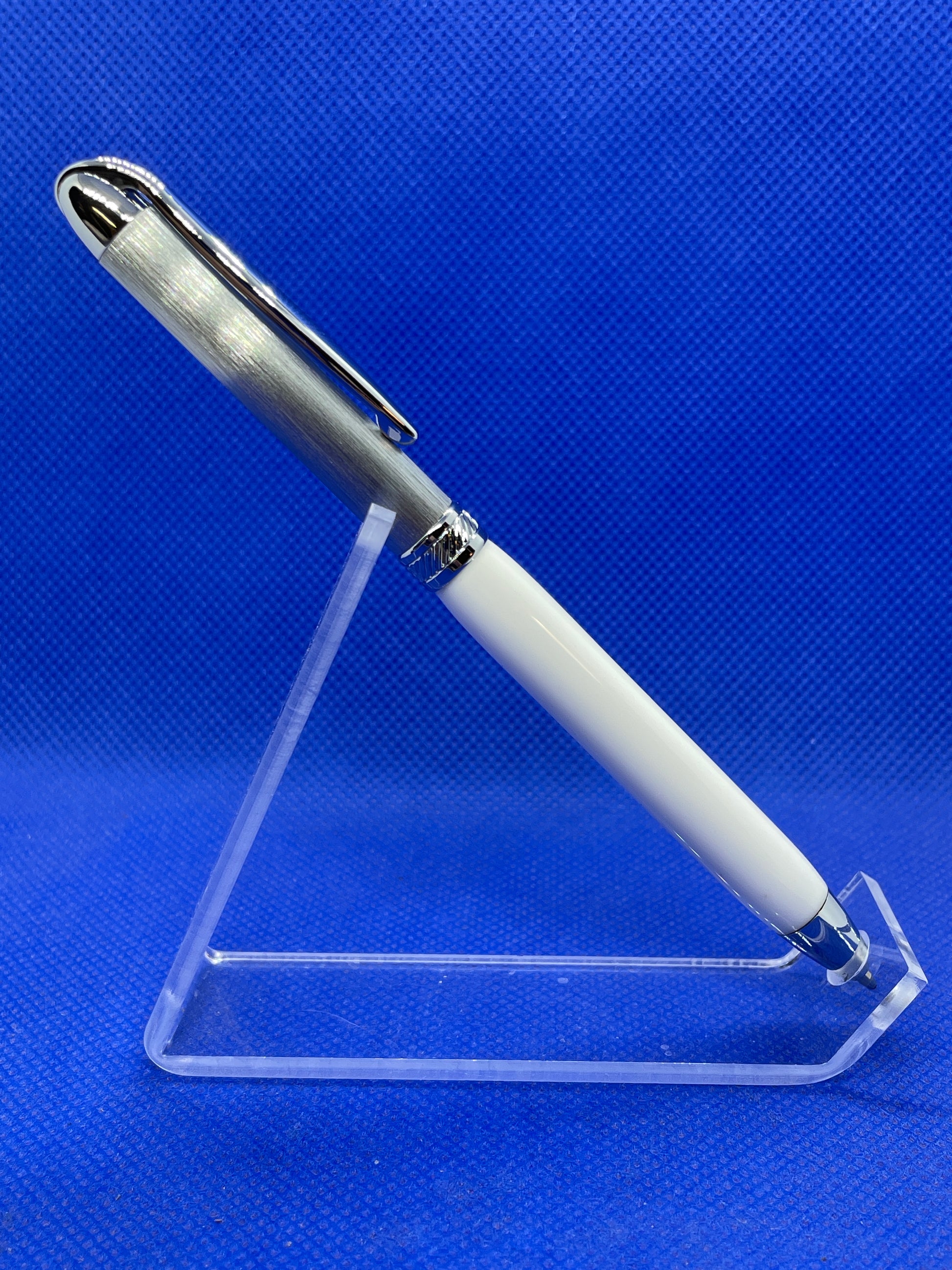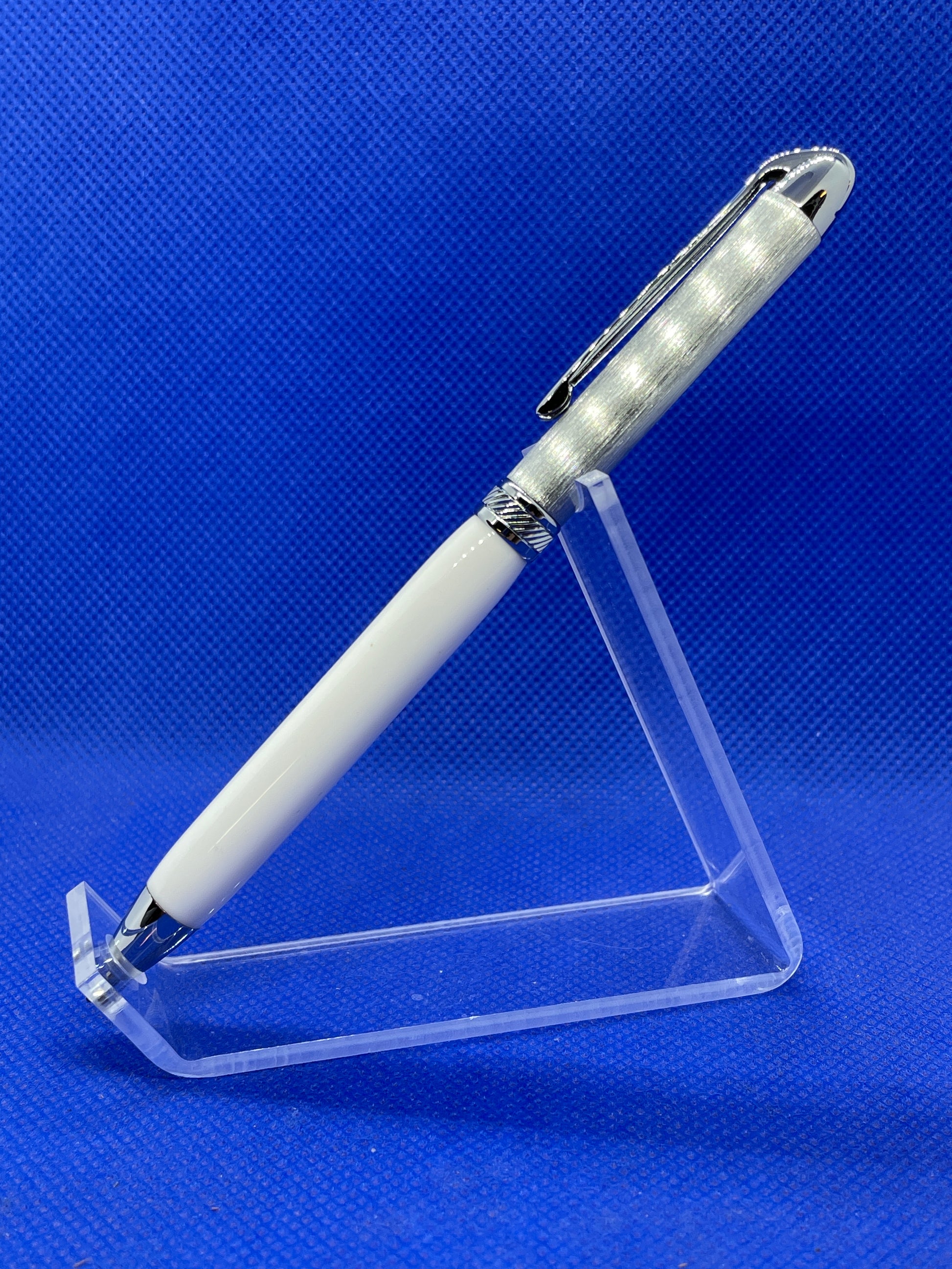 This Surfix Duo ballpoint pen features two-tone brushed chrome trim with an articulated clip and a "White Wedding" acrylic acetate body. It is a slim, lightweight pen that is ideal for carrying in a purse or pocket. It uses standard Cross style refills.