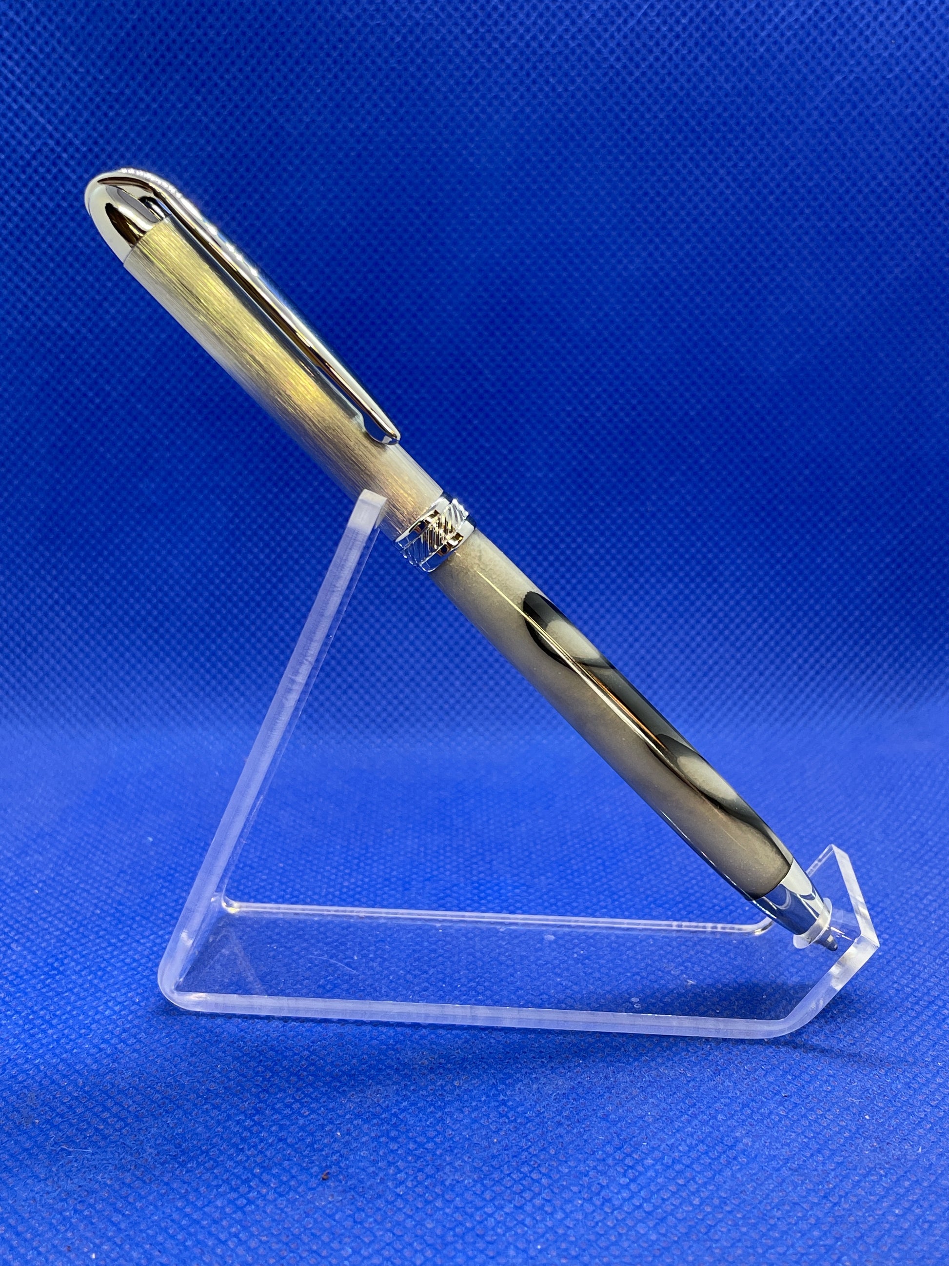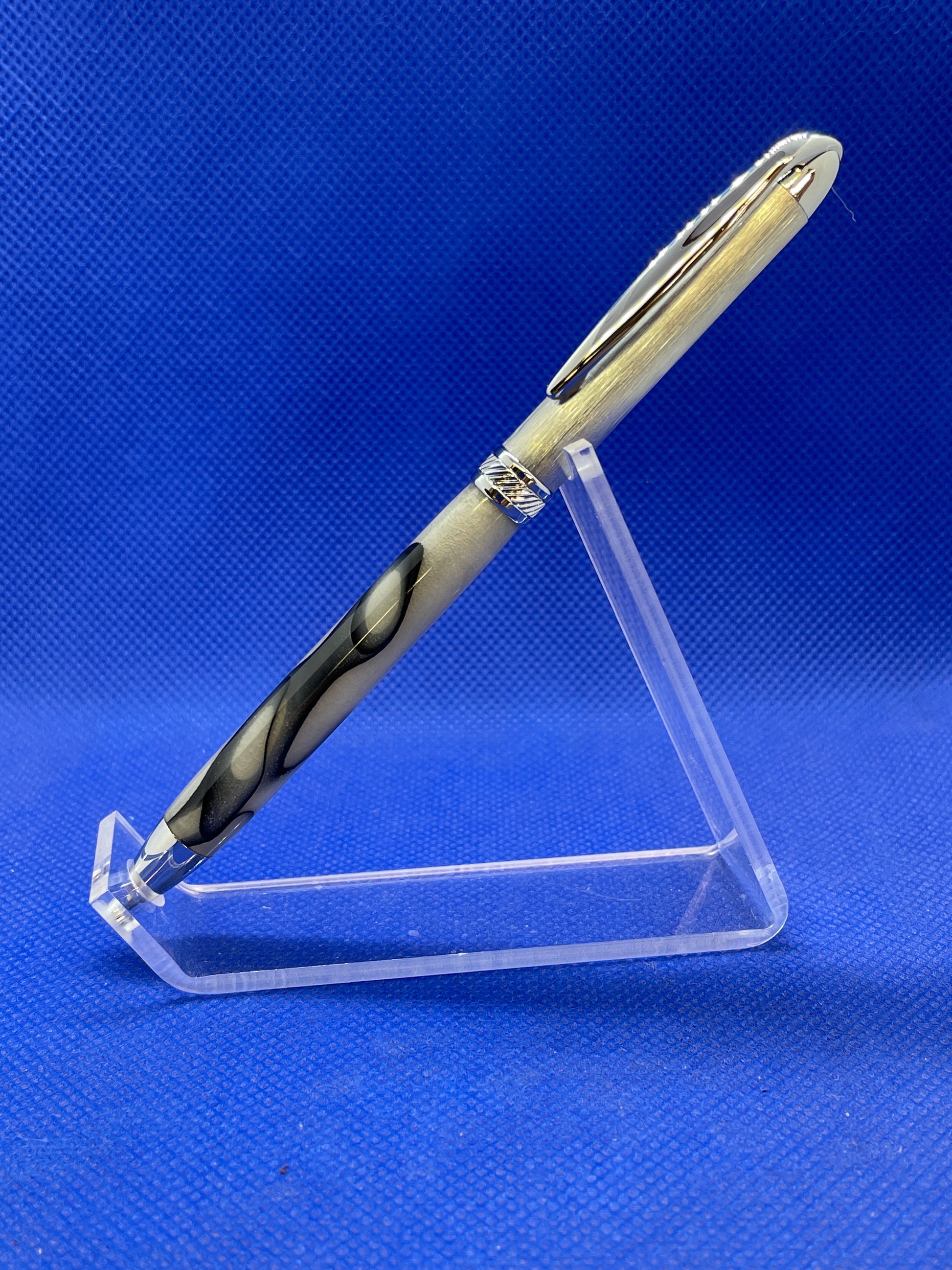 This Surfix Duo ballpoint pen features two-tone brushed chrome trim with an articulated clip and a "Black and White Pearl" acrylic acetate body. It is a slim, lightweight pen that is ideal for carrying in a purse or pocket. It uses standard Cross style refills.