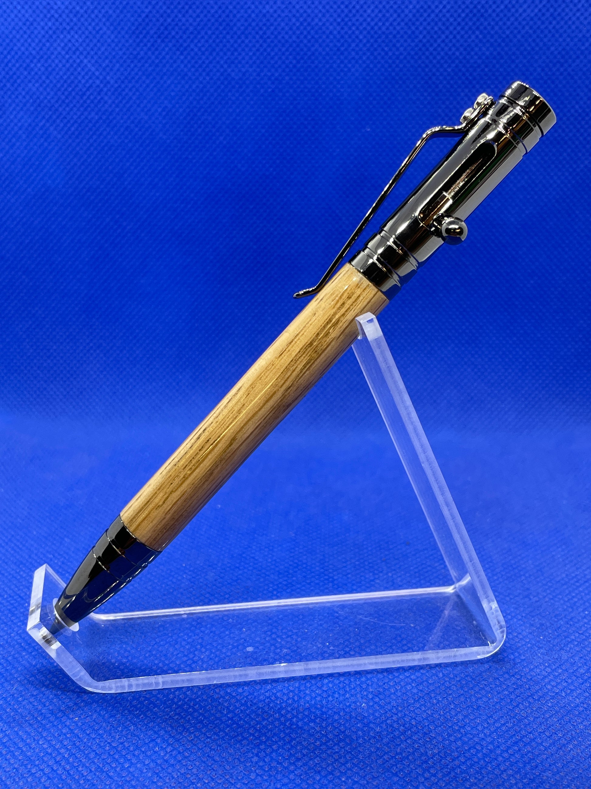 The useful bolt action ballpoint pen features gun metal trim and a body made from a whisky barrel stave. It comes with an option stylus tip for the clip end so you can instantly switch from writing on paper to use on any touch screen device. This pen uses a standard Parker style refill.
