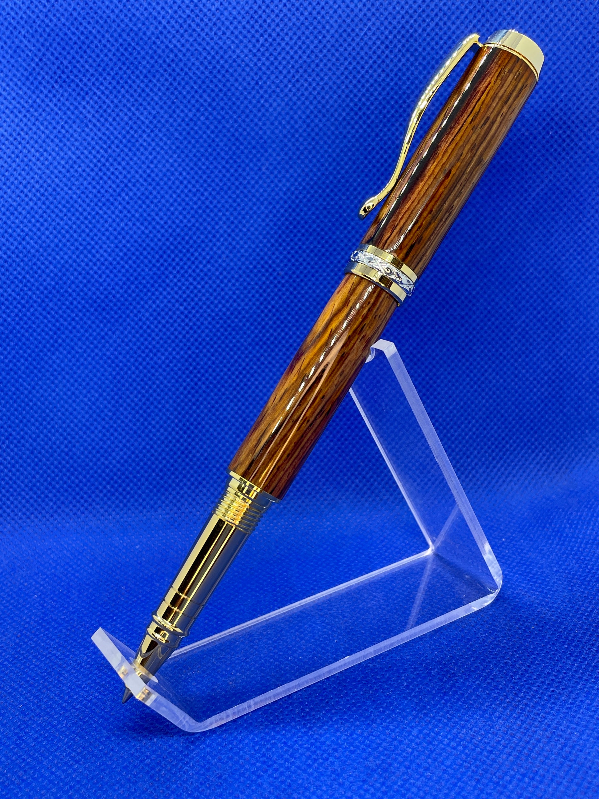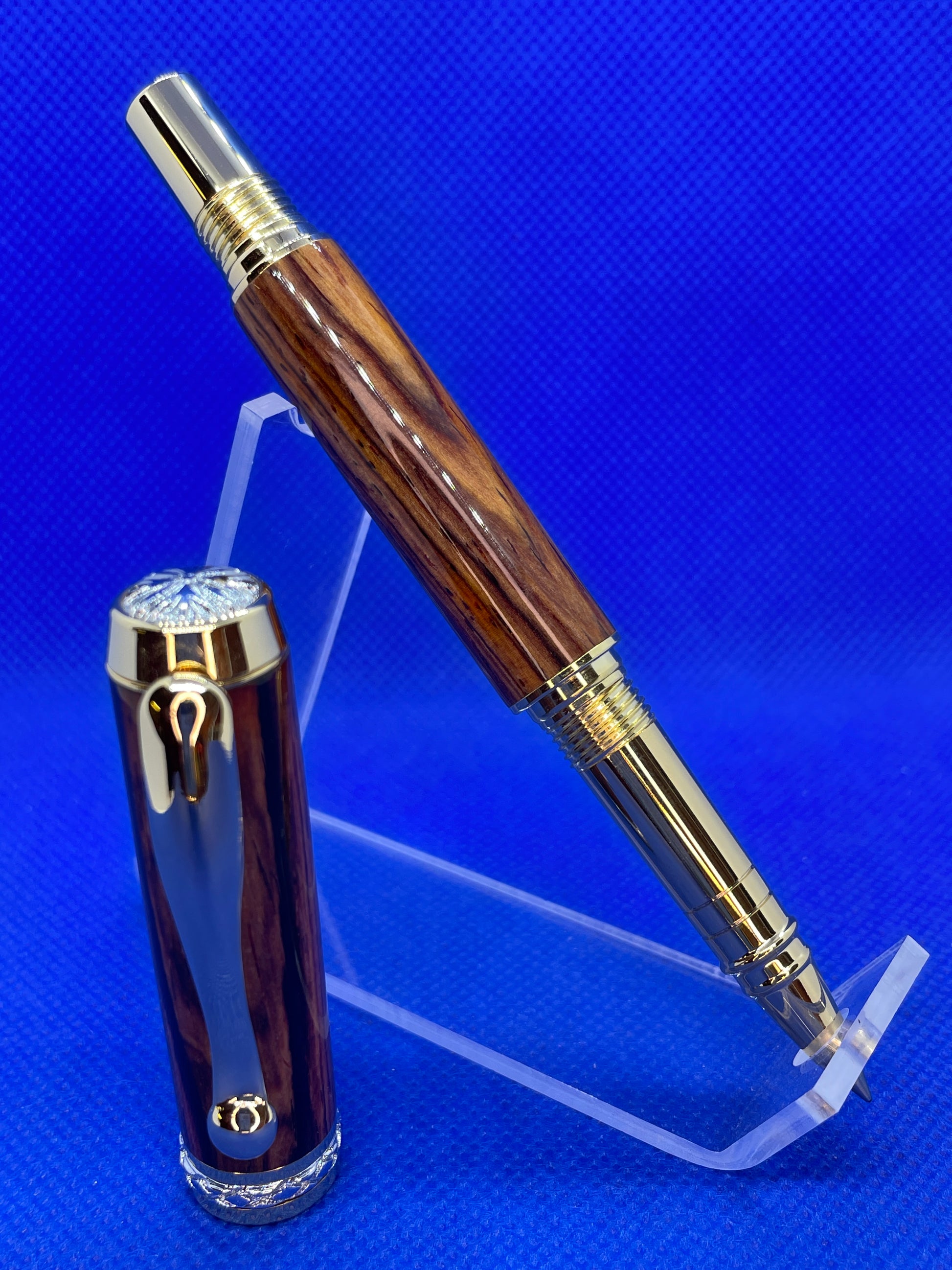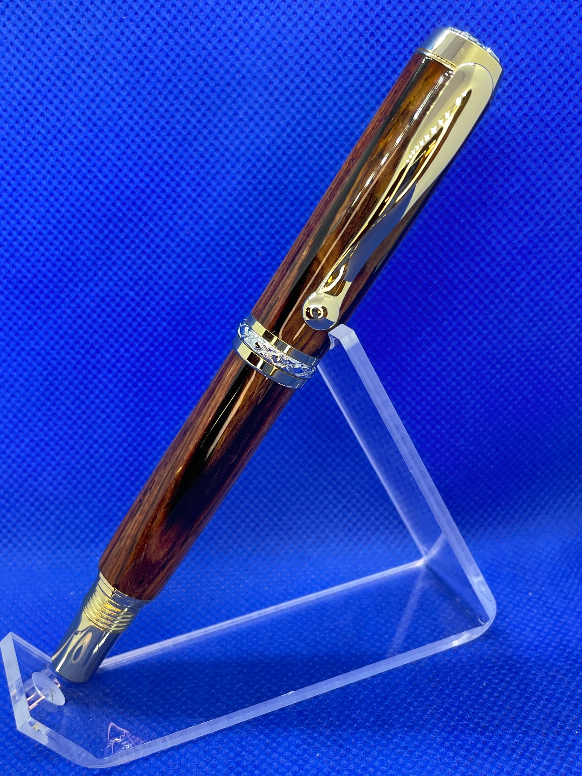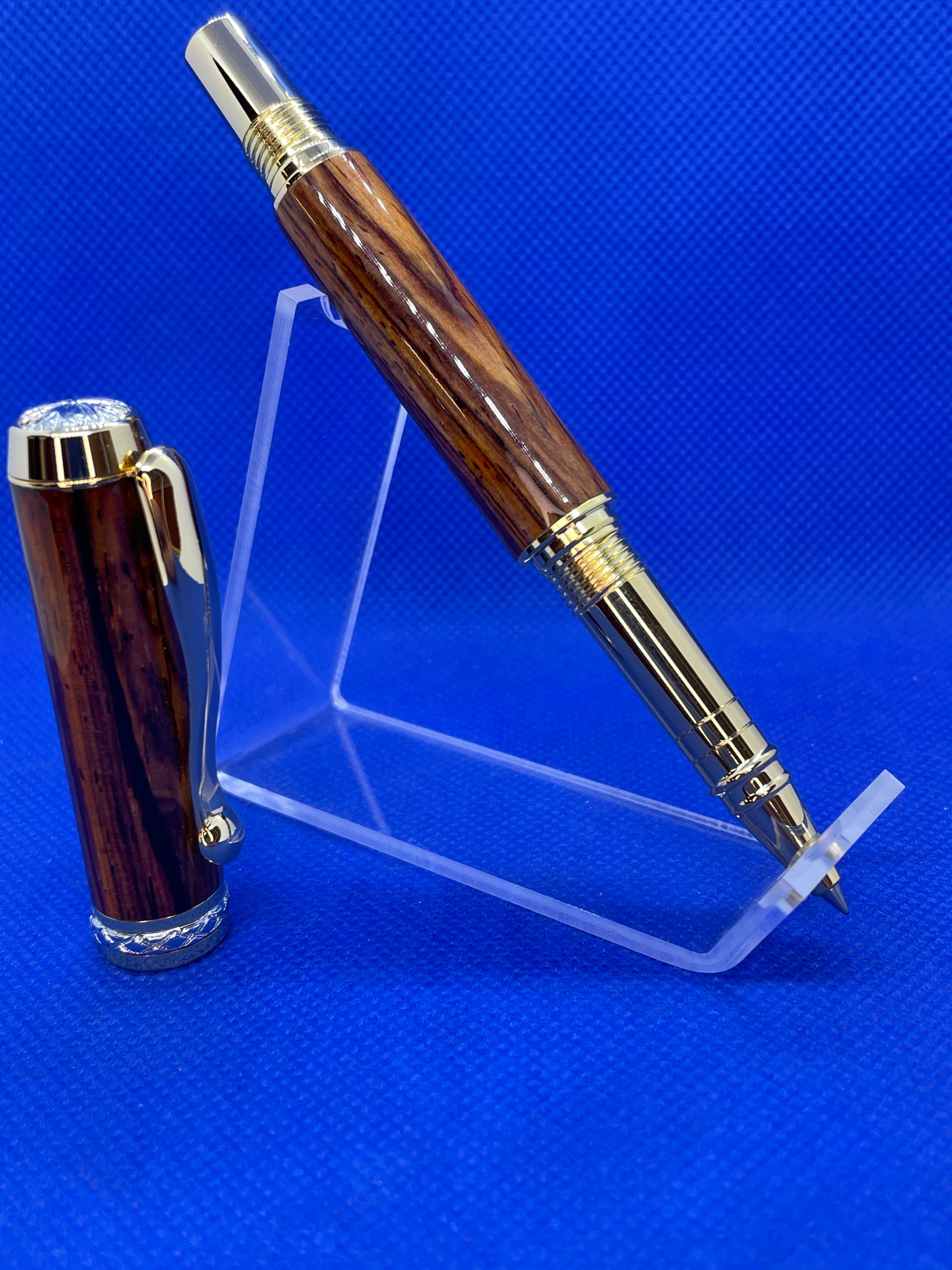This lovely Triton Rollerball two-piece pen features gold and chrome trim and a cocobolo body. The contrasting colours of the figuring on the cocobolo wood combined with the bright metalwork give this pen a refined and elegant feel. This pen uses standard "Schmidt" style rollerball refills.