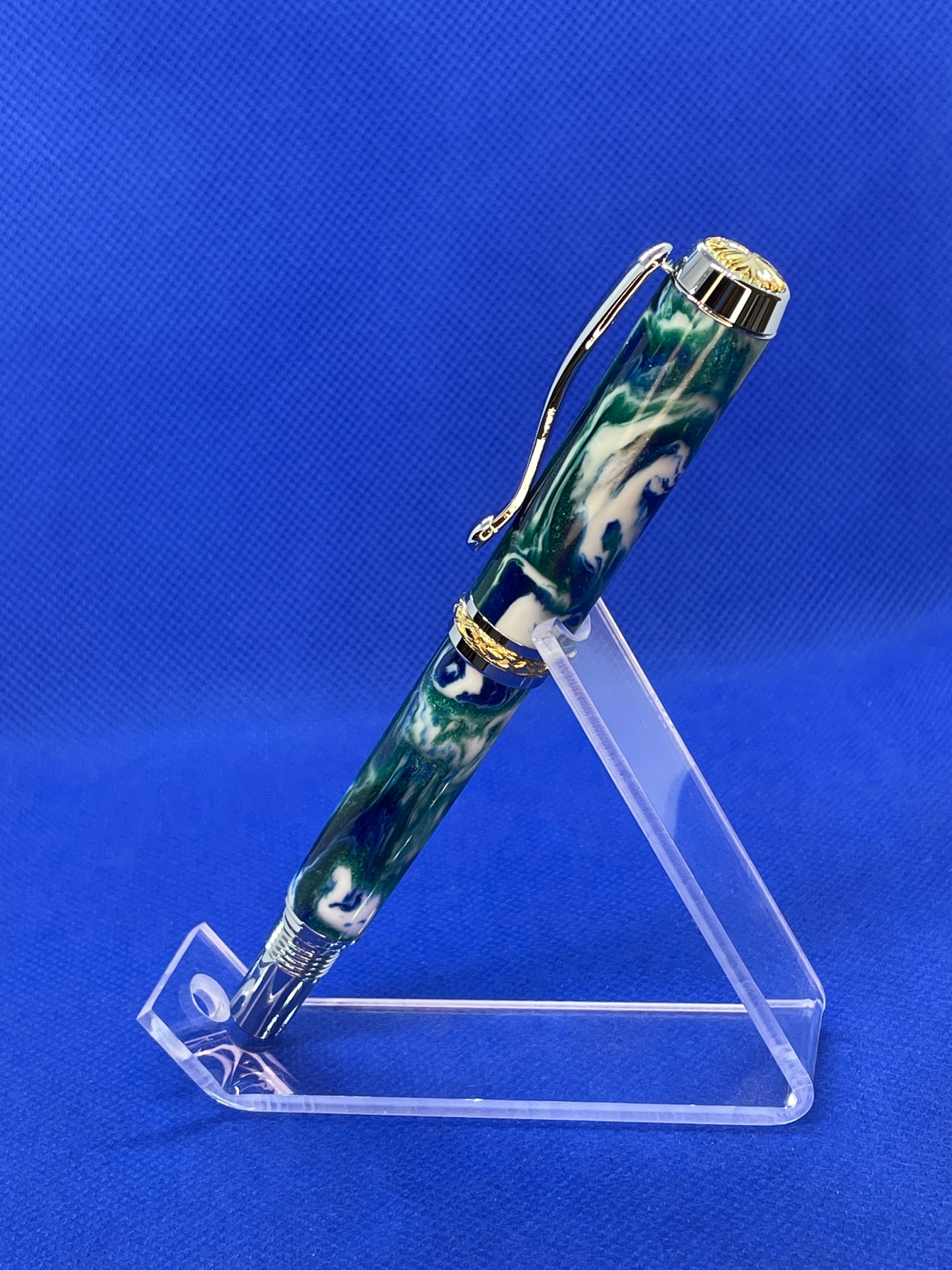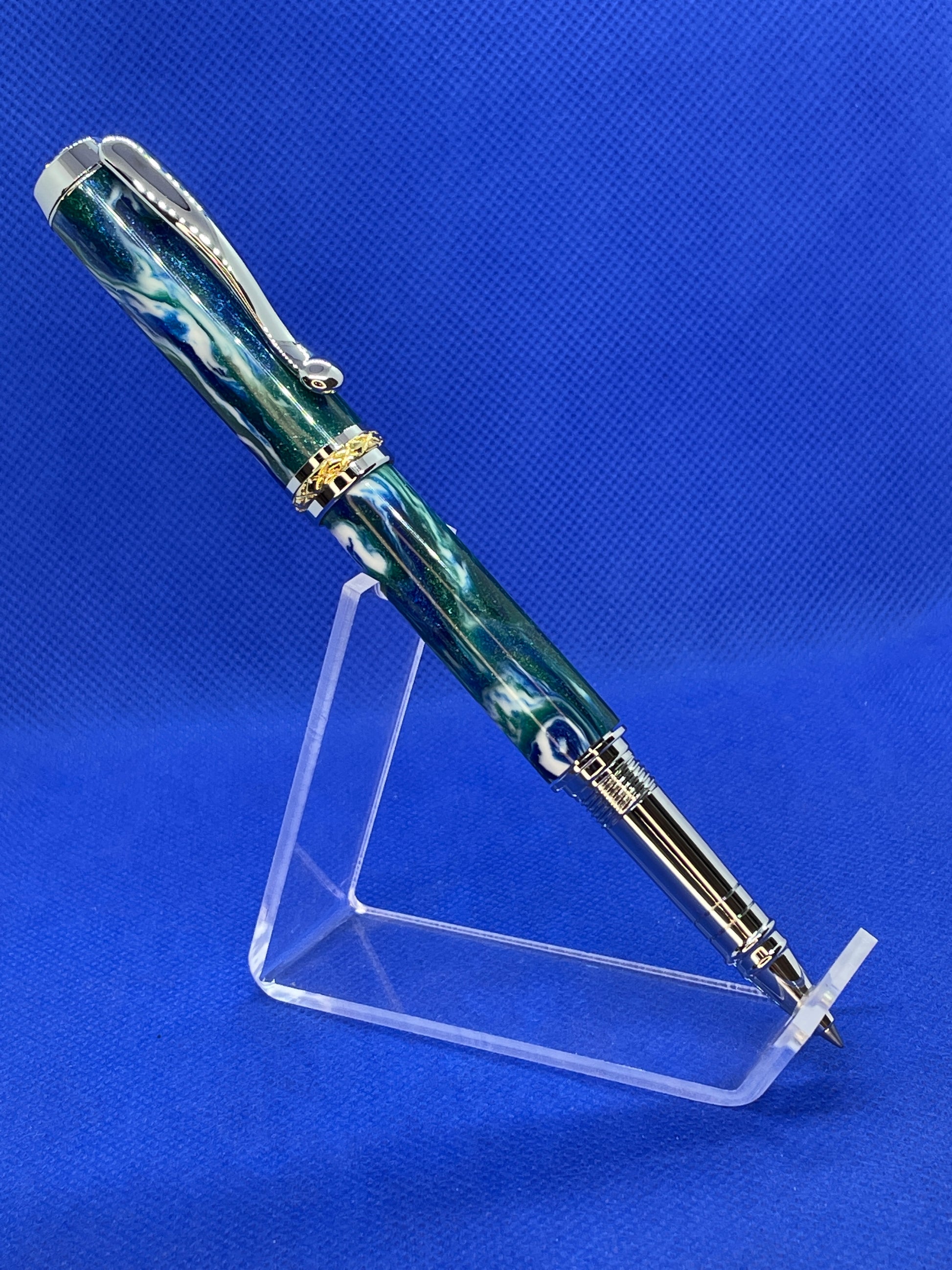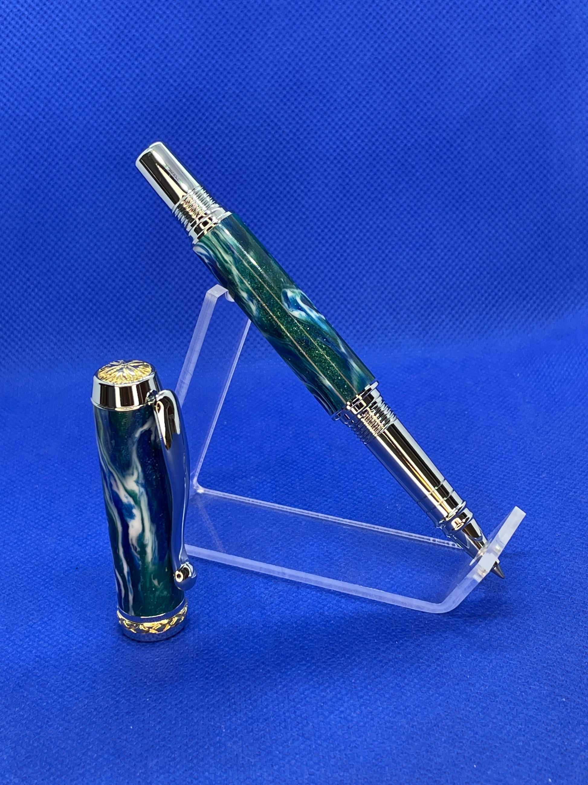 This lovely Triton Rollerball two-piece pen features chrome and gold trim and a "Diamondcast- Satellite" body. "Diamondcast" is an acrylic material with suspended diamond particles throughout. Combined with the swirled colours, the diamonds give amazing sparkle and brilliance to the pen. This pen uses standard "Schmidt" style rollerball refills.