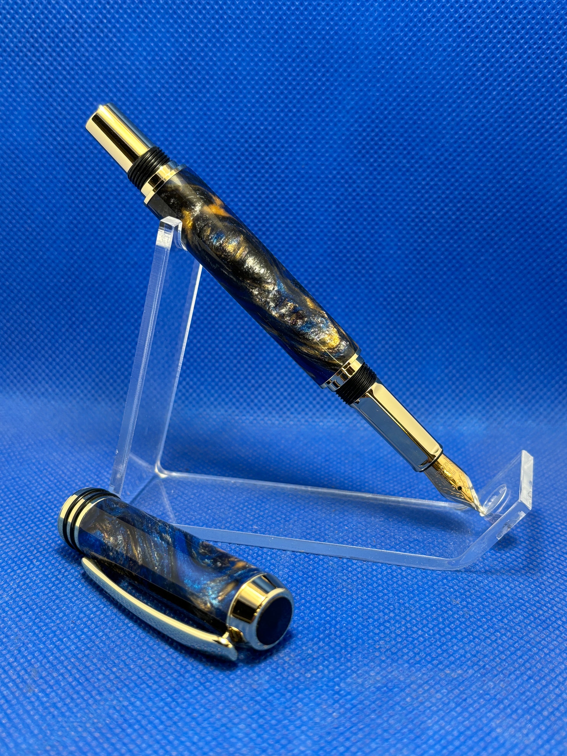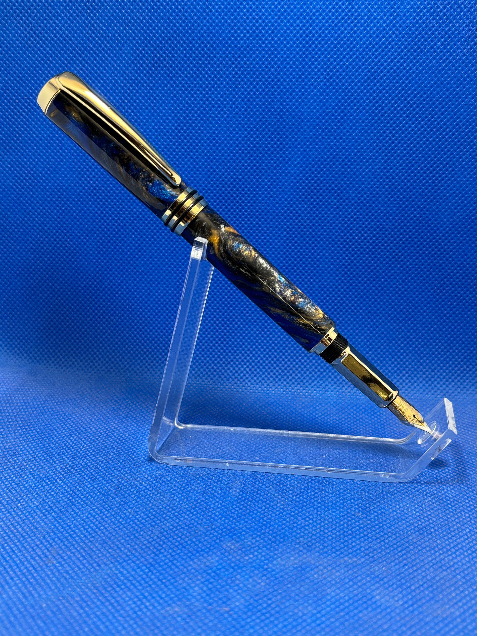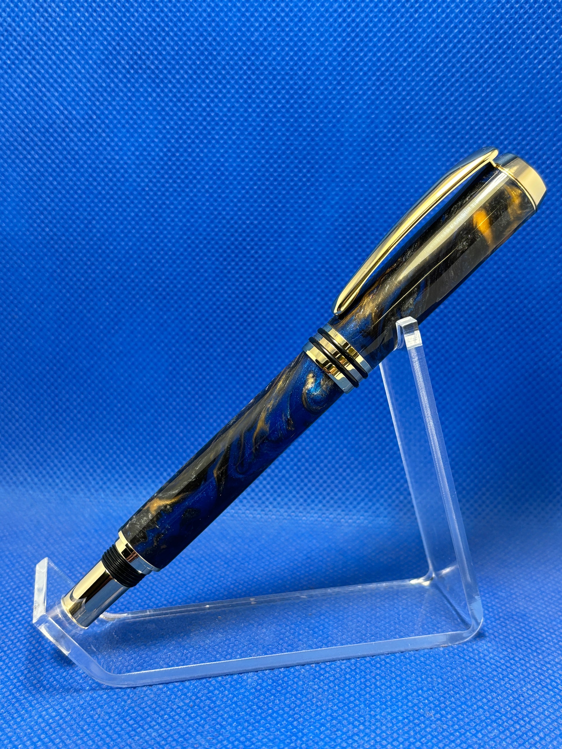 This fountain pen features a "Sapphire and Gold" resin body with gold trim and a black cabochon on the cap. This is a beautiful and elegant pen that uses either universal fountain pen cartridges, or an included ink pump for filling from an ink bottle.