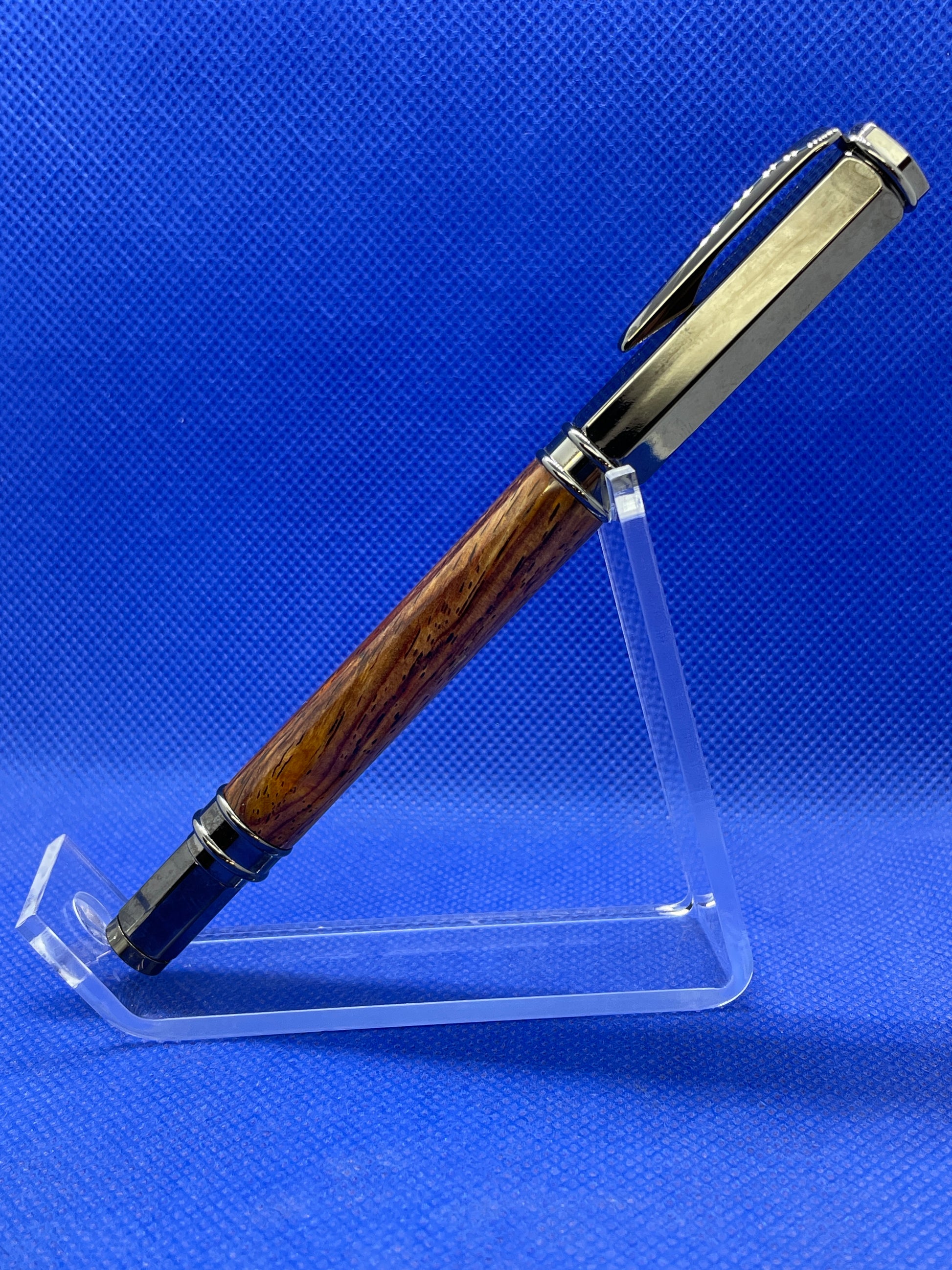 This Vertex fountain pen features gun metal metalwork and a beautiful Cocobolo body. The hexagonal cap is magnetically postable on both the nib or end finial. The pen uses ink cartridges or an included refillable ink reservoir.