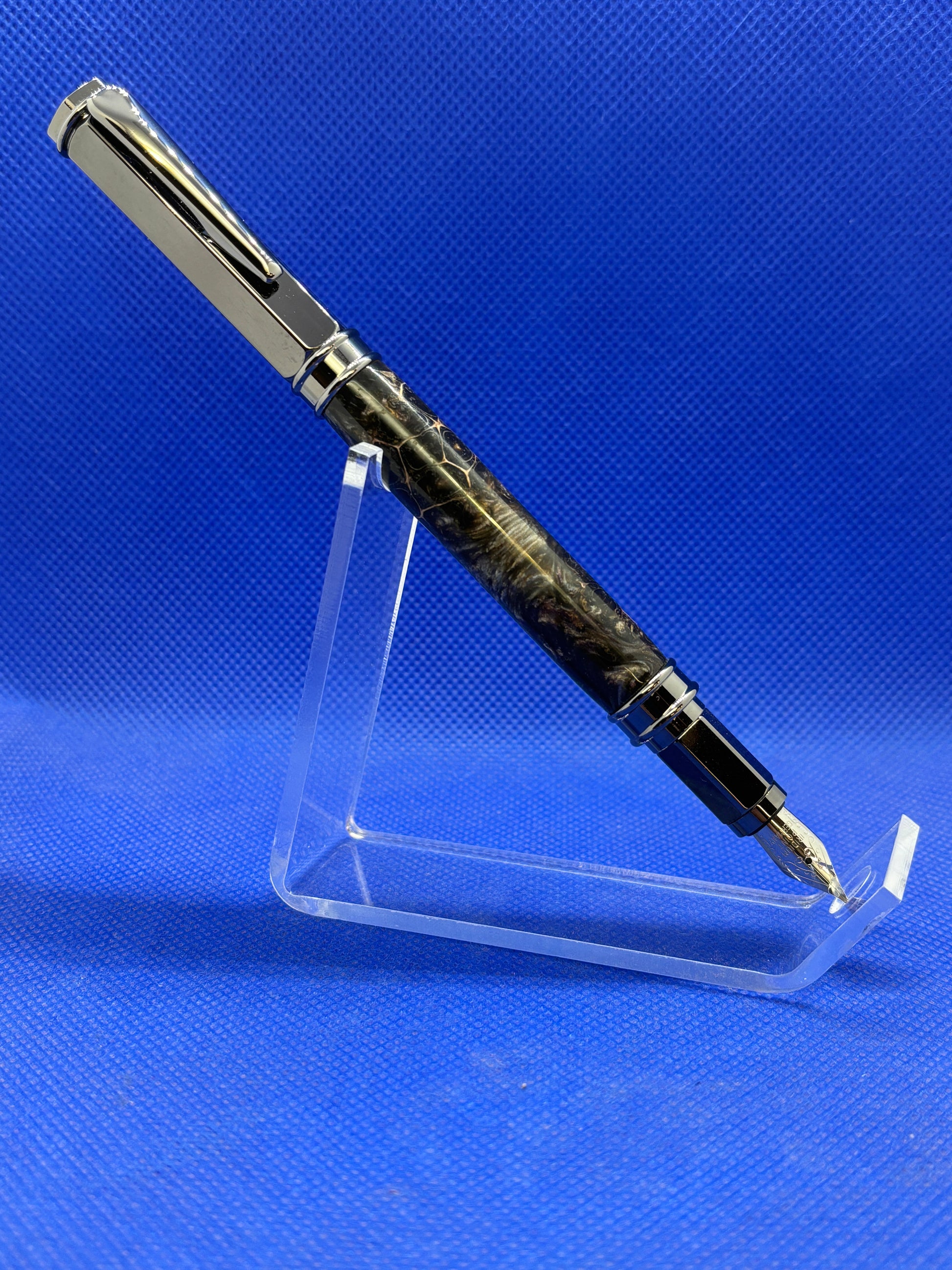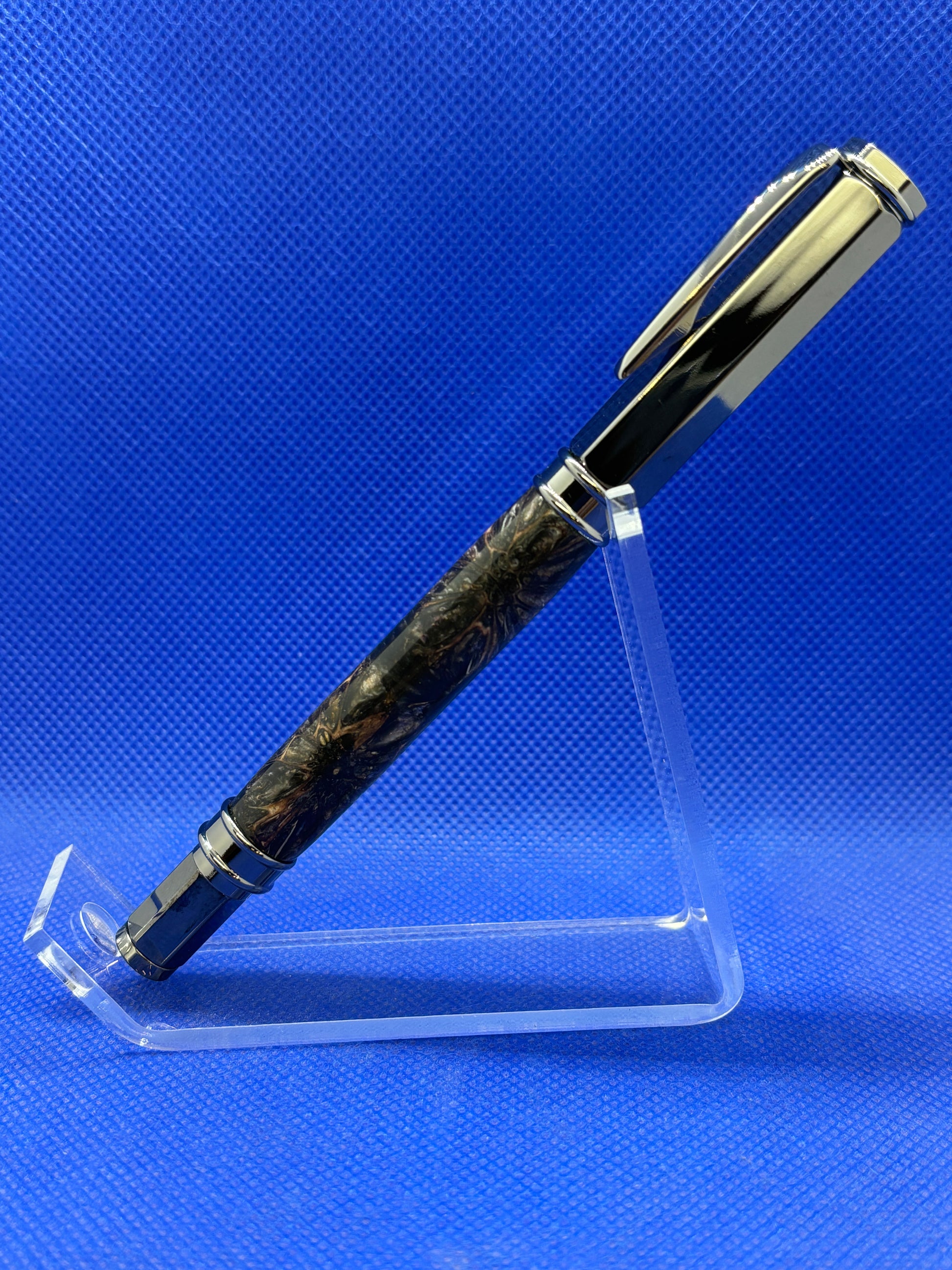 This Vertex fountain pen features gun metal metalwork and a body made from a Sweet Gum Pod encased in resin. The cap is magnetic so it posts on either end of the pen quickly and easily. The pen uses either an included ink converter for use with bottled ink or universal style ink cartridges.