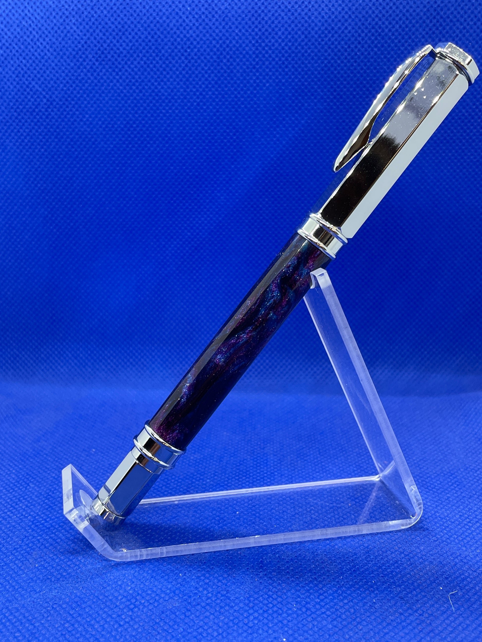 This Vertex fountain pen features chrome metalwork and an "Orion" DiamondCast resin body. DiamondCast resin contains real diamond flakes that are collected from the diamond cutting process. These diamond flakes give the pen a spectacular sparkle. The cap is magnetically postable on the nib or end finial. The pen uses ink cartridges or an included refillable ink reservoir.