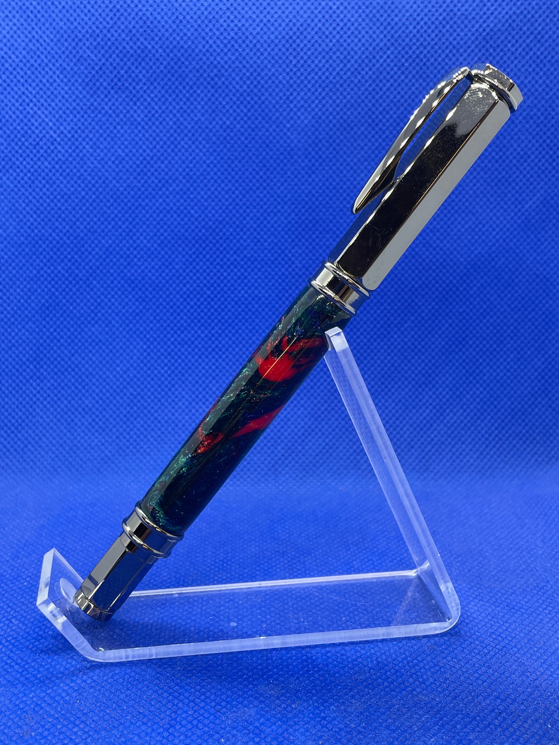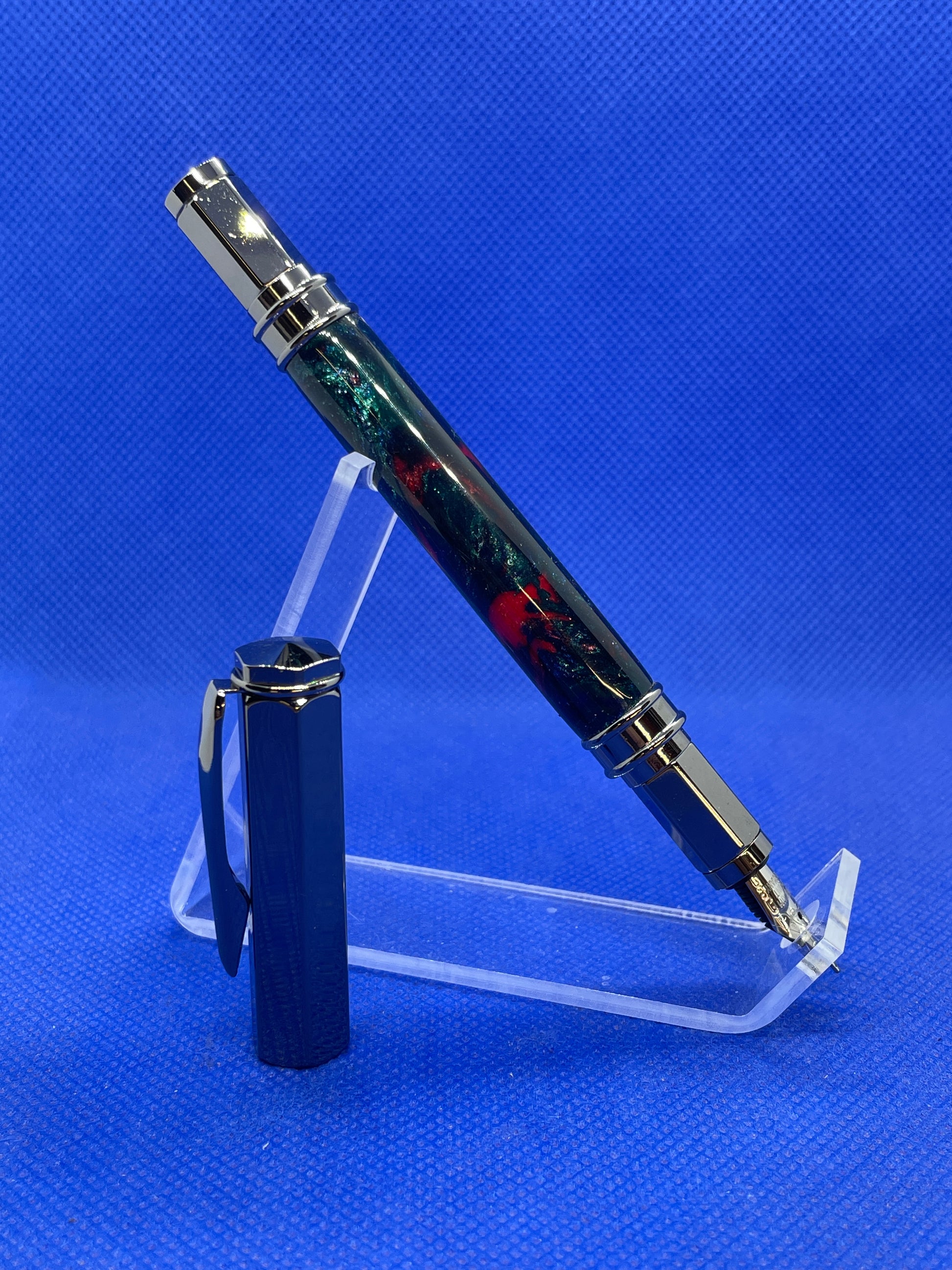 This Vertex fountain pen features gun metal metalwork and a rich "Lava Lamp Supernova" resin body. This combination is truly eye catching. The cap is magnetic so it posts on either end of the pen quickly and easily. The pen uses ink cartridges or an included refillable ink reservoir.