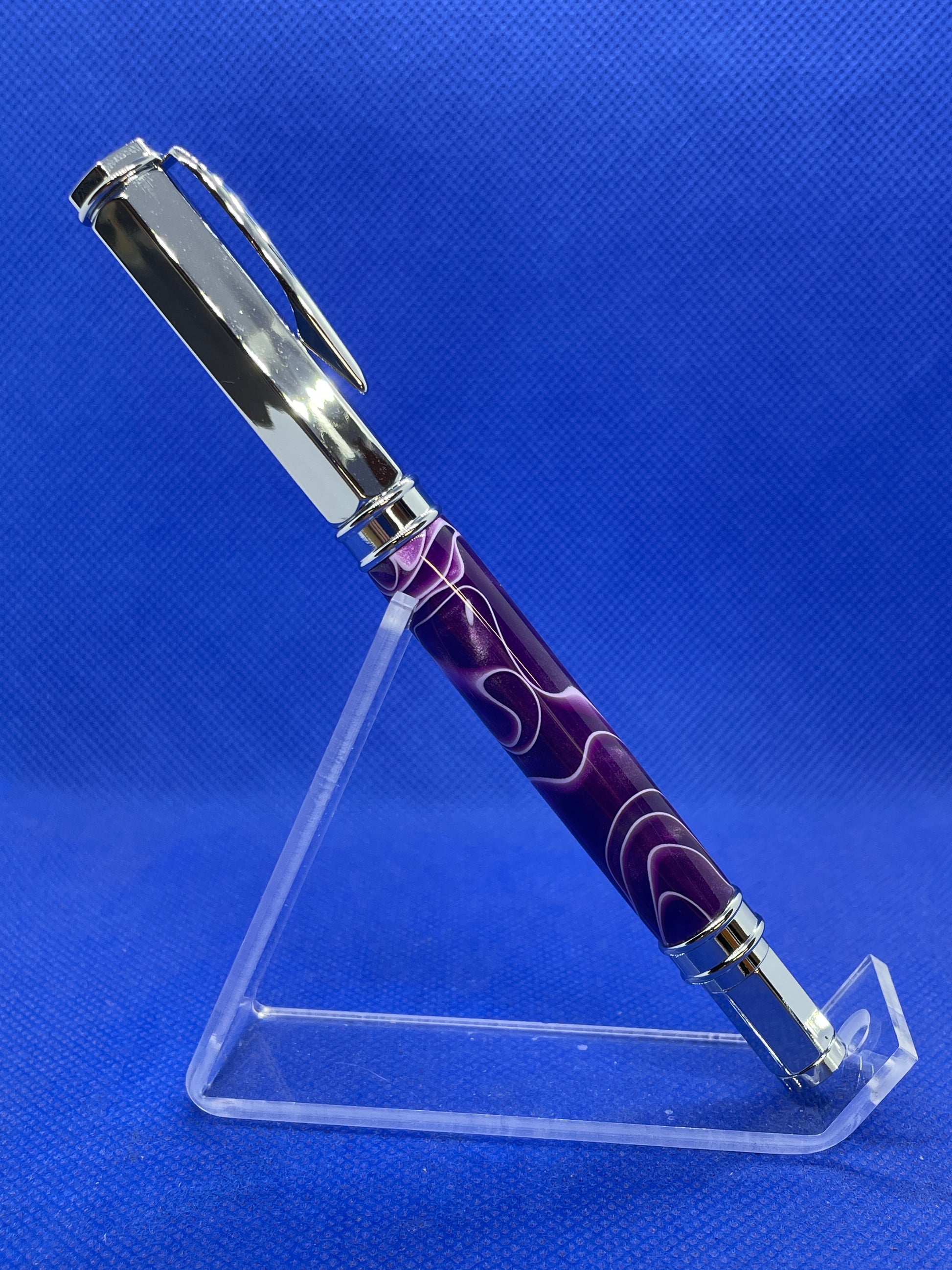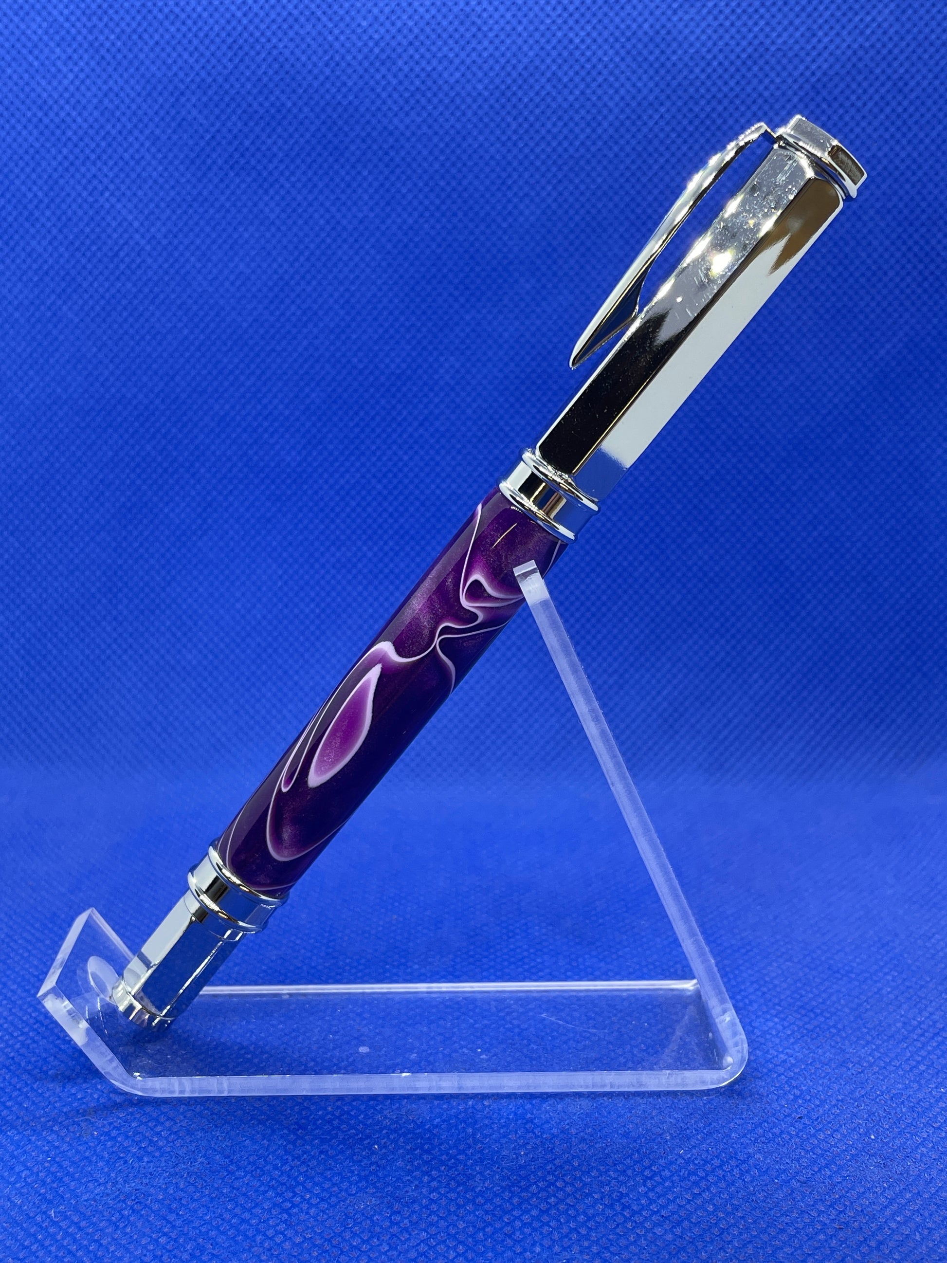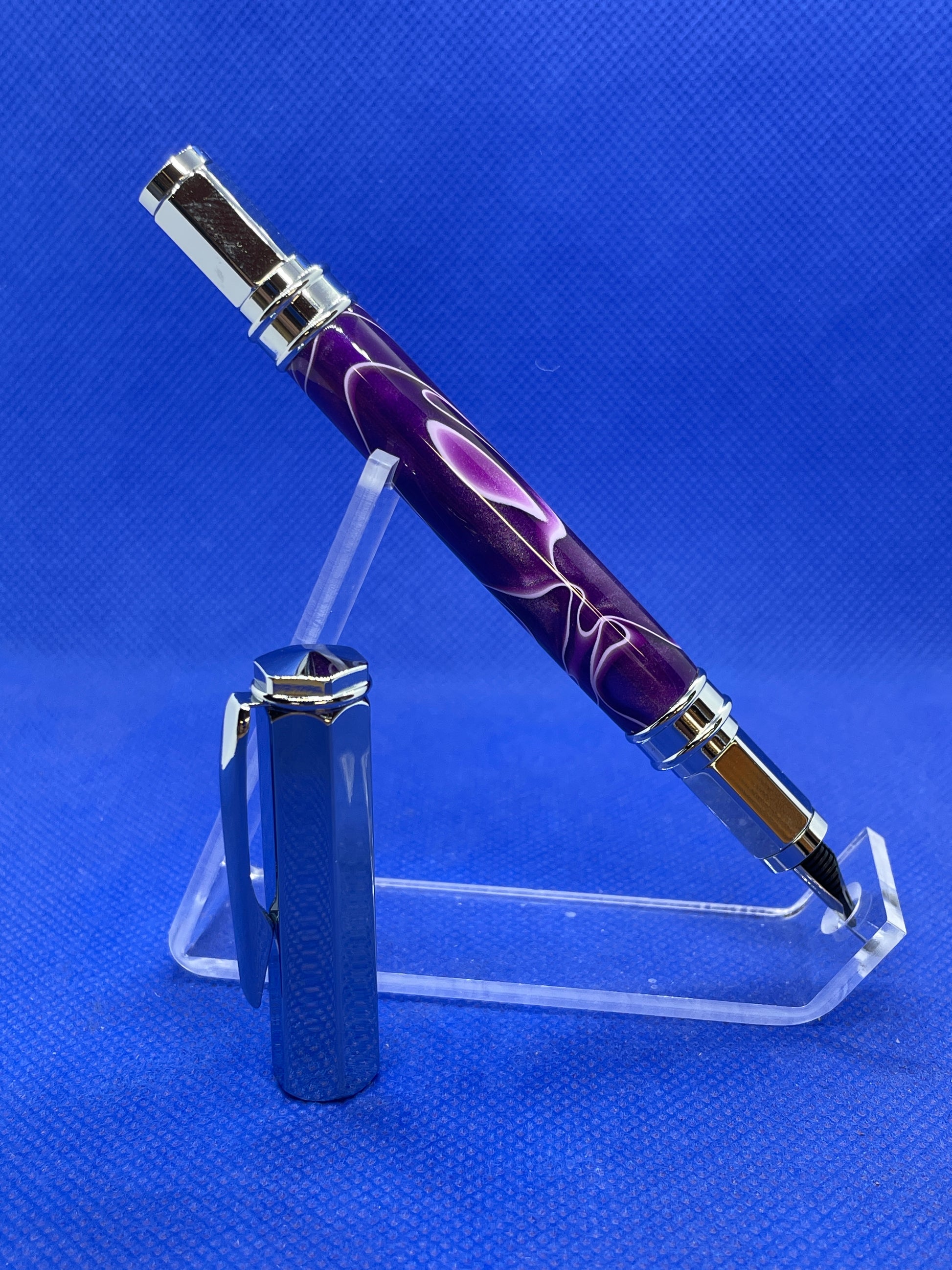 This Vertex fountain pen features chrome metalwork and a vibrant "Ultra Violet" acrylic acetate body. The cap is magnetic so it posts on either end of the pen quickly and easily. The pen uses ink cartridges or an included refillable ink reservoir.
