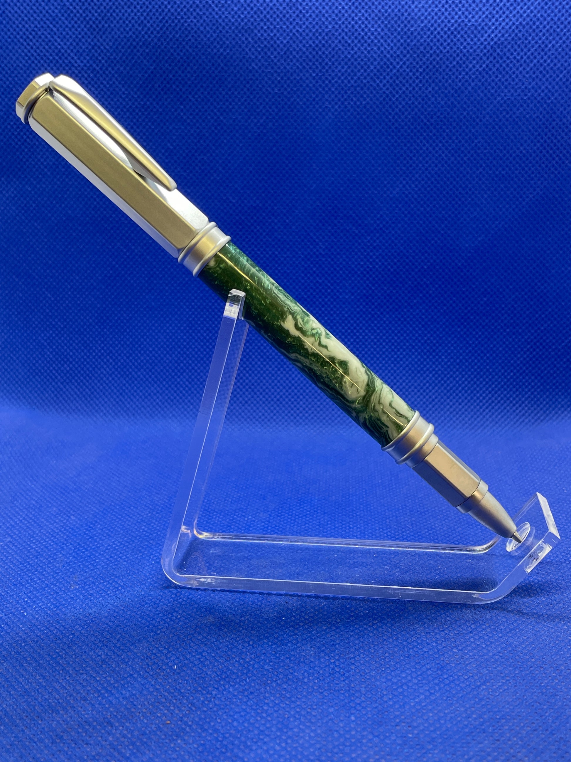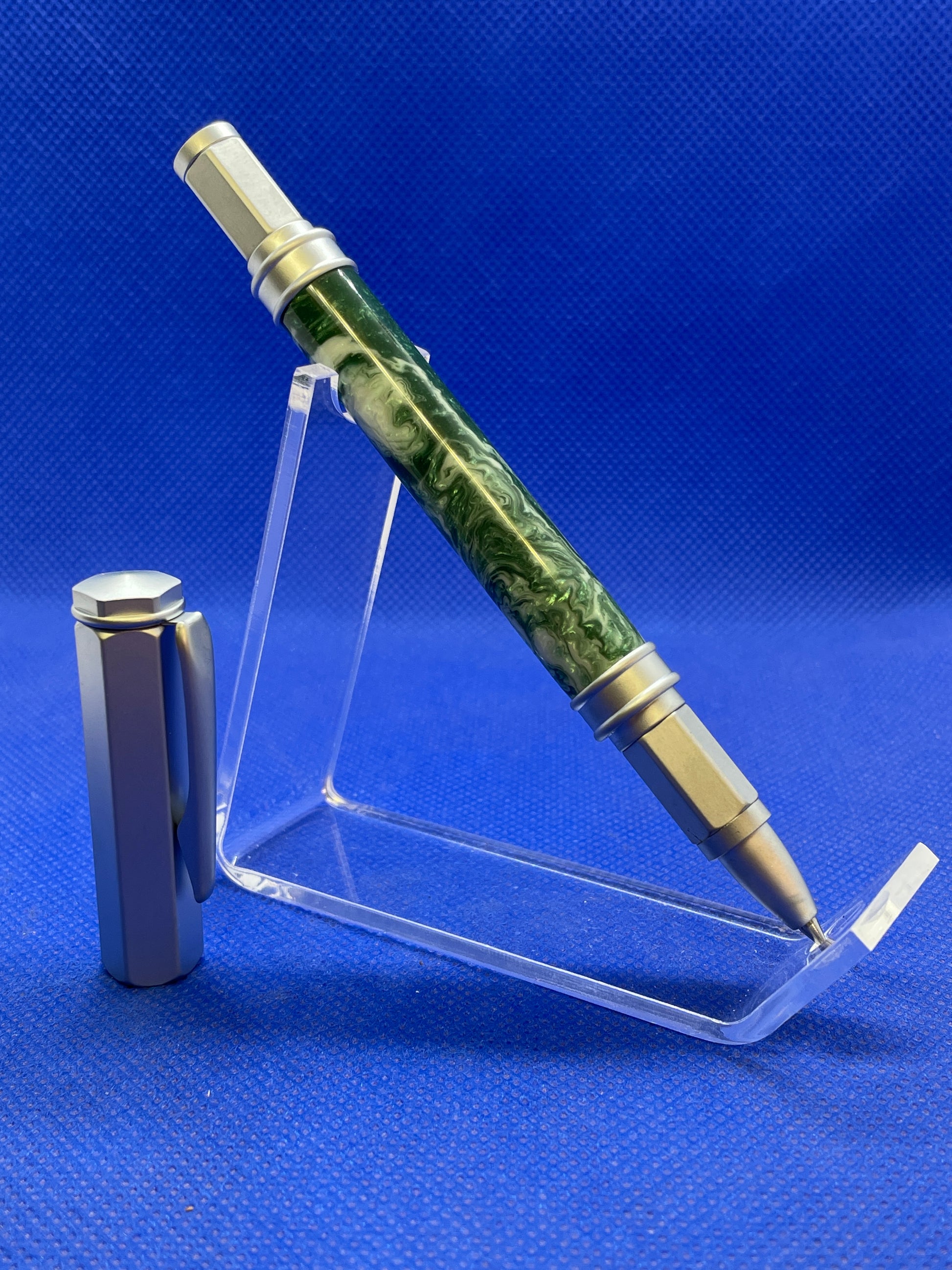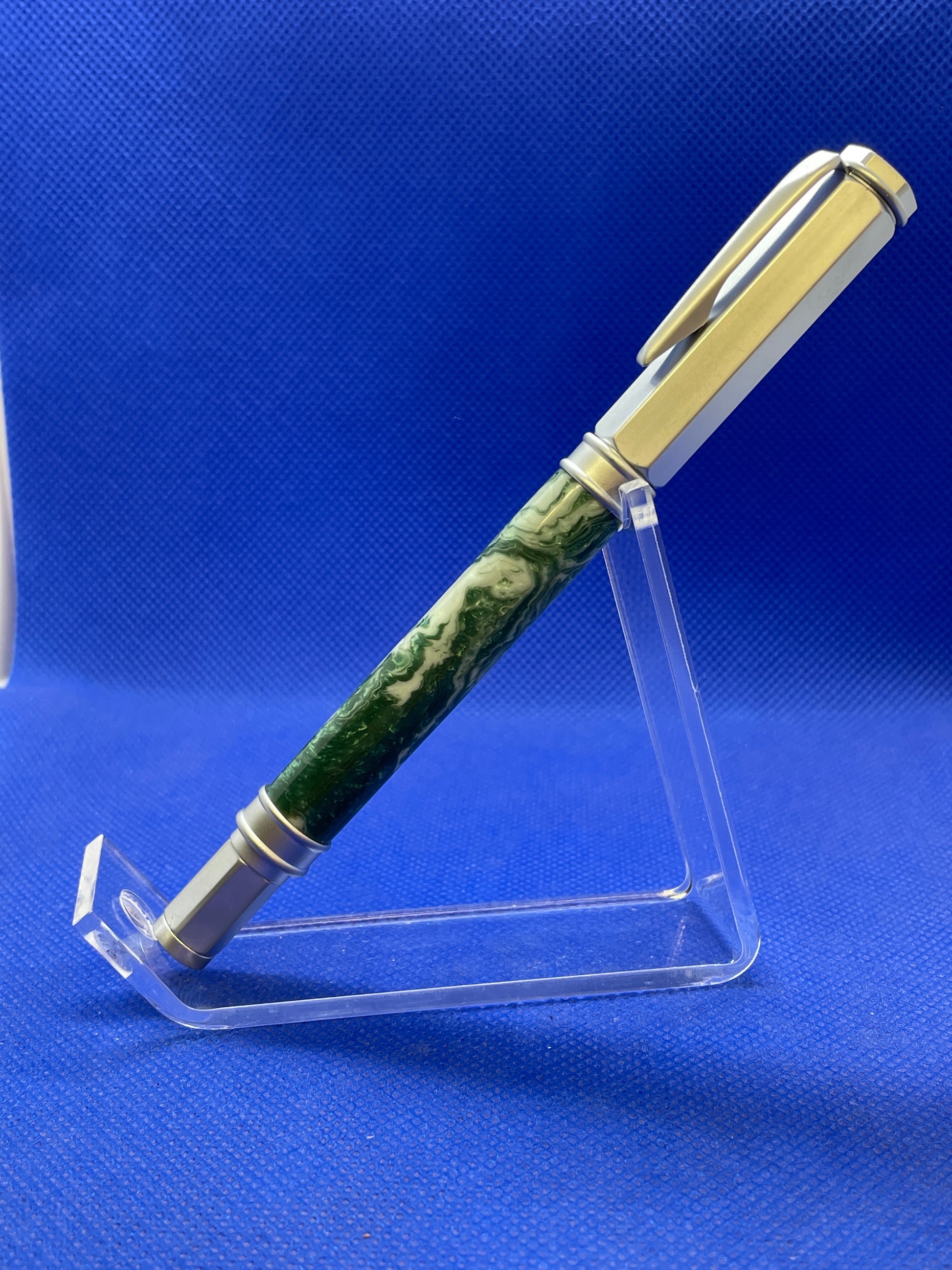 This Vertex rollerball pen features satin chrome metalwork and a "Celtic Mist" resin body. The cap is magnetic so it posts on either end of the pen quickly and easily. The pen uses a Schmidt style rollerball refill.