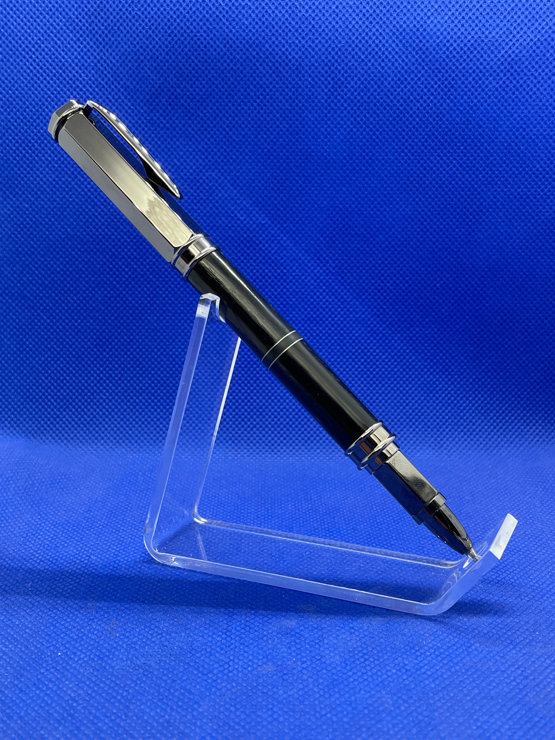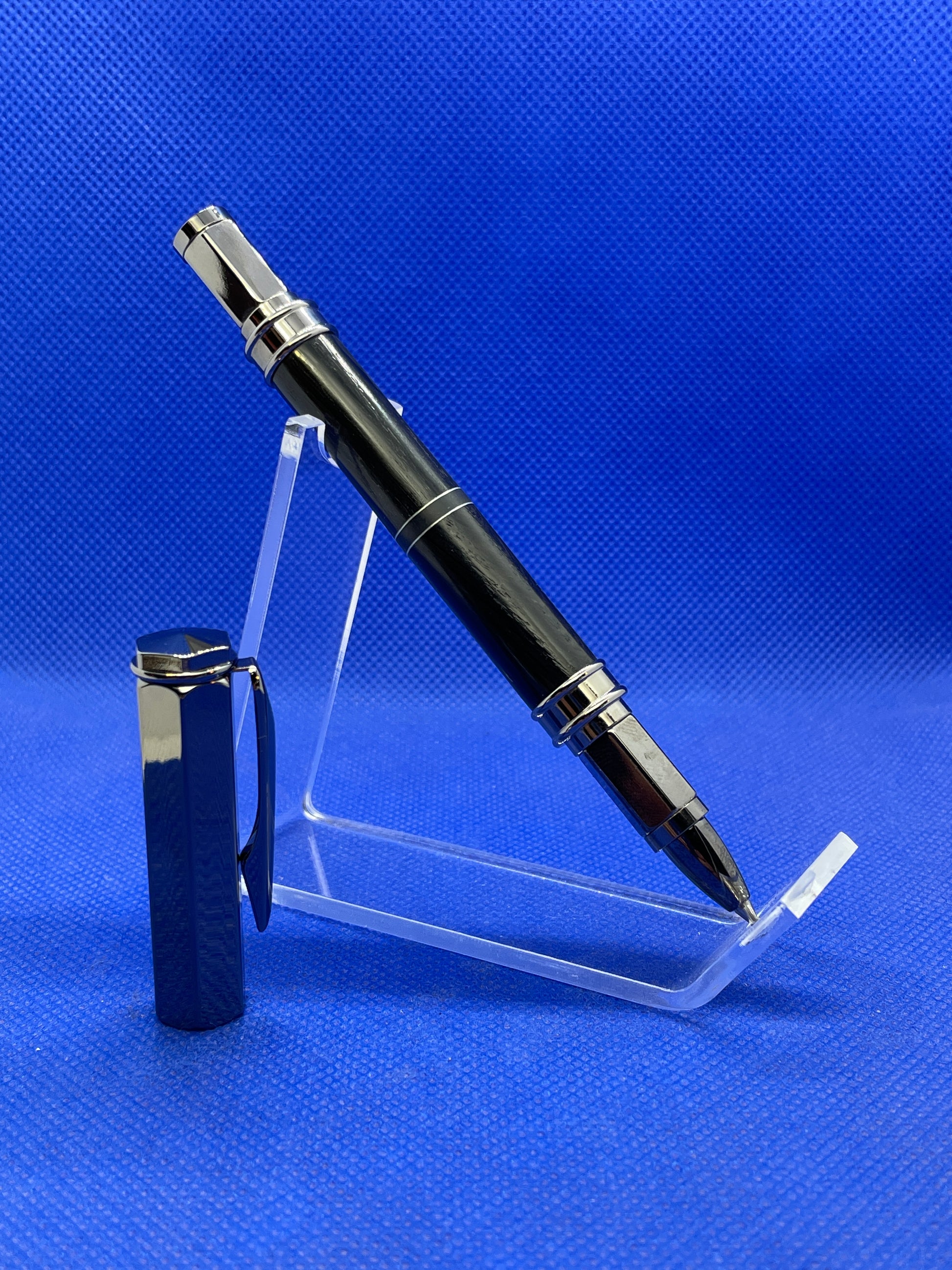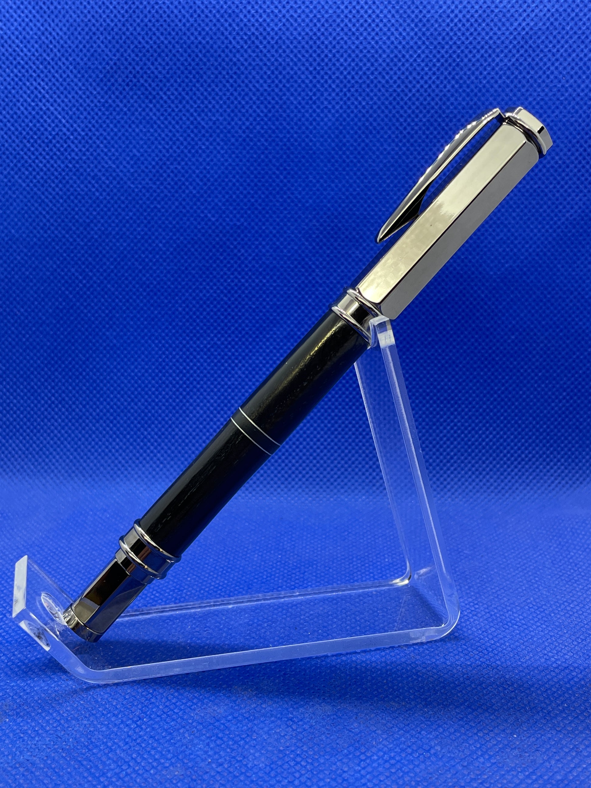 This Vertex rollerball pen features Gun Metal metalwork and a body made from 5500 year old Ukrainian Bog Oak with an aluminum inlay. This comes with a certificate of radio carbon dating to verify the wood's age. The cap is magnetic so it posts on either end of the pen quickly and easily. The pen uses a Schmidt style rollerball refill.