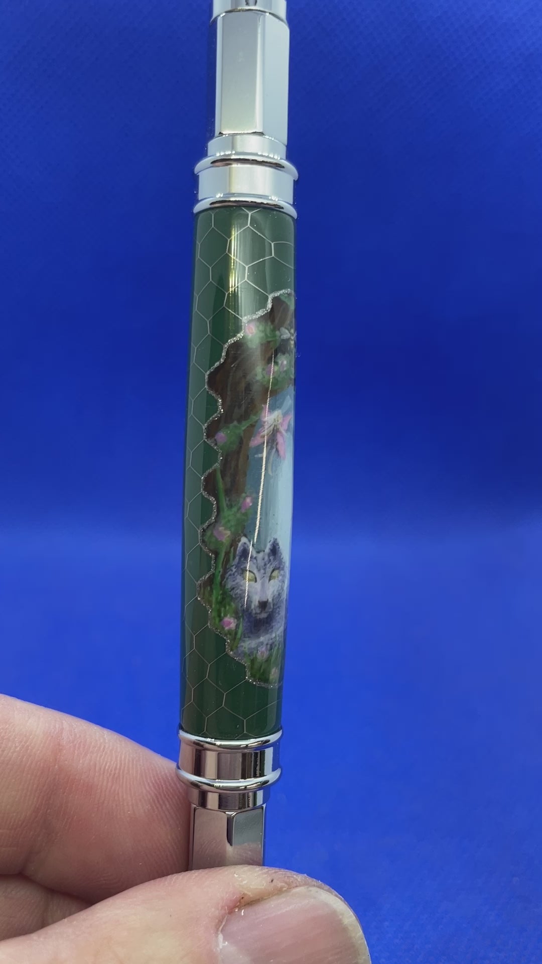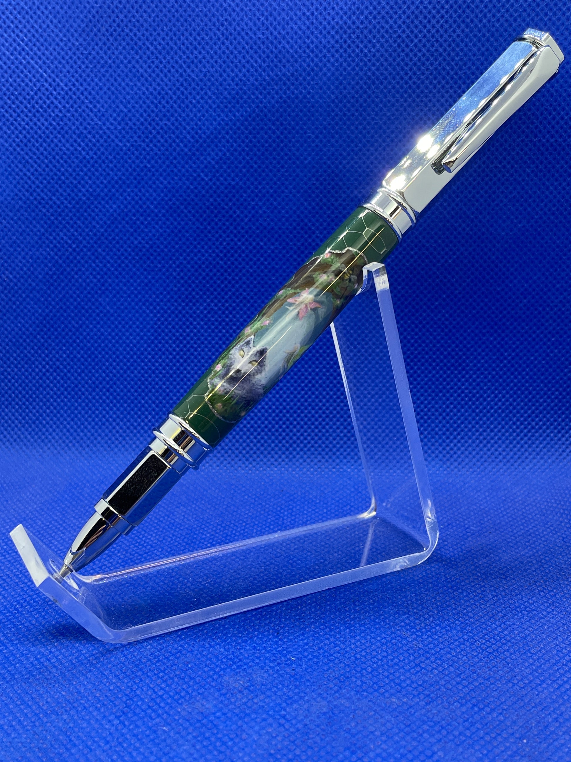 This stunning Vertex rollerball pen features chrome metalwork and a "Draco" aluminum honeycomb and green resin body. The cap is magnetic so it posts on either end of the pen quickly and easily. What makes this pen stand out is the custom hand painted fantasy design. It features........The pen uses a Schmidt style rollerball refill.