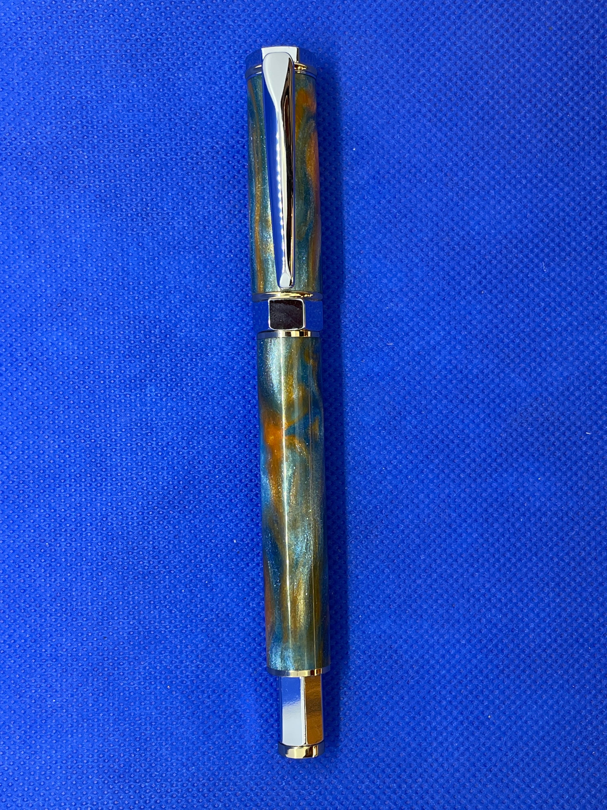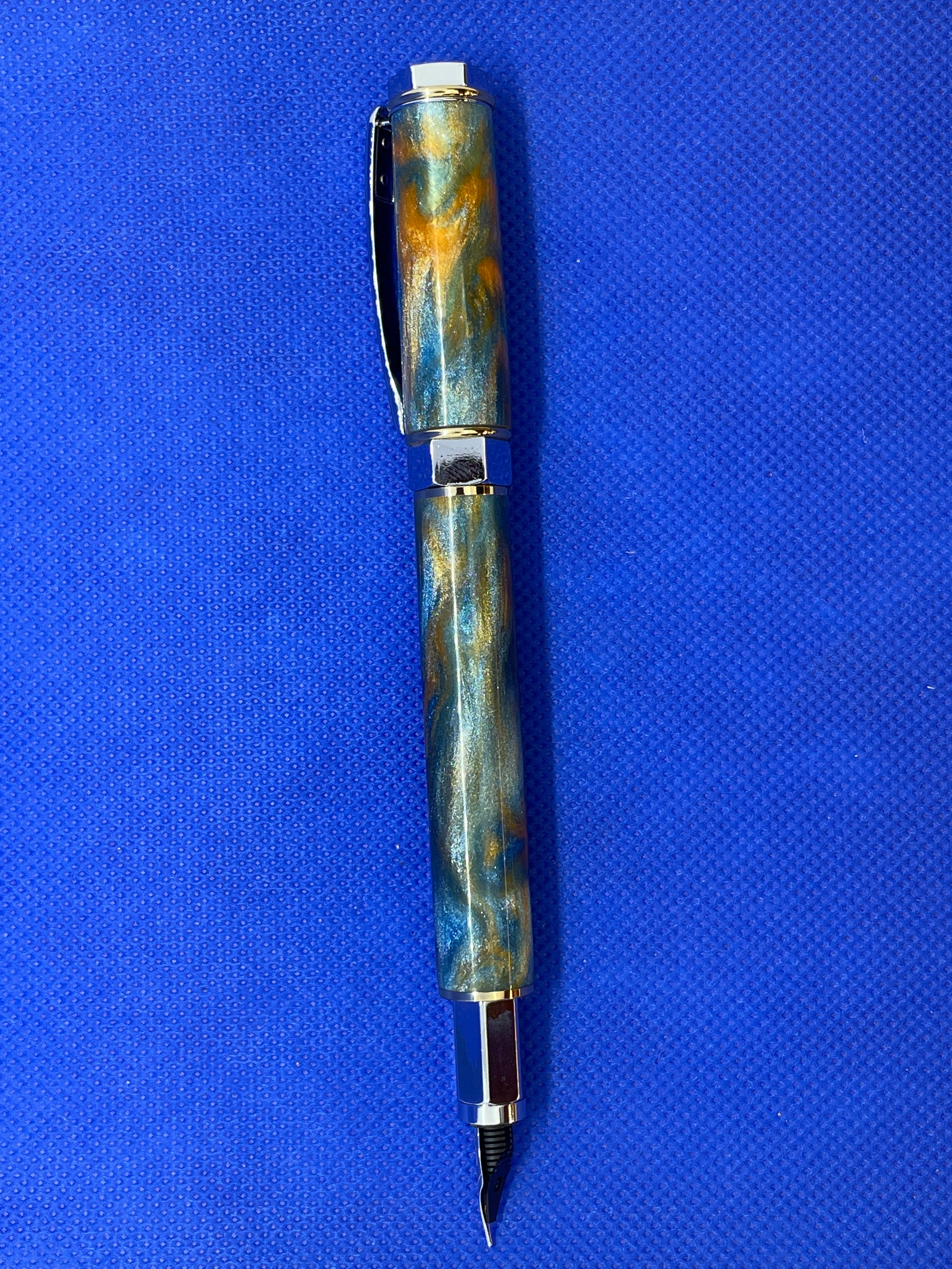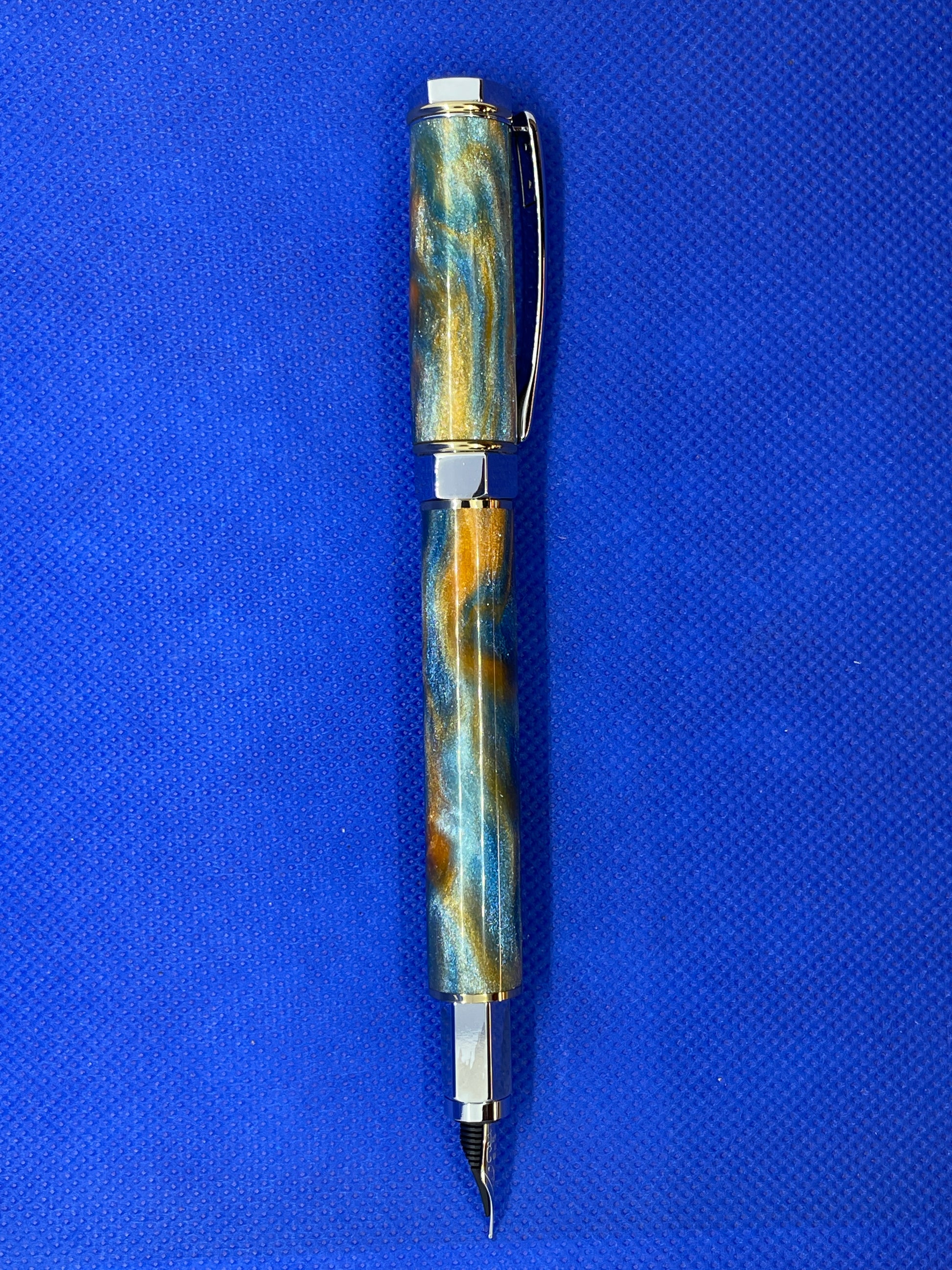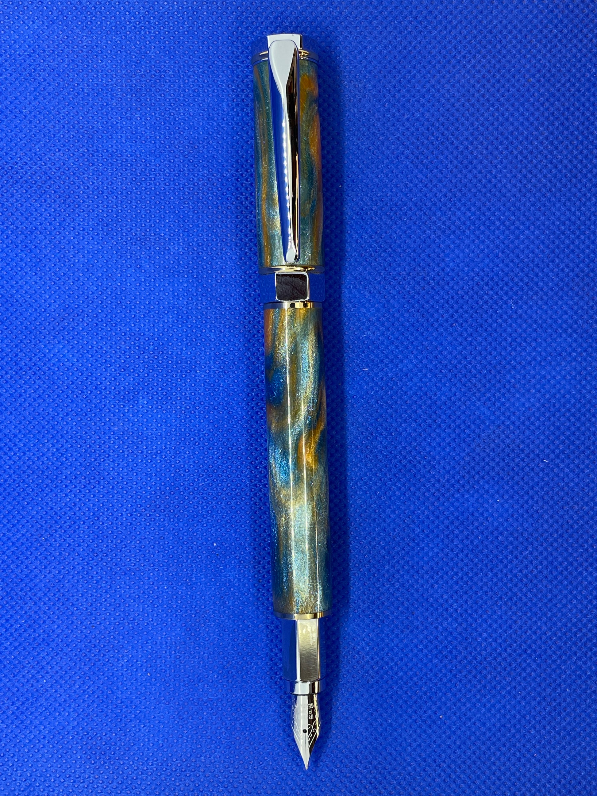 This Vertex Supreme fountain pen features chrome and gold trim and a DiamondCast " Blue Macaw" body. It also has a magnetic cap that posts instantly and easily on the nib and pen end.