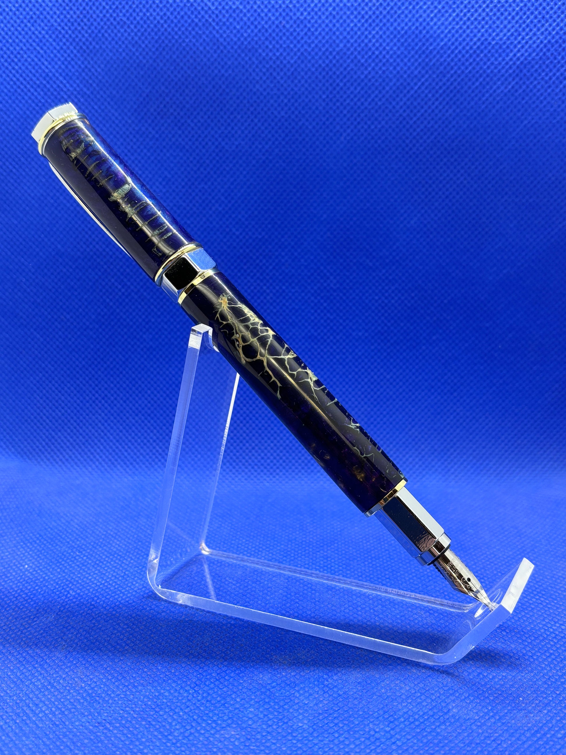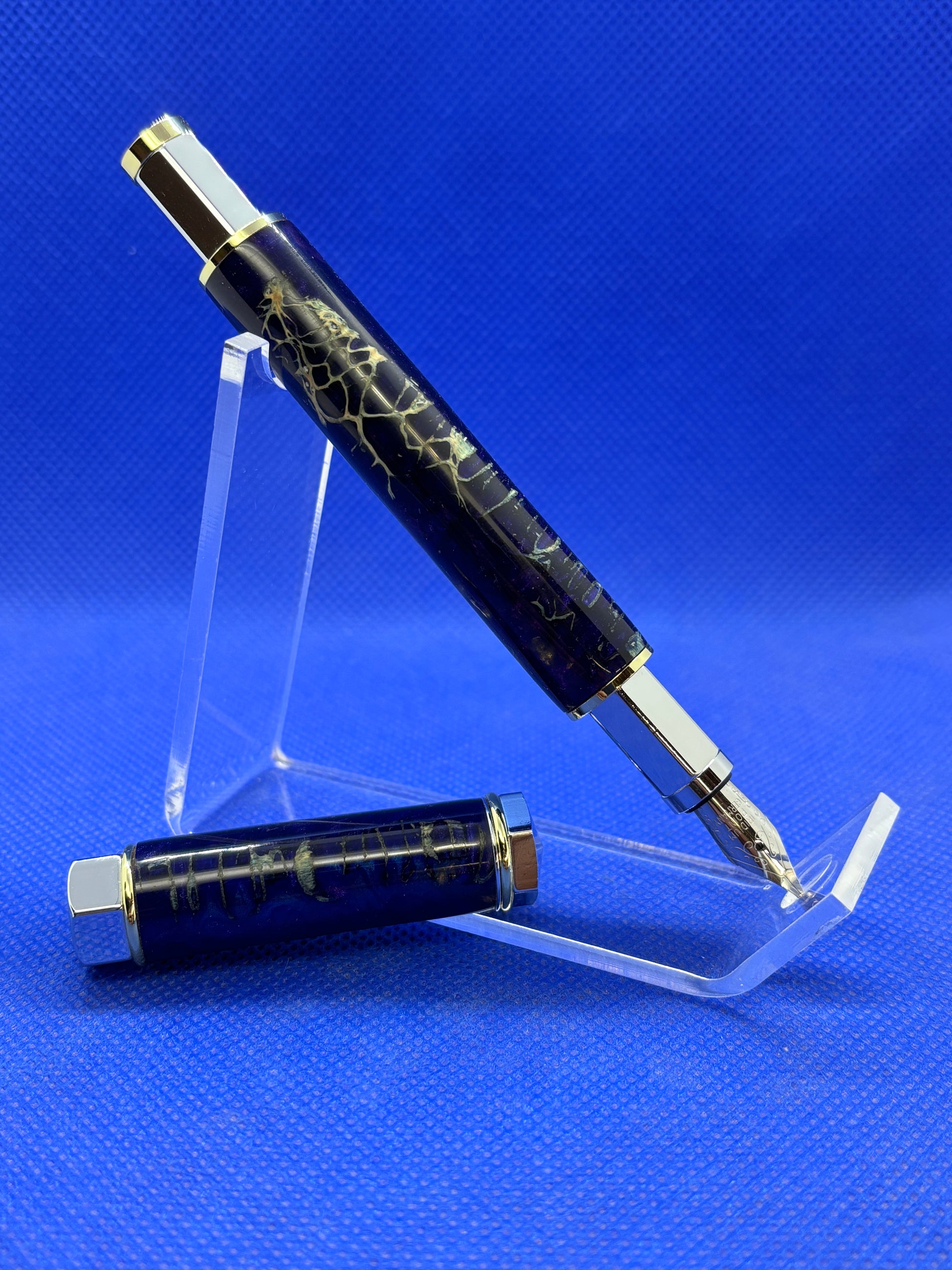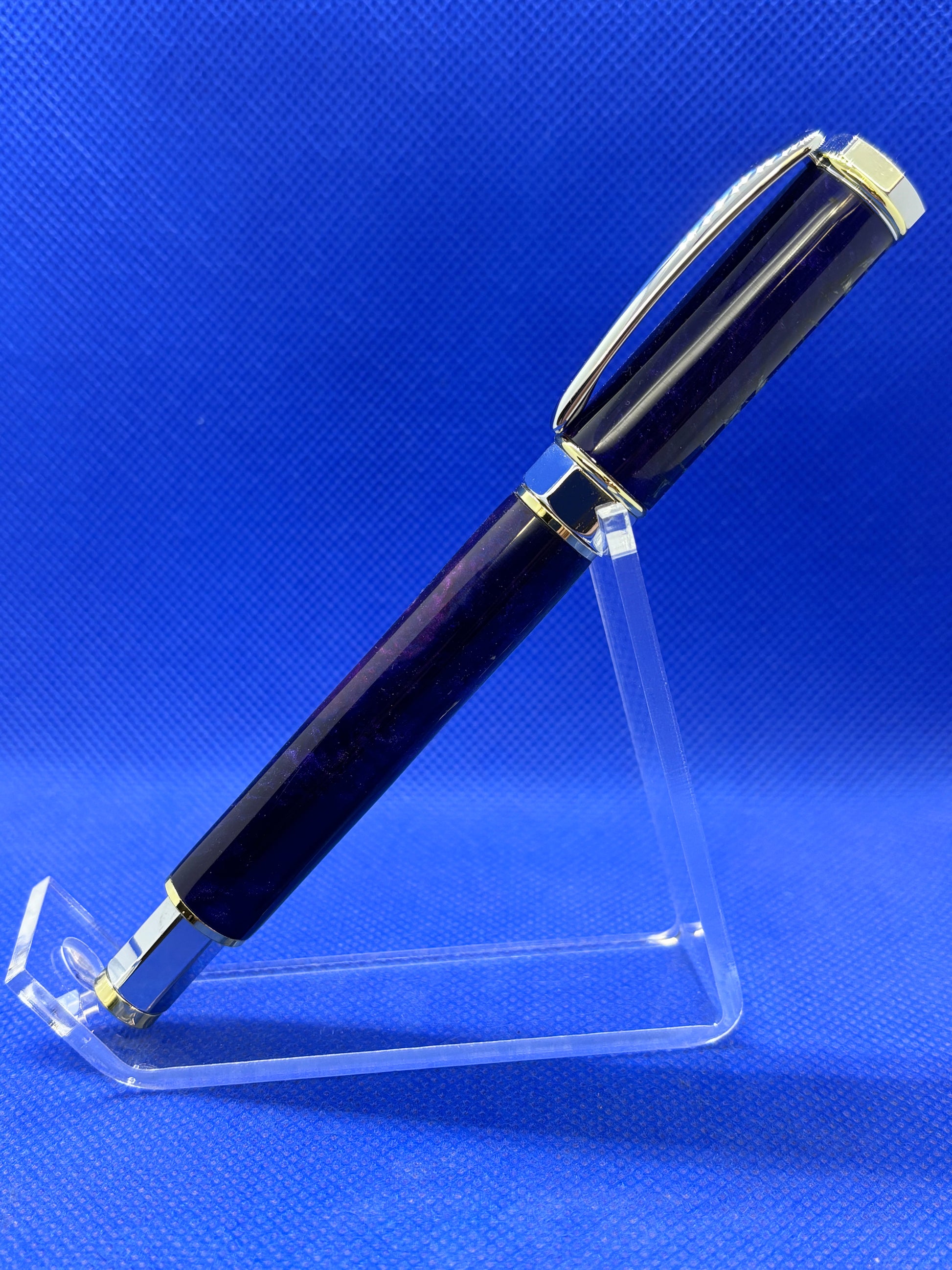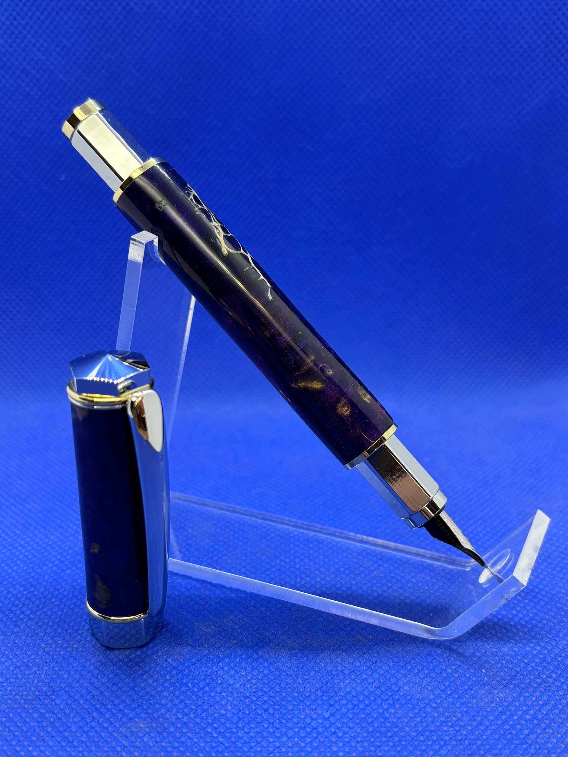 This Vertex Supreme fountain pen features chrome and gold trim and a unique body made from purple resin with embedded, dyed cactus. It also has a magnetic cap that posts instantly and easily on the nib and pen end. This pen uses either universal ink cartridges or the included ink pump for refilling from an ink bottle.