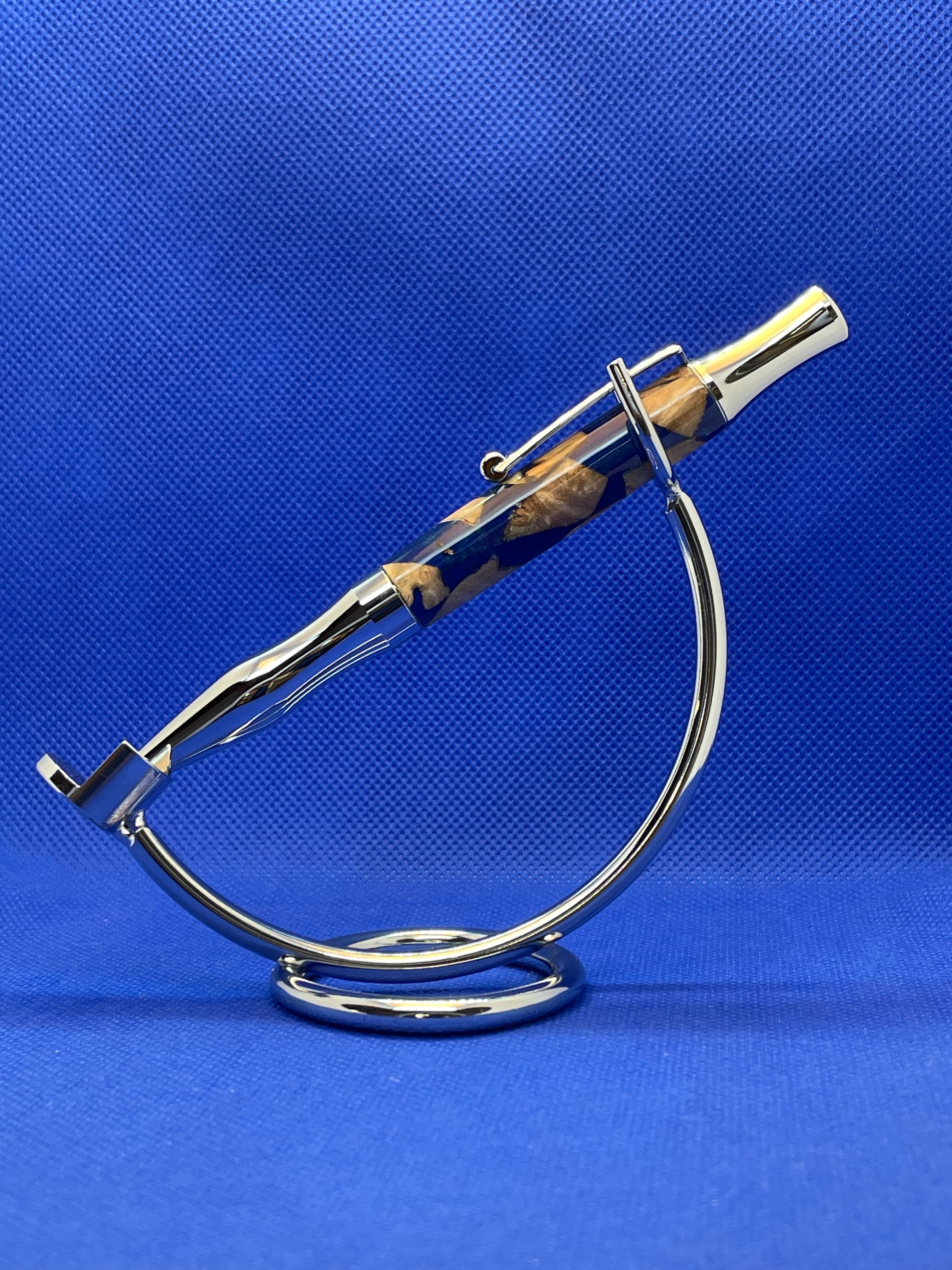 This Virage twist ballpoint pen features chrome trim and a maple burl and blue acrylic resin hybrid body. The hybrid body makes this pen a real statement piece. This pen uses standard "Parker" style refills