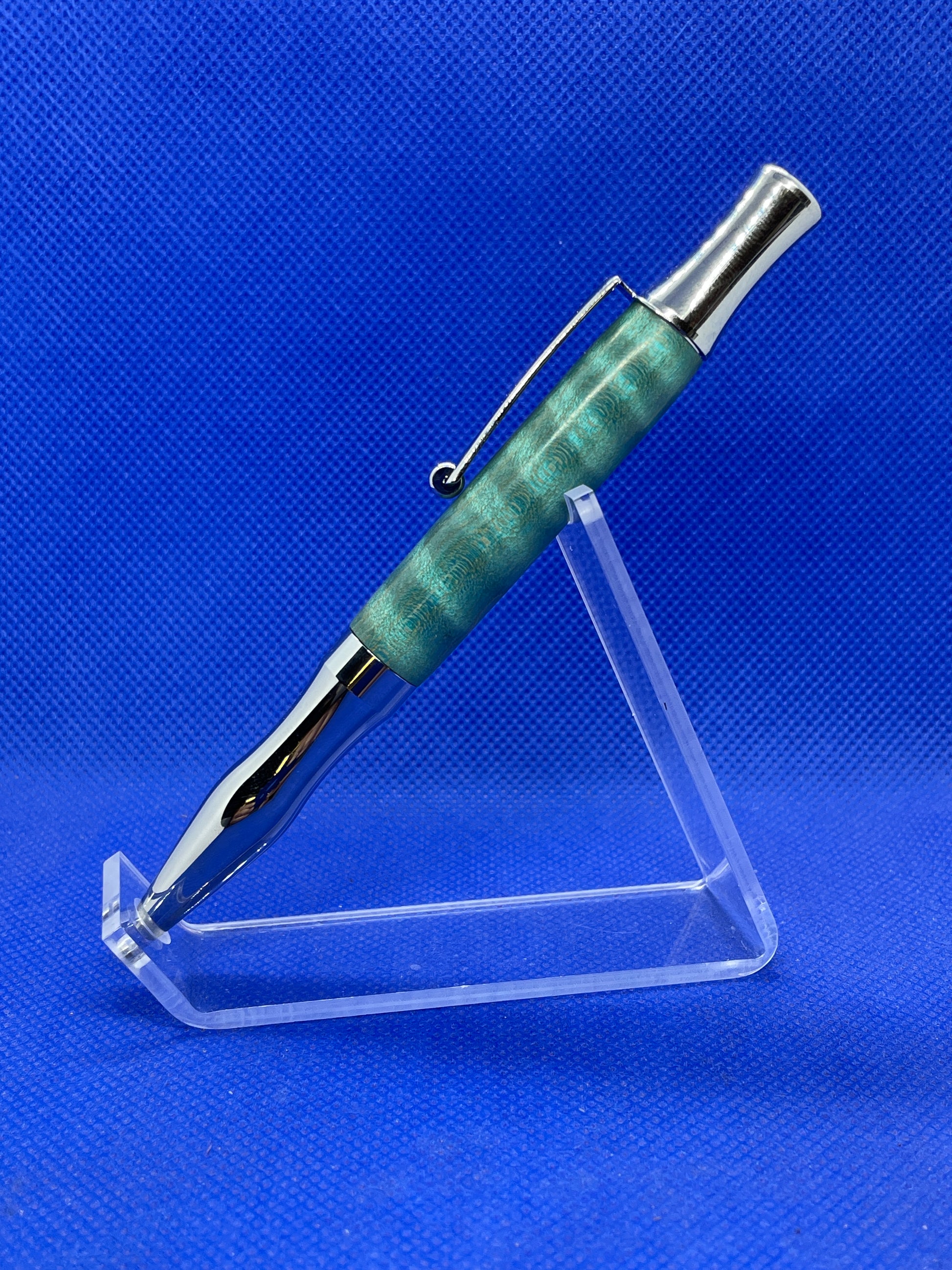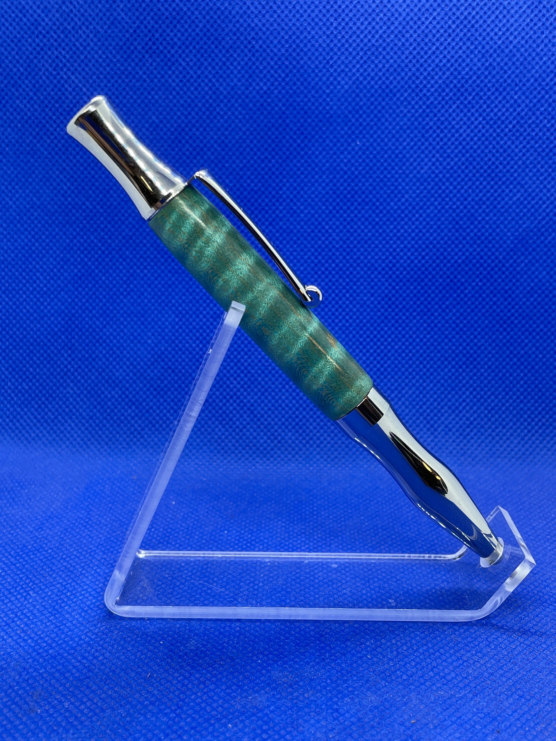 This Virage twist ballpoint pen features chrome trim and a "Ocean Blue" curly maple body. This pen uses standard "Parker" style refills