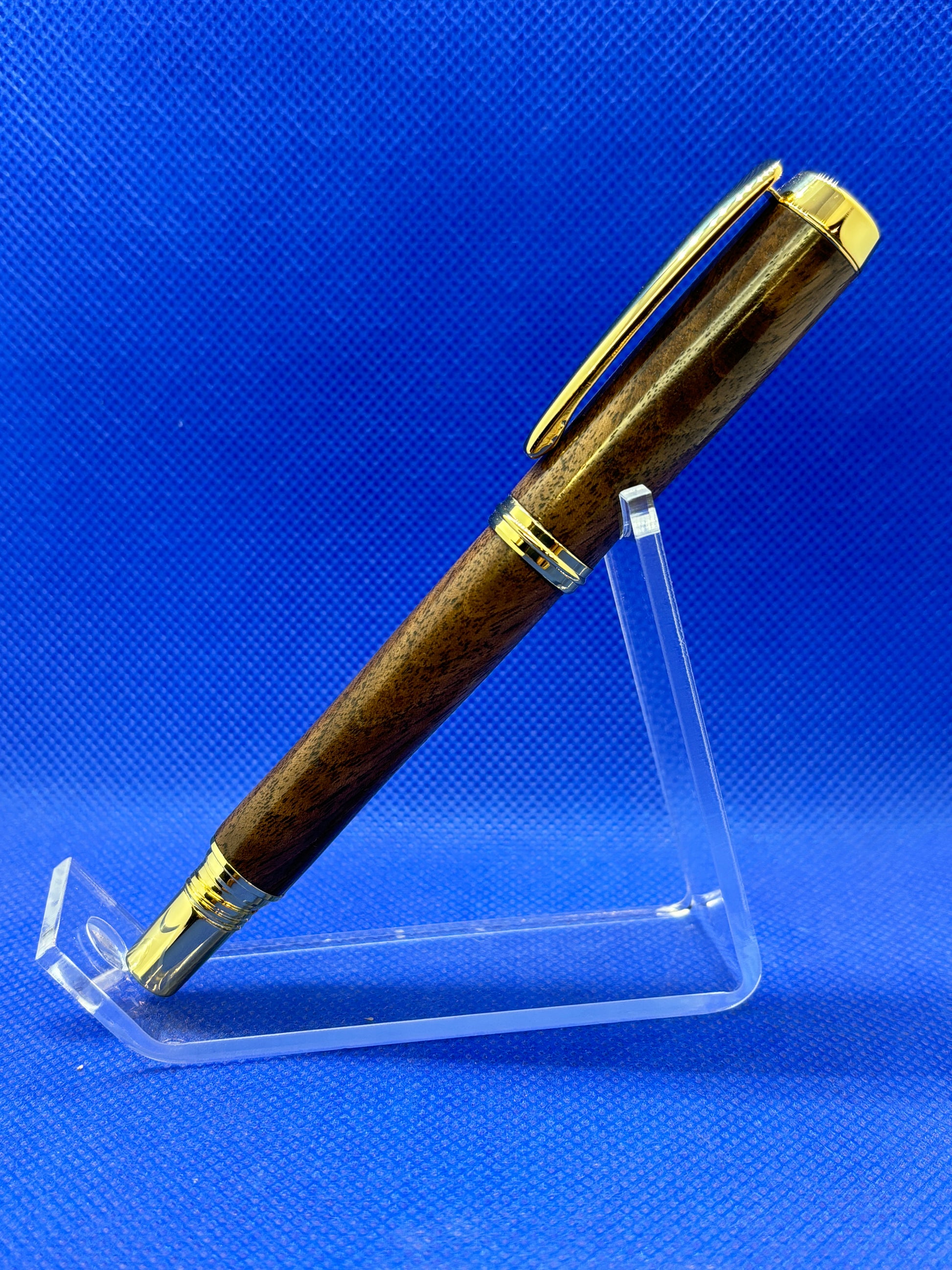 This beautiful fountain pen features a beautifully figured dark walnut body and gold trim. This is stunning pen that uses either universal fountain pen cartridges, or an included ink pump for filling from an ink bottle.