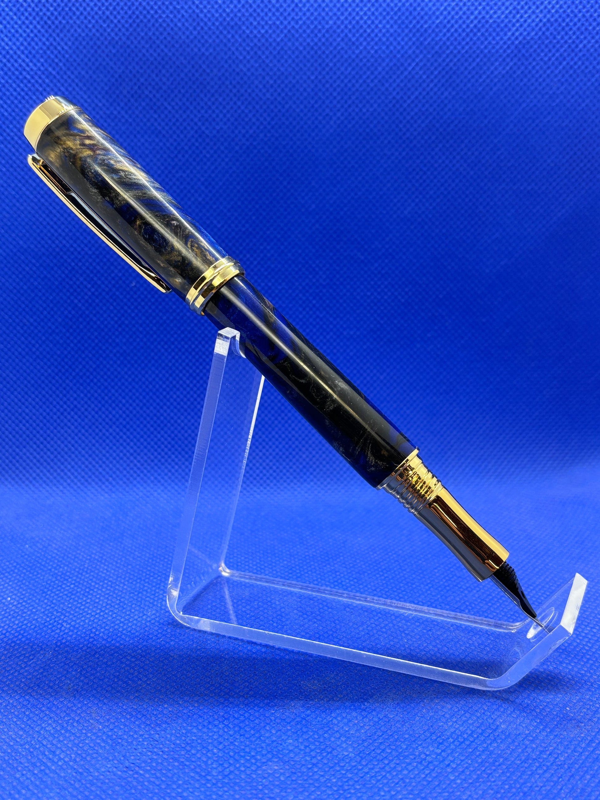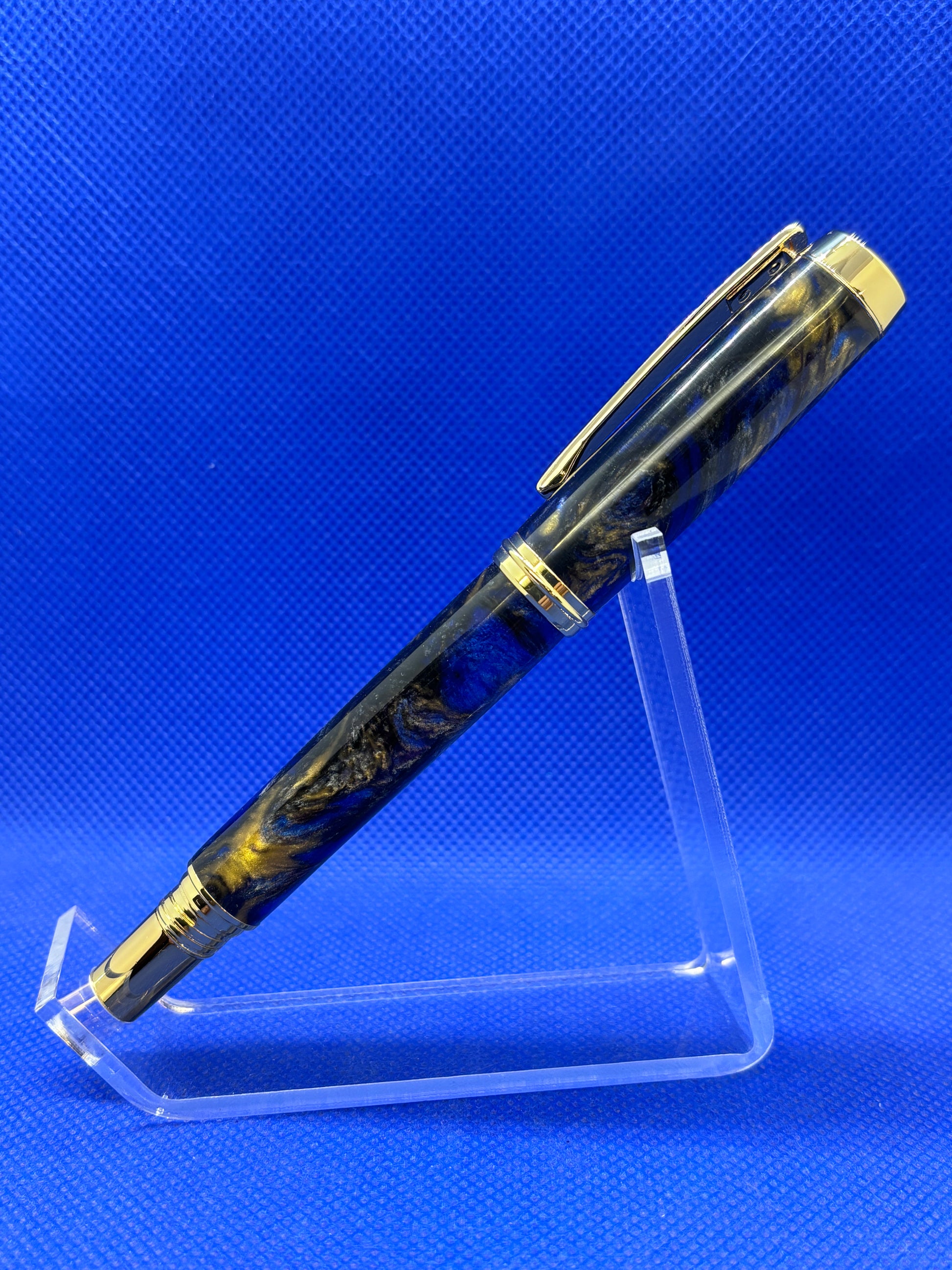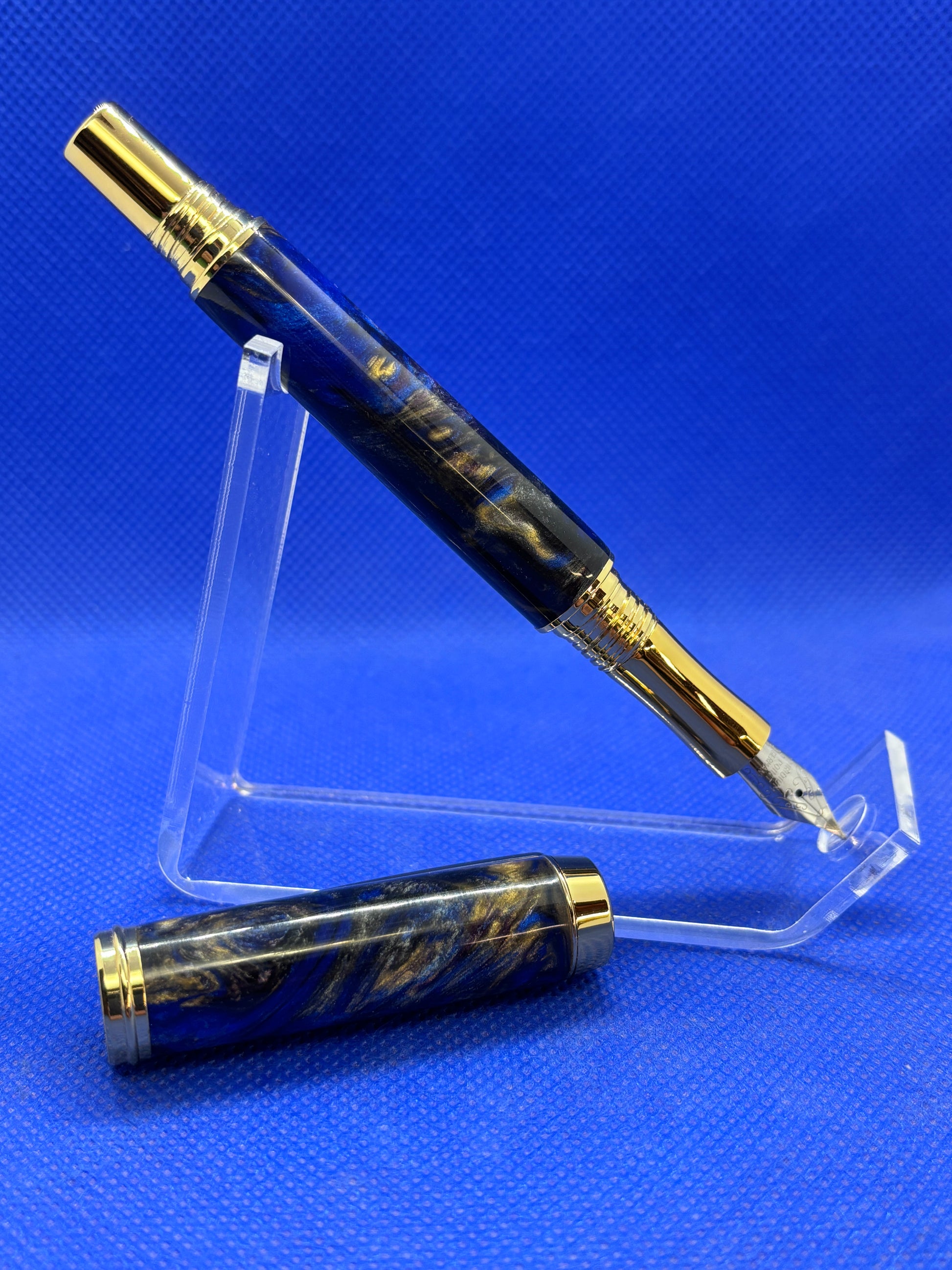 This Wilfred fountain pen features a rich "Sapphire and Gold" resin body with gold metalwork. This is a stunning pen that uses either universal fountain pen cartridges, or an included ink pump for filling from an ink bottle.